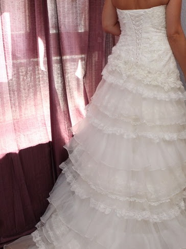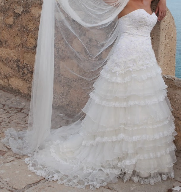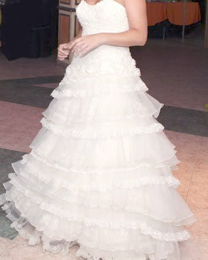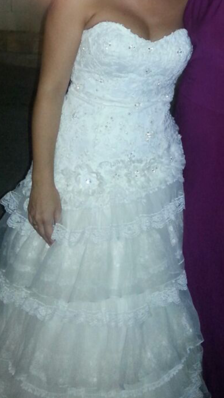 Es una talla 42,pero yo uso la 38 y me modificaron el escote de palabra de honor a corazón. En la zona del cuerpo tiene detalles en forma de flores con brillantes y el la zona de cadera hace como un cinturón que te estiliza mucho la figura. Debajo de la falda tiene para poder engancharla a la mano y que no te moleste en el baile. En el precio incluye el velo y el cancán. Interesadas llamar al 675762565