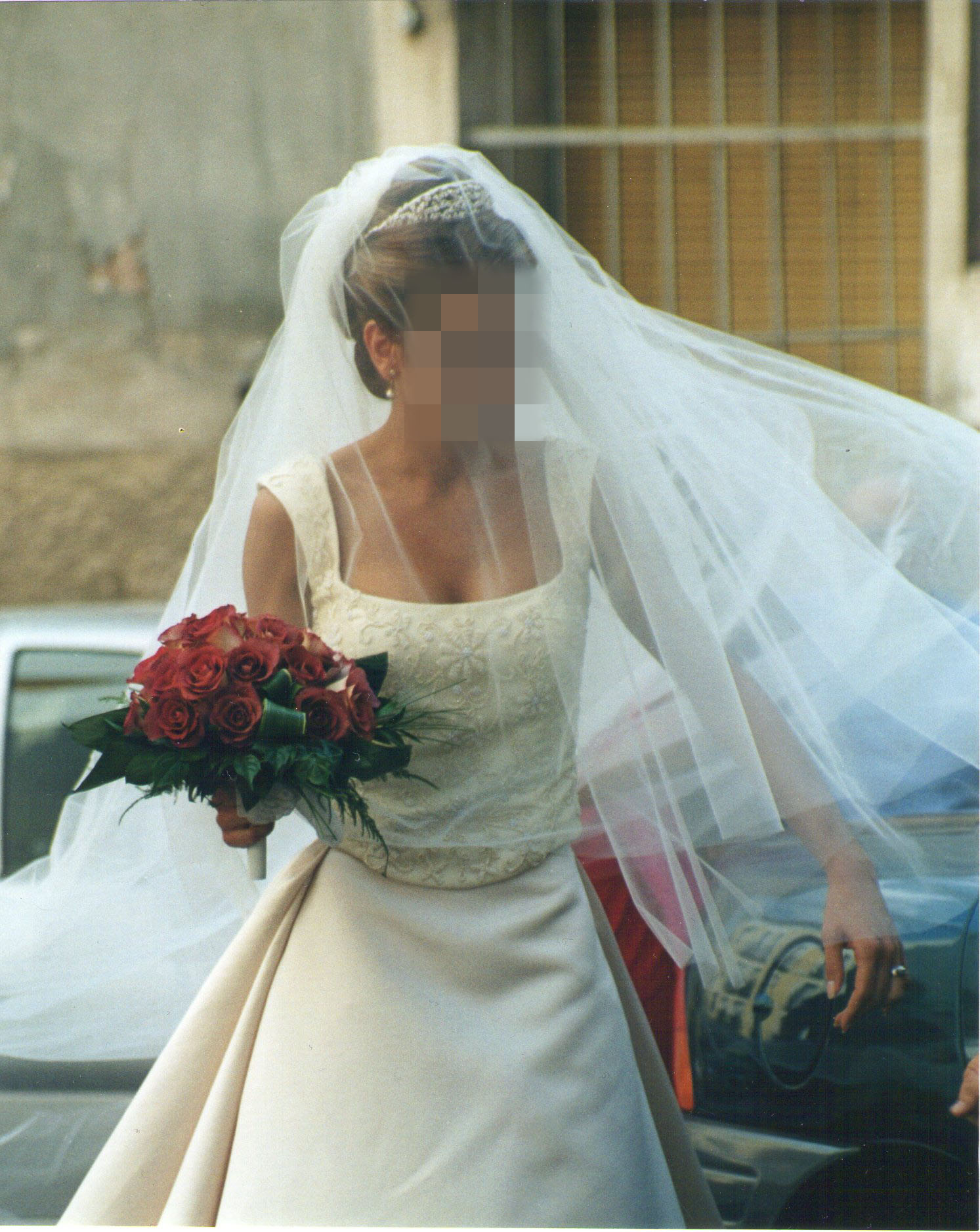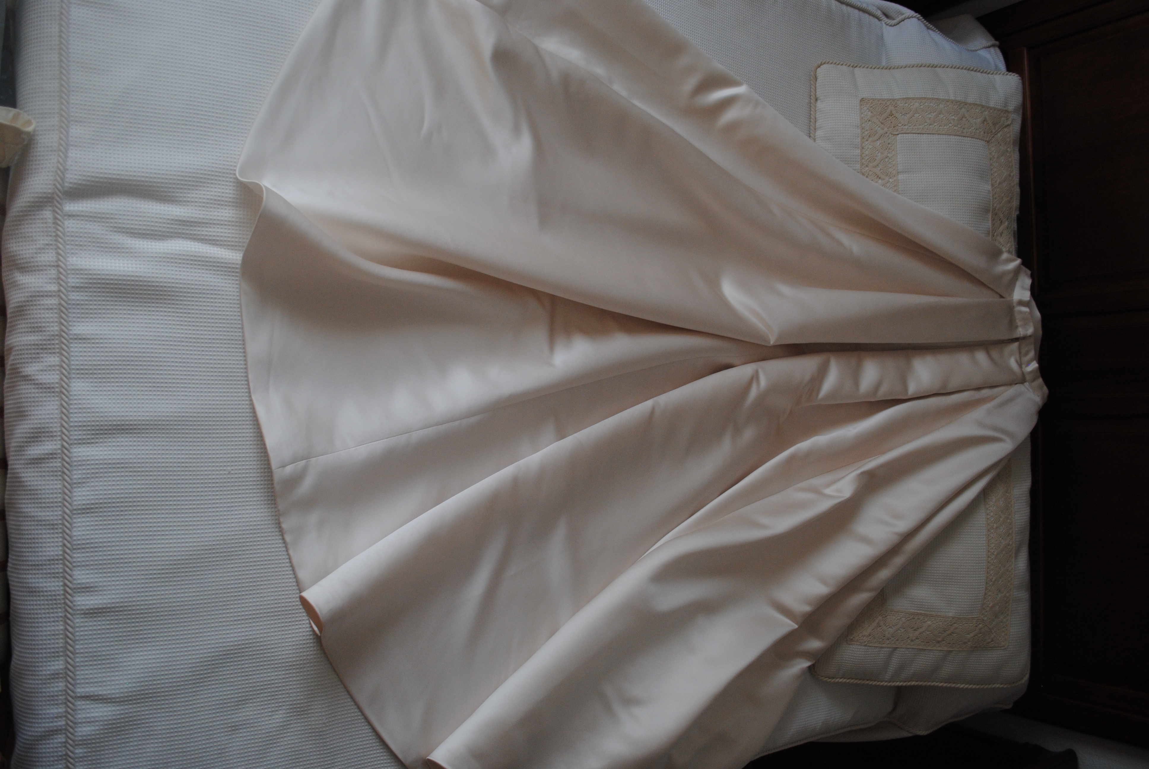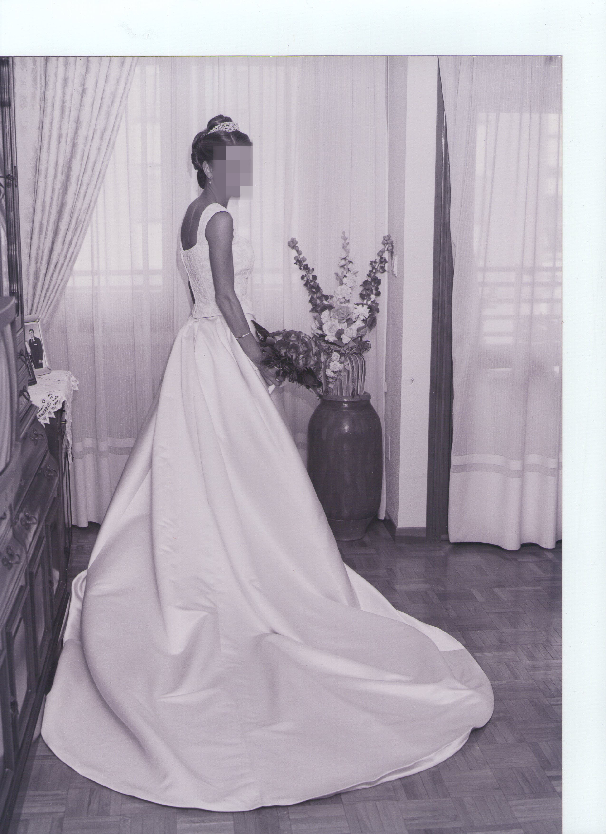 La Falda tiene un poco de cola y encima de la falda lleva una cola sobrepuesta de tres metros que se puede quitar.