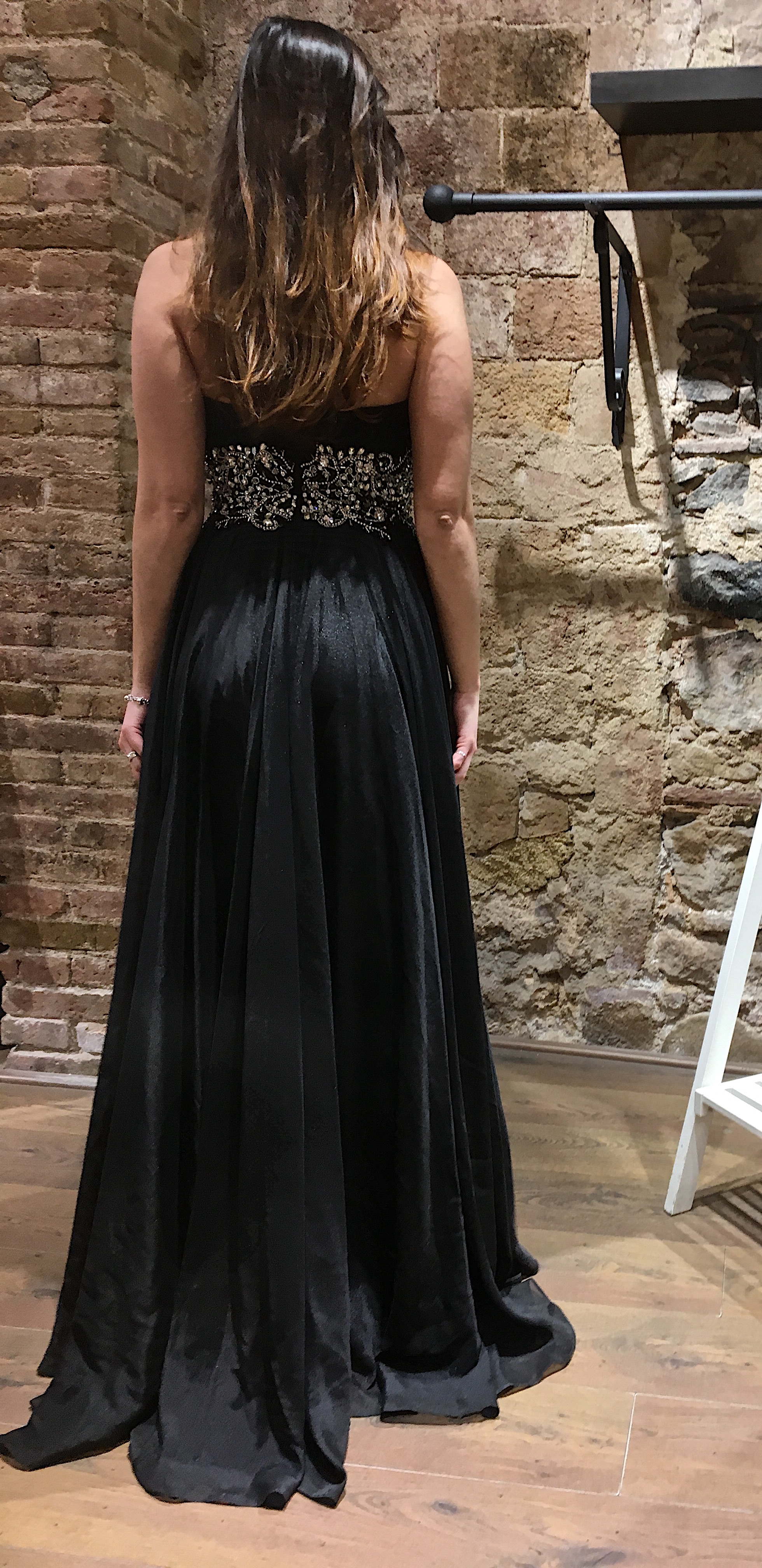 El vestido es de fiesta strapless en forma de corazón, color negro con pedrería adjuntada a la parte posterior del vestido enmarcando el area del busto. El vestido tiene una caída que fluye de manera muy natural, además la tela brilla de una manera muy sutil. Es una talla 4 es decir 36 en España y es de la marca americana Terani Couture, esta es una marca de fama mundial que se ve en las páginas de publicaciones importantes como Teen Vogue, Seventeen (revista estadounidense), Teen Prom y Prom Girl. Los vestidos de Terani Couture se usan en muchos eventos de la alfombra roja, incluidos los Oscar y los Tony Awards. El vestido ha sido usado 3 veces y esta en excelente estado además viene incluído un chal de color negro con detalles de pedrería en las puntas. Quedo a disposición para cualquier duda/aclaración sobre el vestido. :)