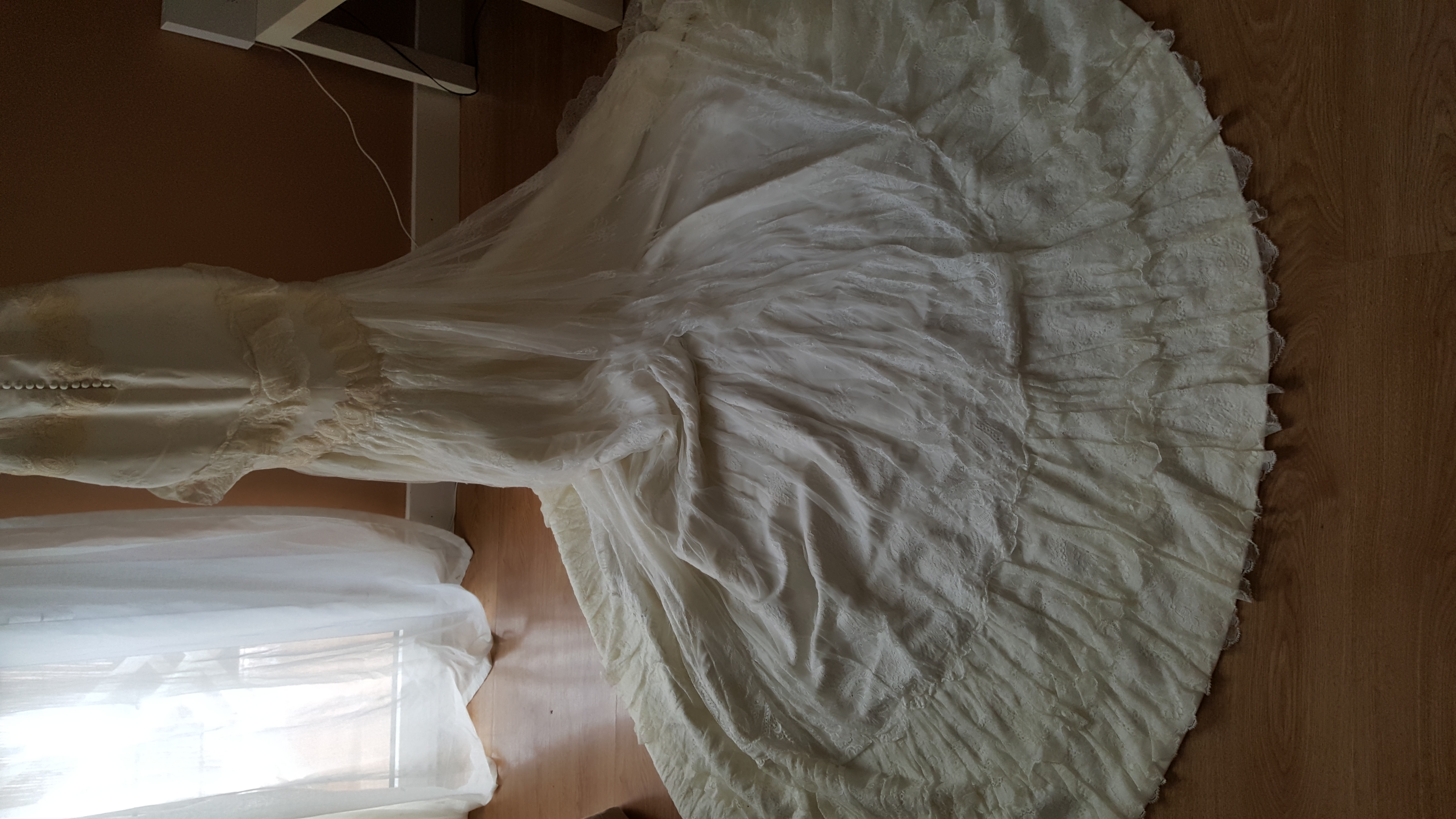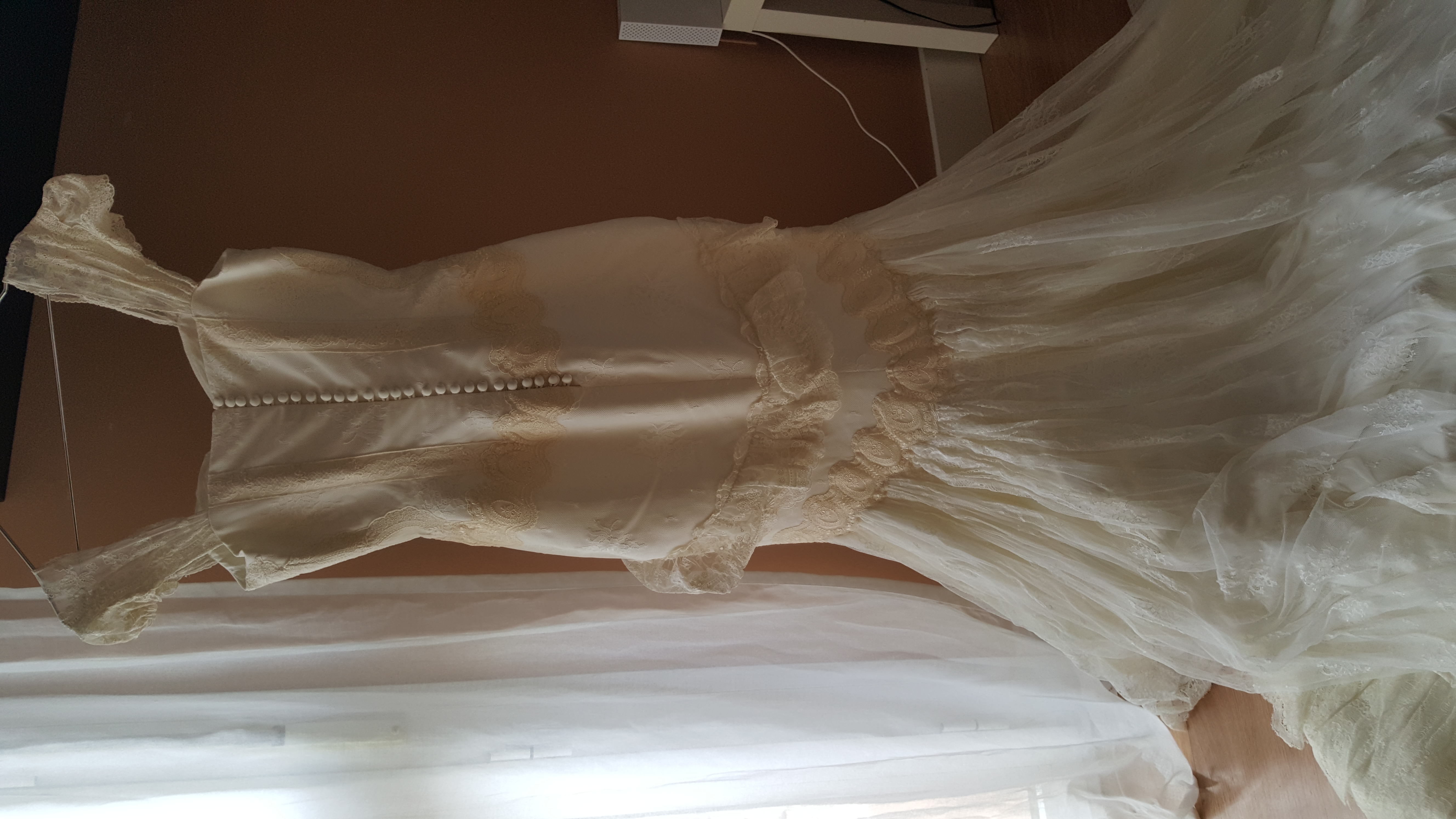 Diseño exclusivo de un prestigioso diseñador de Sevilla, precio real 4.000€, de un solo uso,perfecto estado,regalo velo de 4 metros con encaje al rededor, la cola es de 2 metros,el traje tiene varios tejidos,mejor verlo y se puede probar sin compromiso.