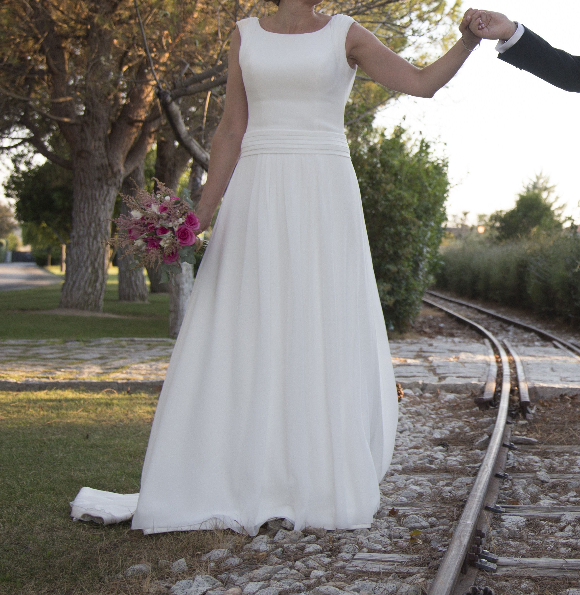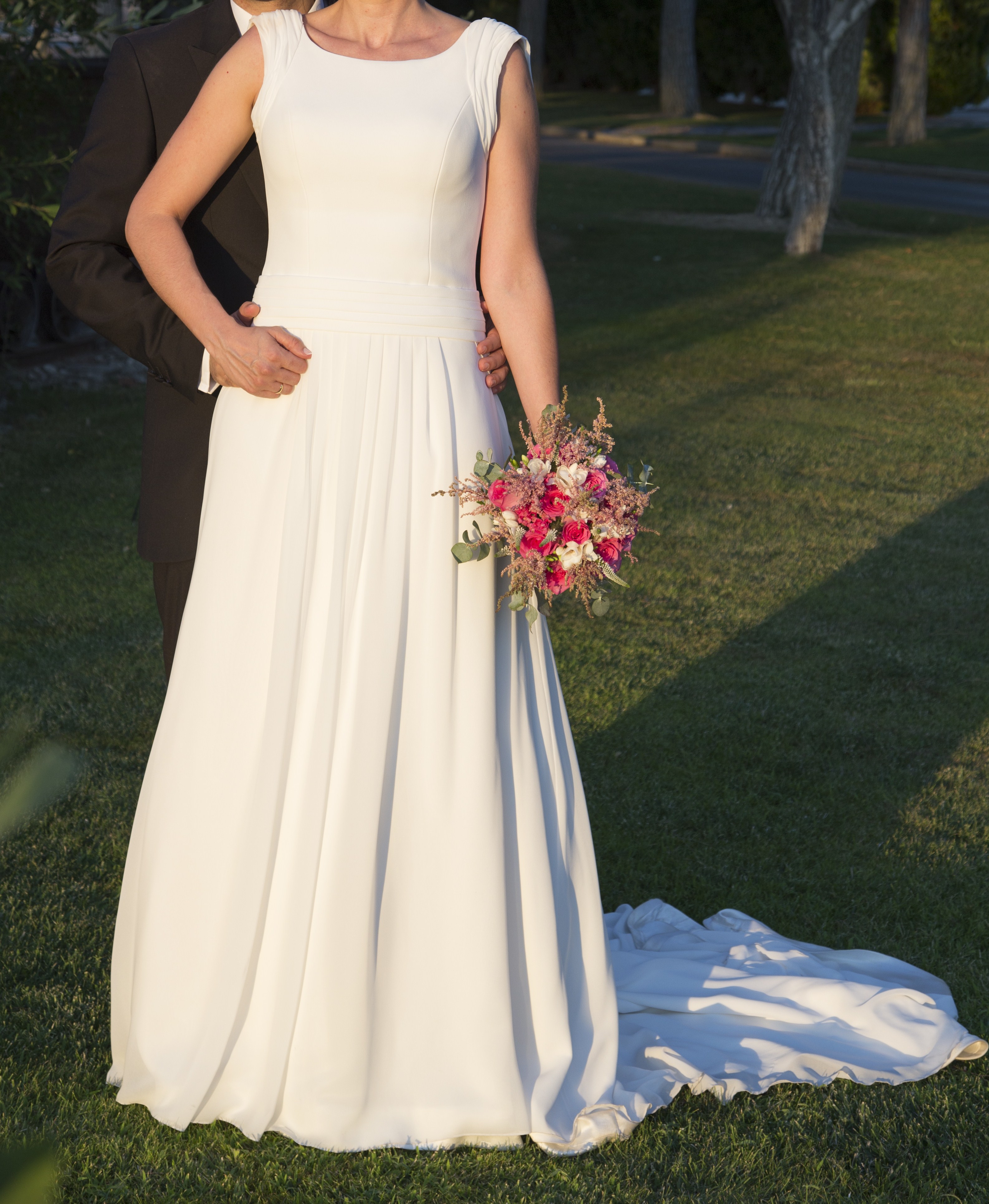 Espectacular vestido de Valenzuela Majadahonda. Muy sencillo pero elegante. Las telas que lo componen son creppe y georgette de seda. Cola de un metro (se puede recoger), ligero y muy fácil de llevar. Talla 40-42. Hecho a medida, puesto una sola vez y en perfecto estado. Limpio de tintoreria. En el precio esta incluido el cancán el cual esta cosido al vestido. Espalda en V, con caídas de tela y pequeño ribete de encaje. Altura de la novia con tacones 1,80 aprox. Mejor verlo y probarlo.