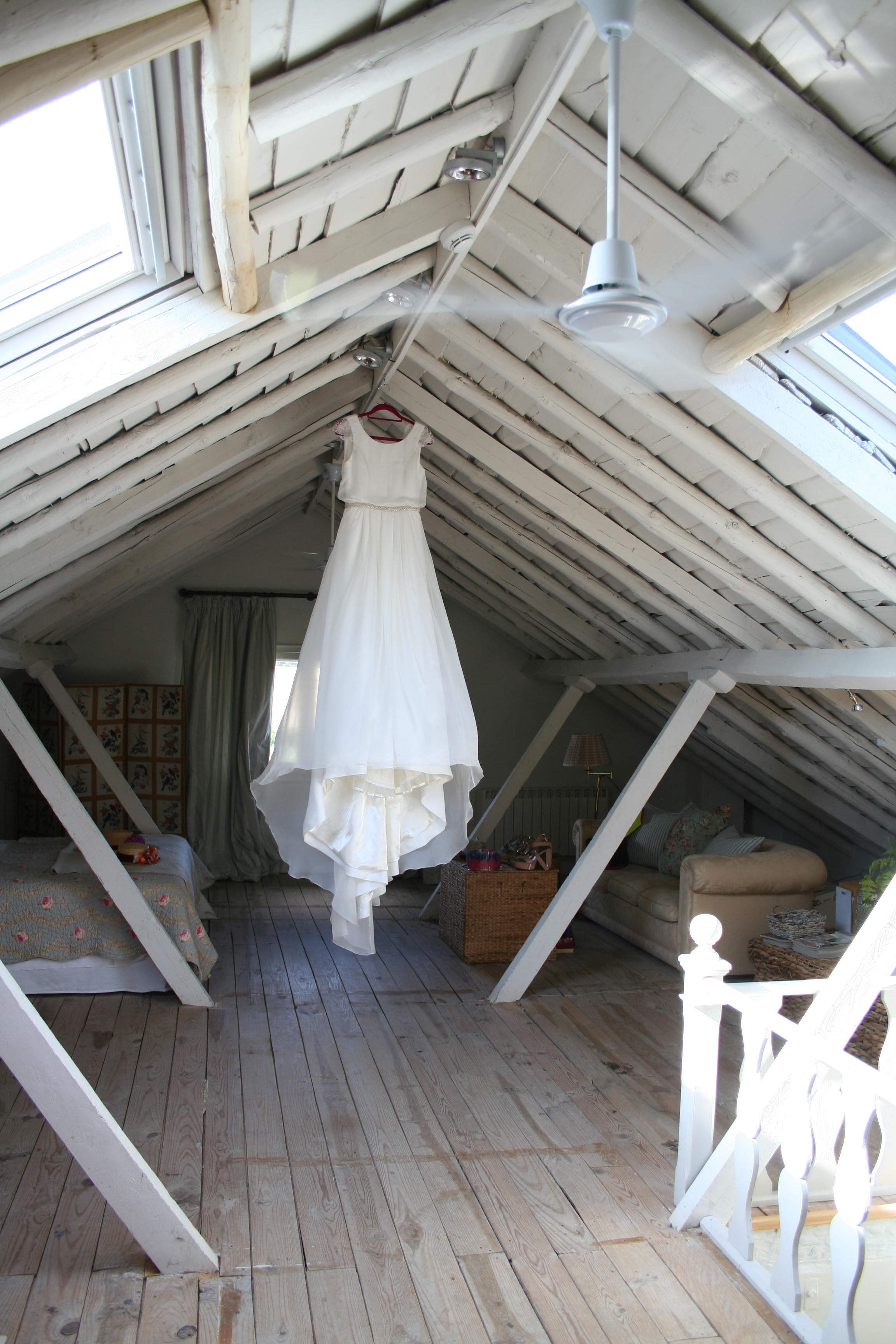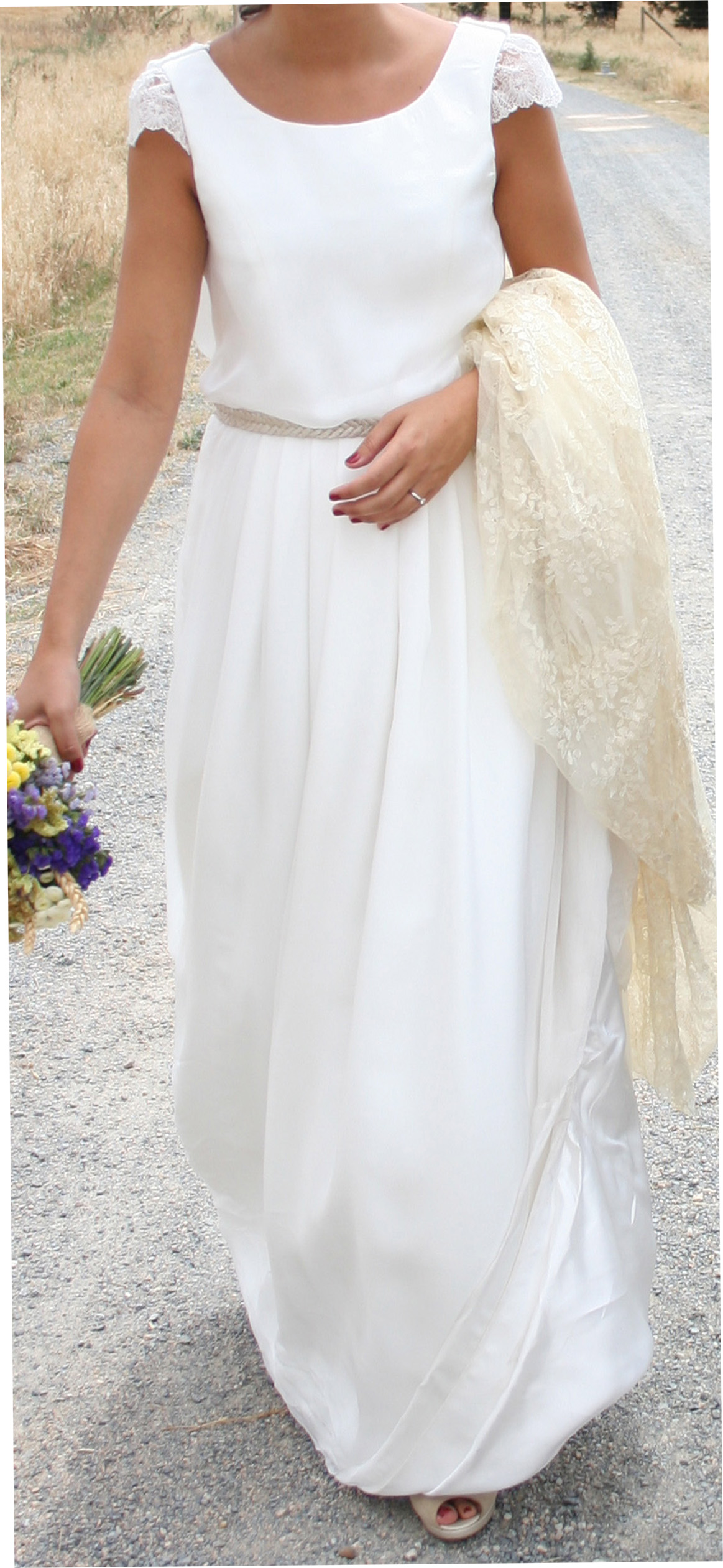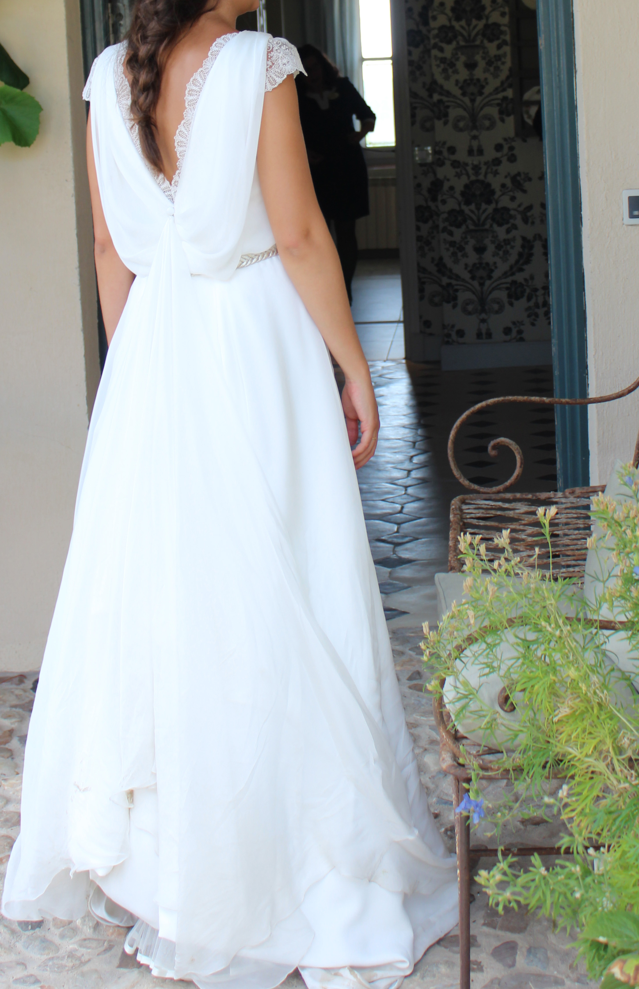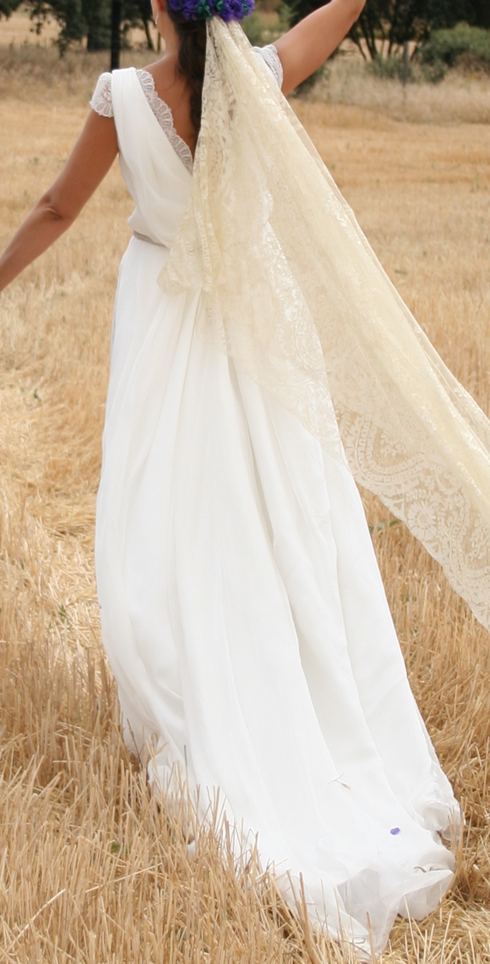 El vestido es de Julio. Es de gasa, parte de arriba abusada, espalda en V con encaje, igual que las mangas, y gasa caida. Botones de novia. Tiene un cinturón trenzado de color champan.
