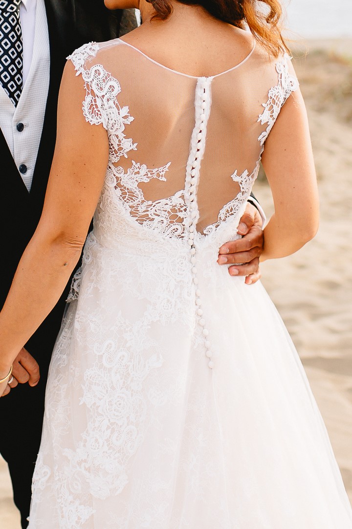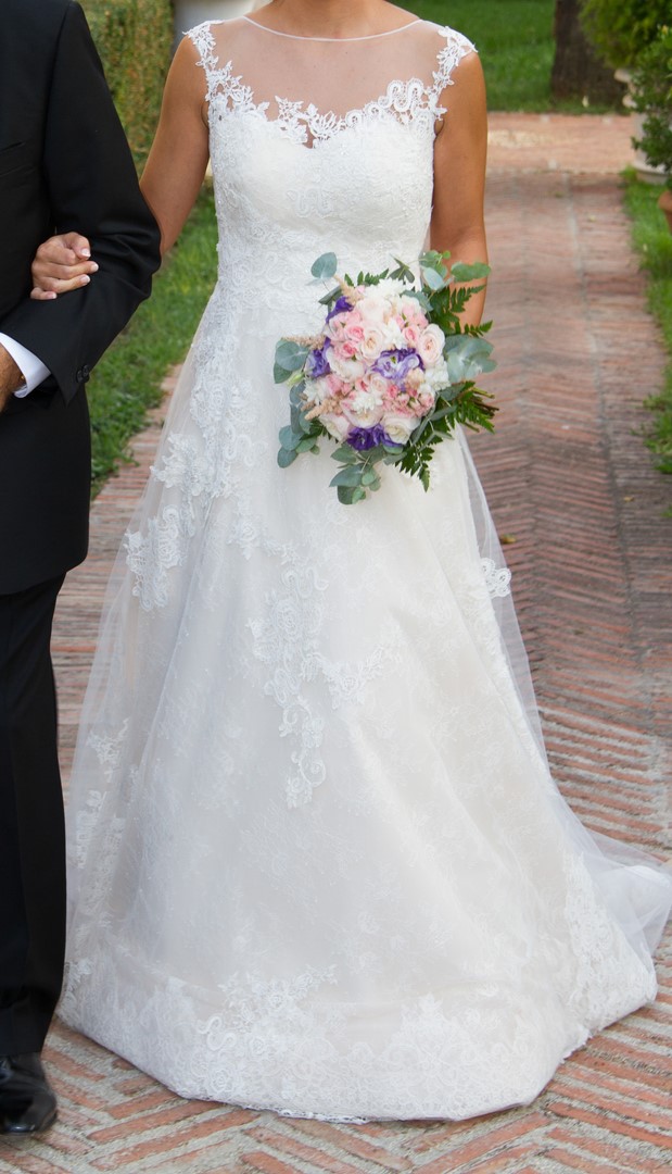 Fabuloso vestido de encaje blanco, sobre fondo nude con sobrecapa de tul, con aplicaciones de encaje y pedrería.