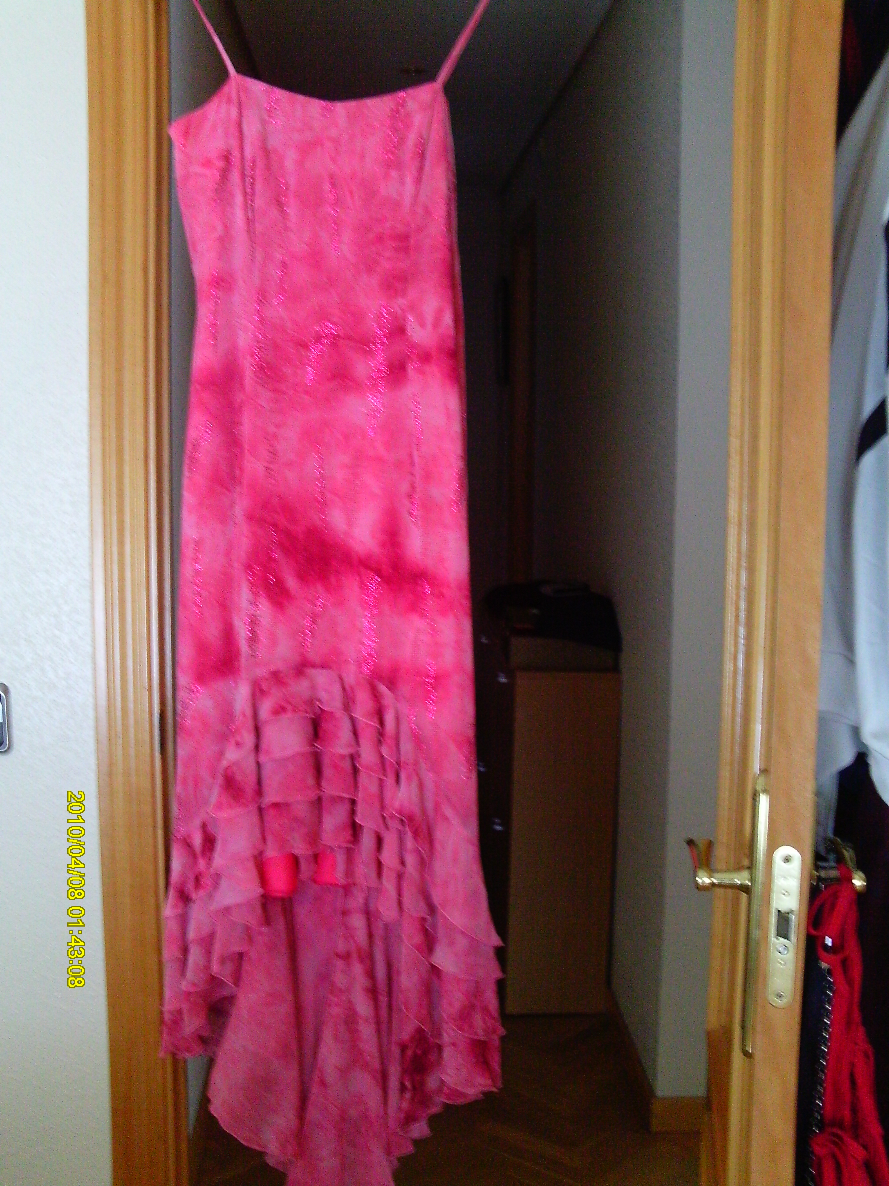 Vestido de fiesta rosa de gasa con incrustaciones de brillantina corto por delante y largo por detrás, caida de la cola en volantes estilo V &L, Escote en corazón con ballenas y tirantes. cremallera invisible en la espalda.