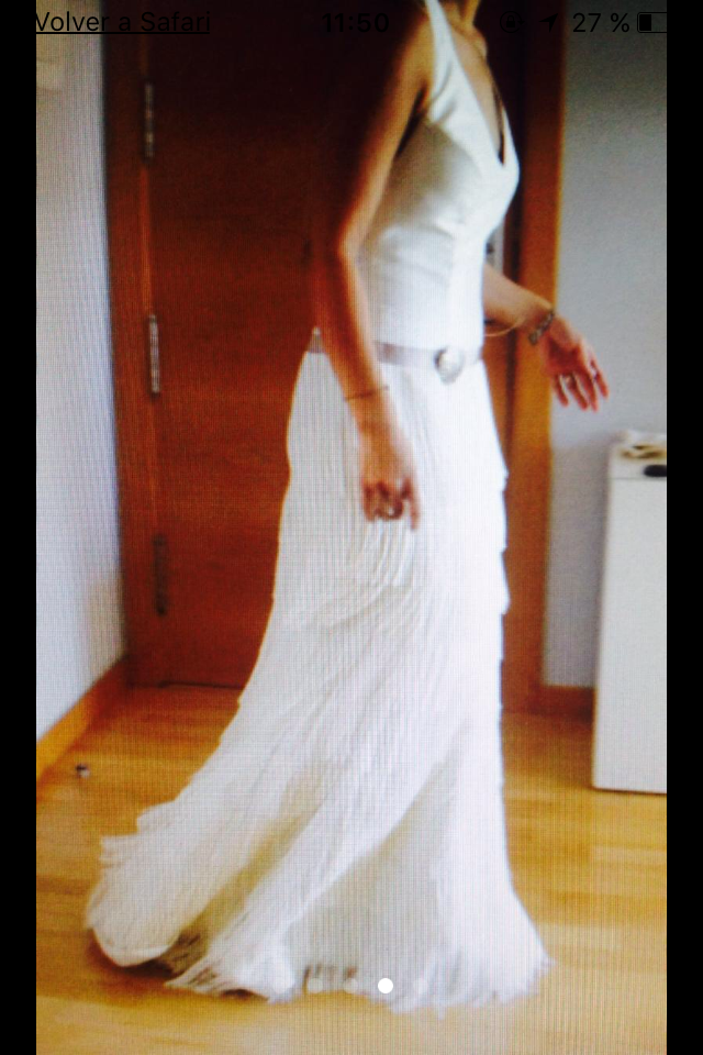 Vestido de novia estilo años 20 con escote en la espalda. El cuerpo del vestido es de seda, va sujeto al cuello y el escote en pico realza el pecho. A la altura de la cadera lleva una cinta con un broche el cual es opcional. La falda son flecos estilo Charleston que al caminar dan un efecto muy bonito. Es un vestido hecho a medida y diseño exclusivo e independiente puesto que fue creado desde cero. Posibilidad de zapatos y complementos (broche y tocado, el cual también fue creado en la misma tela que la cinta siguiendo el mismo estilo) precio rebajado, antes 1000€