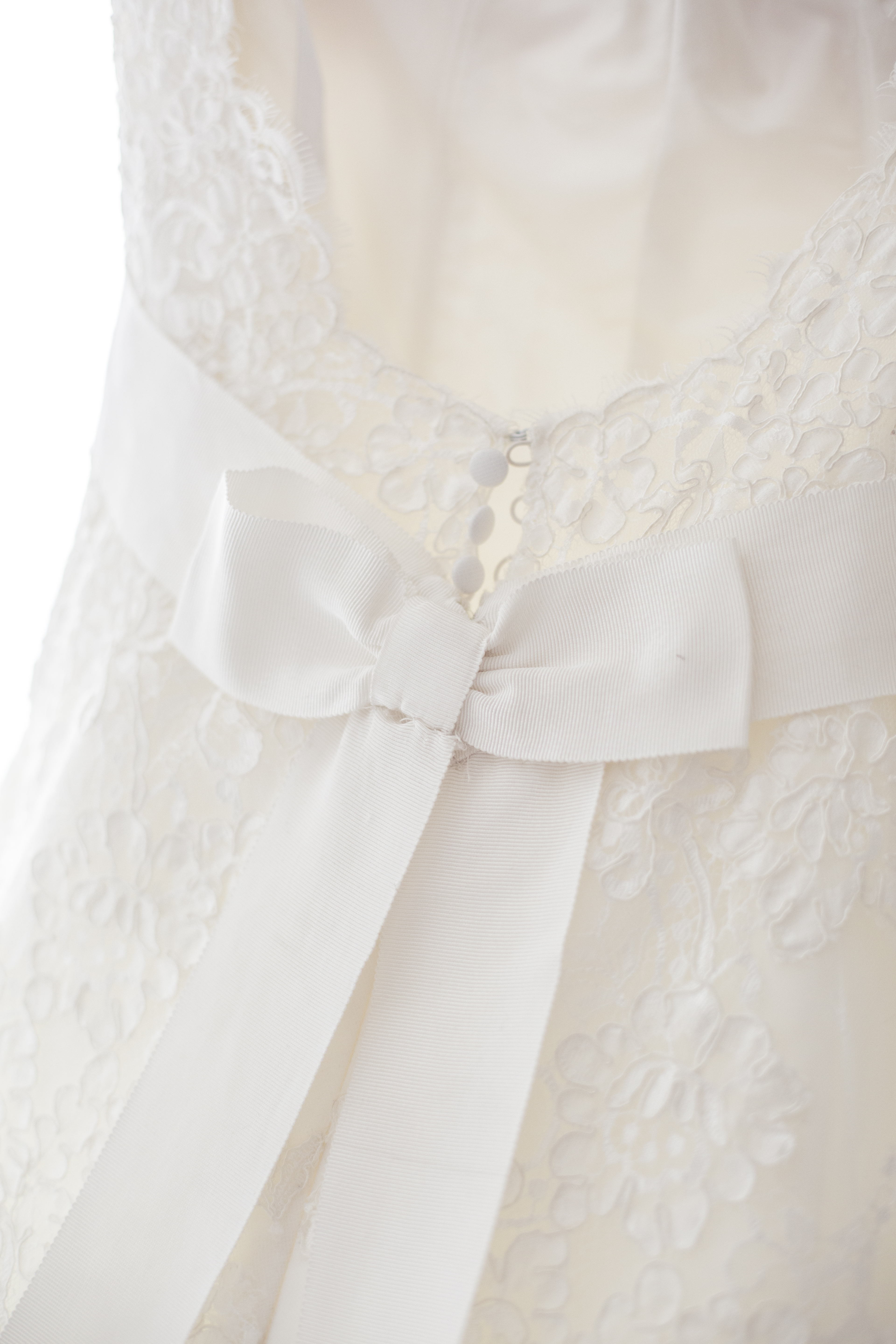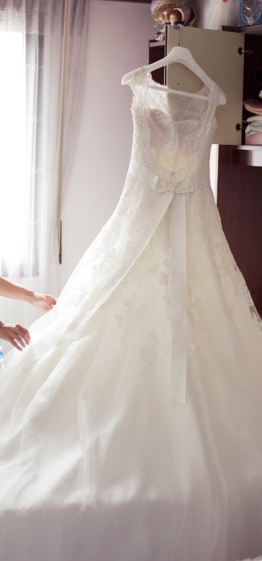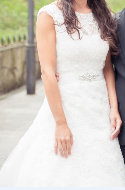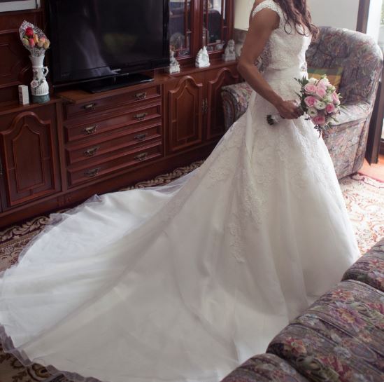 Se vende con cancán y tiara para el pelo. Puesto del día de la boda únicamente. Muy cómodo de llevar, no pesa mucho. Es muy lucido y la espalda al descubierto causa sensación.