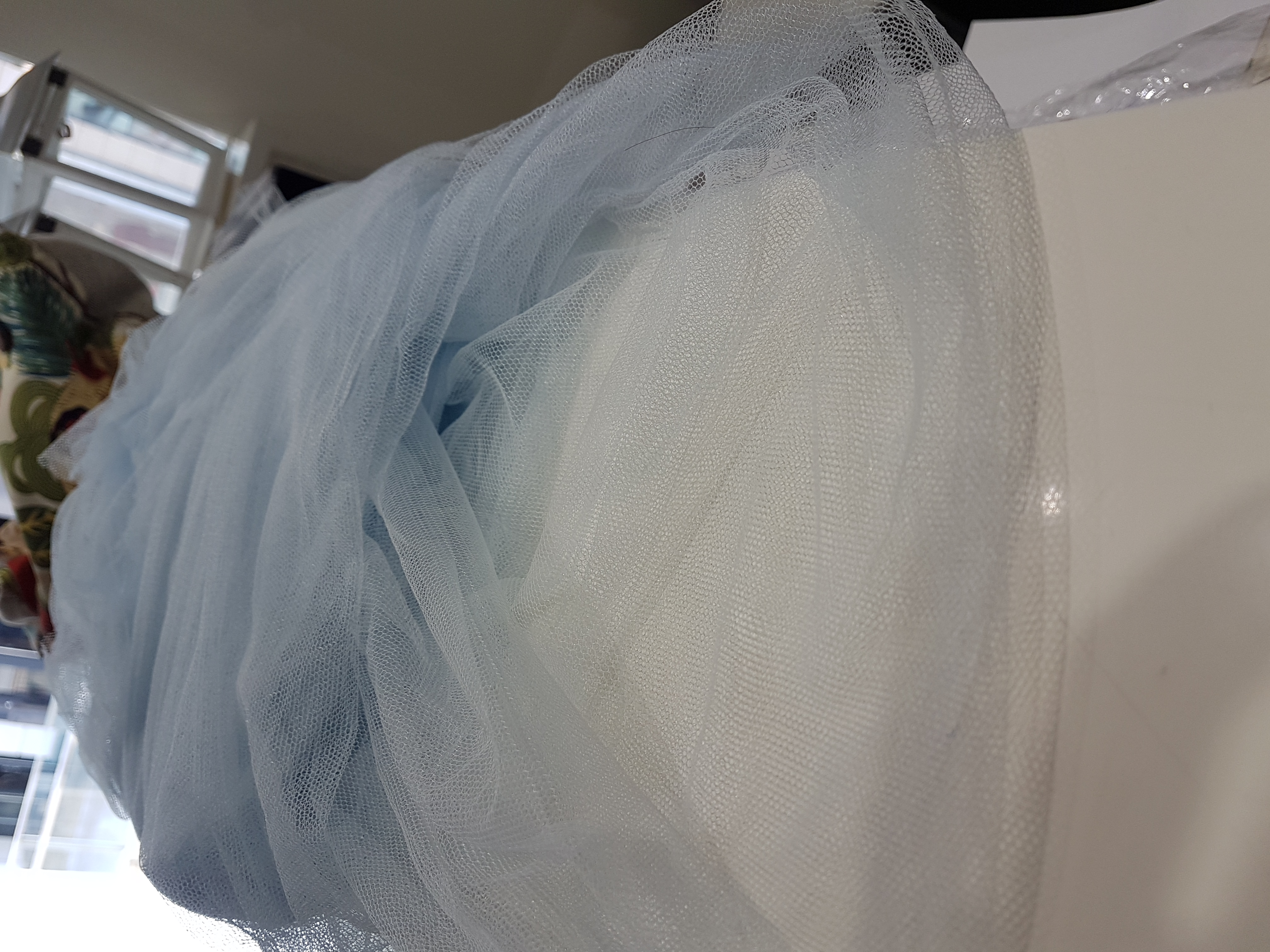 El vestido tiene una pequeña cola. Tened en cuenta que las tallas de estos vestidos no son iguales que las tallas de ropa normal de calle, son tallajes más pequeños, cualquier duda estaré encantada de aclarar . Se regala el tocado y el velo en azul bebé.