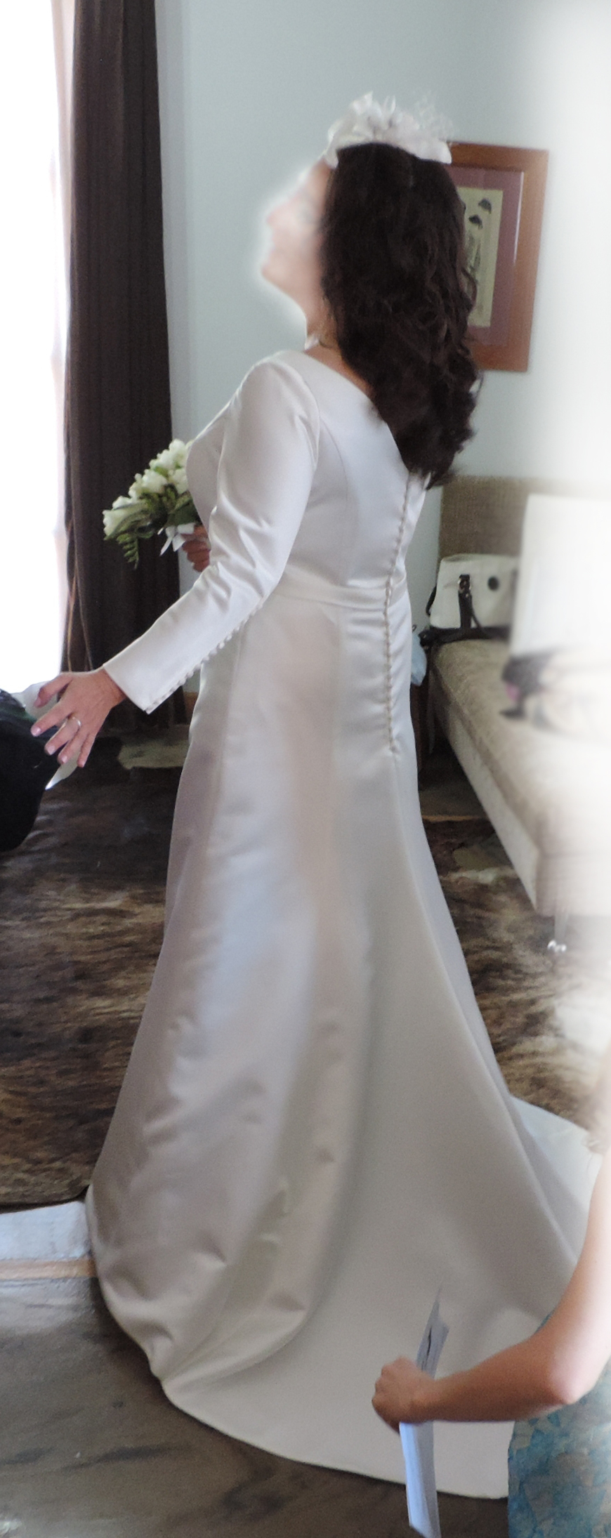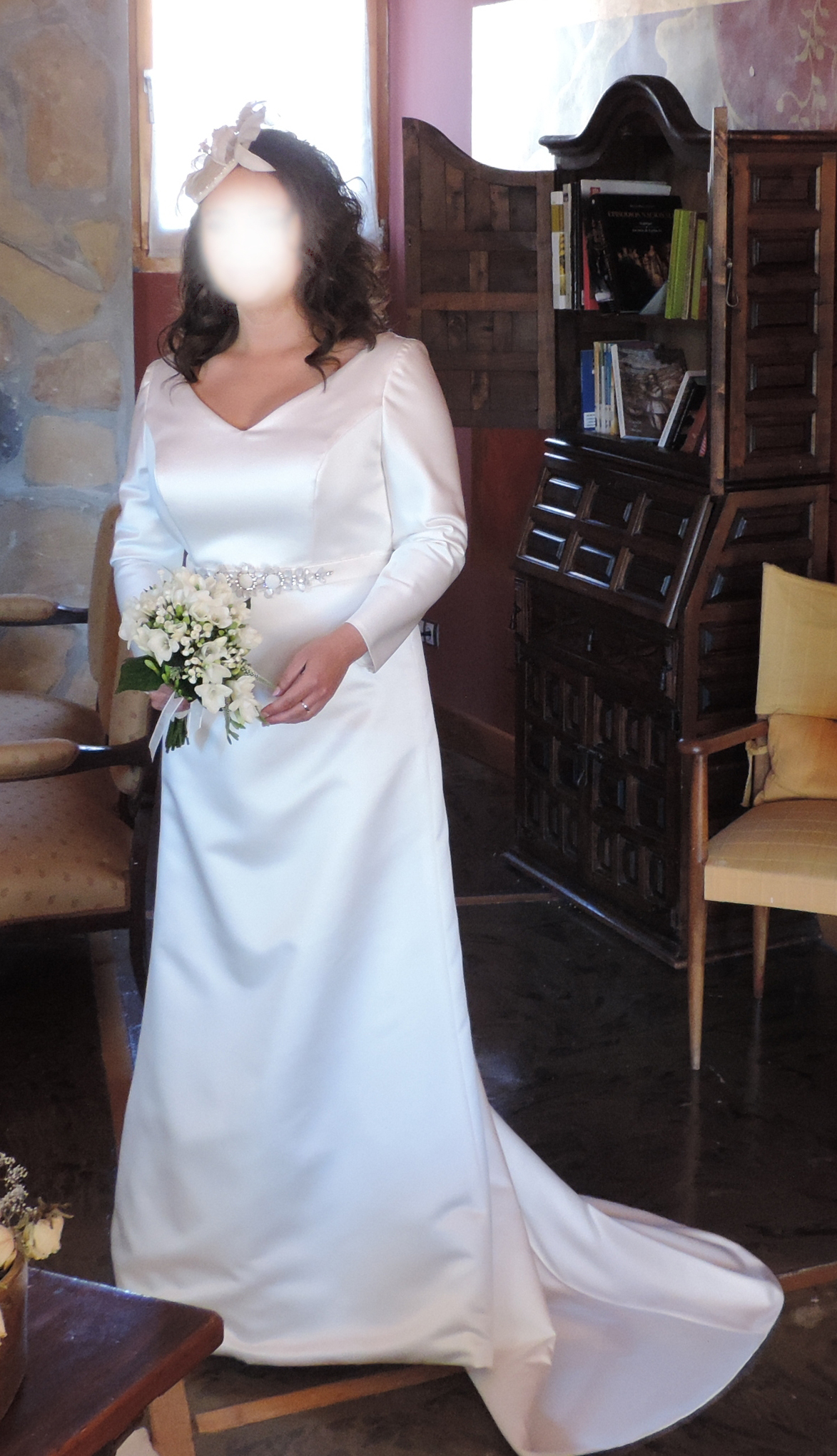 Vestido talla 46, basado en la sencillez de lineas puras. Elegancia de la tela con mucha prestancia y manga larga.