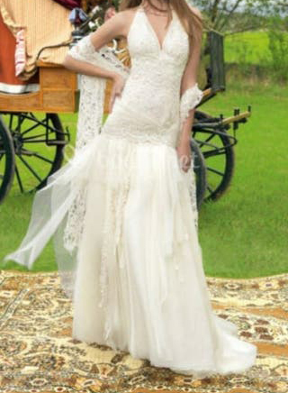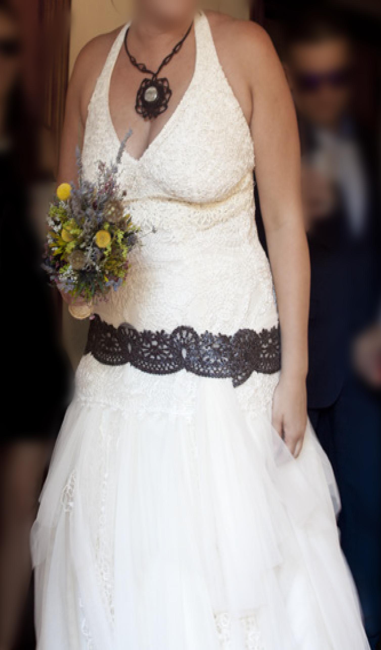 Vestido de novia YolanCris modelo Jaca, en perfecto estado, queda muy bien y pone talla 48 pero es más una 44 ó 46. Usado una sola vez y llevado a Tintorería profesional, El cinturón de piel bordado se lo cambié a un color marrón Tierra, muy original.