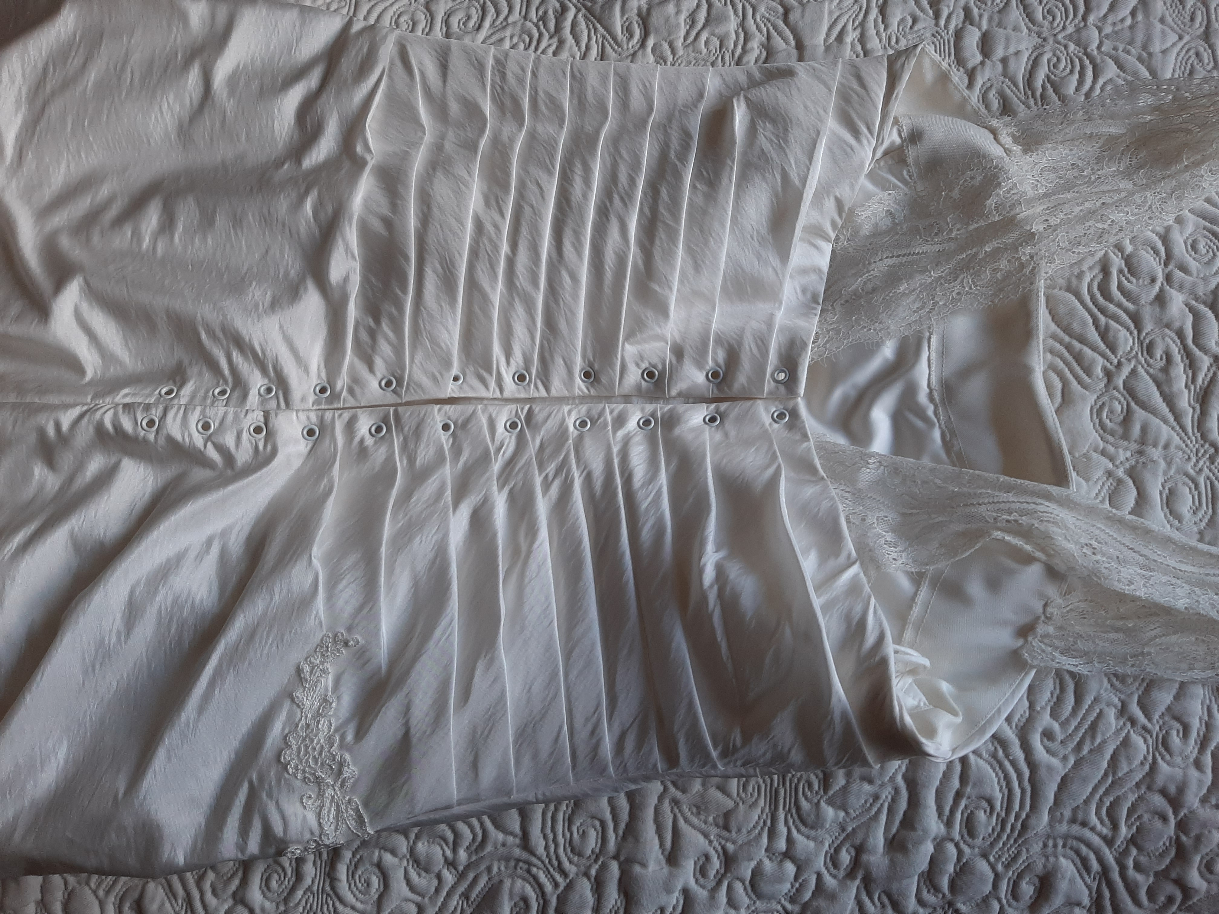 Un laçage dans le dos et un soufflet permettent de gagner facilement une taille ou de resserrer. Il y a des coutures, cette robe avait été retouchée par les couturières de la boutique et peut l’ être à nouveau.