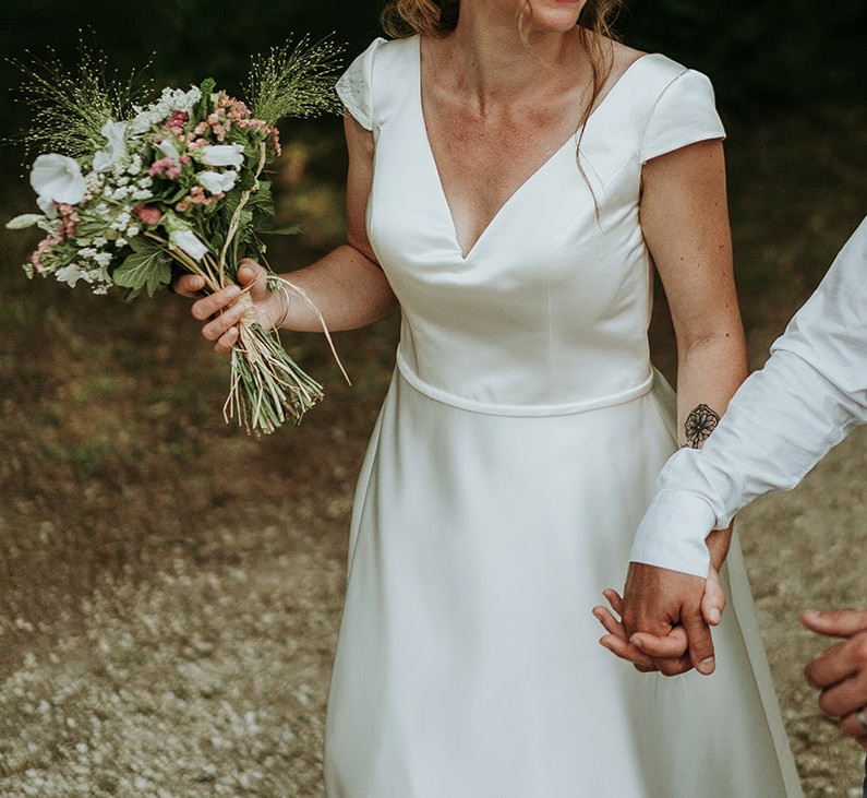 Un look Français intemporel en satin, avec de petits mancherons sobres et laissant entrevoir juste ce qu’il faut du dos et du décolleté. Des poches profondes invisibles modernisent sa silhouette coupe en A classique.