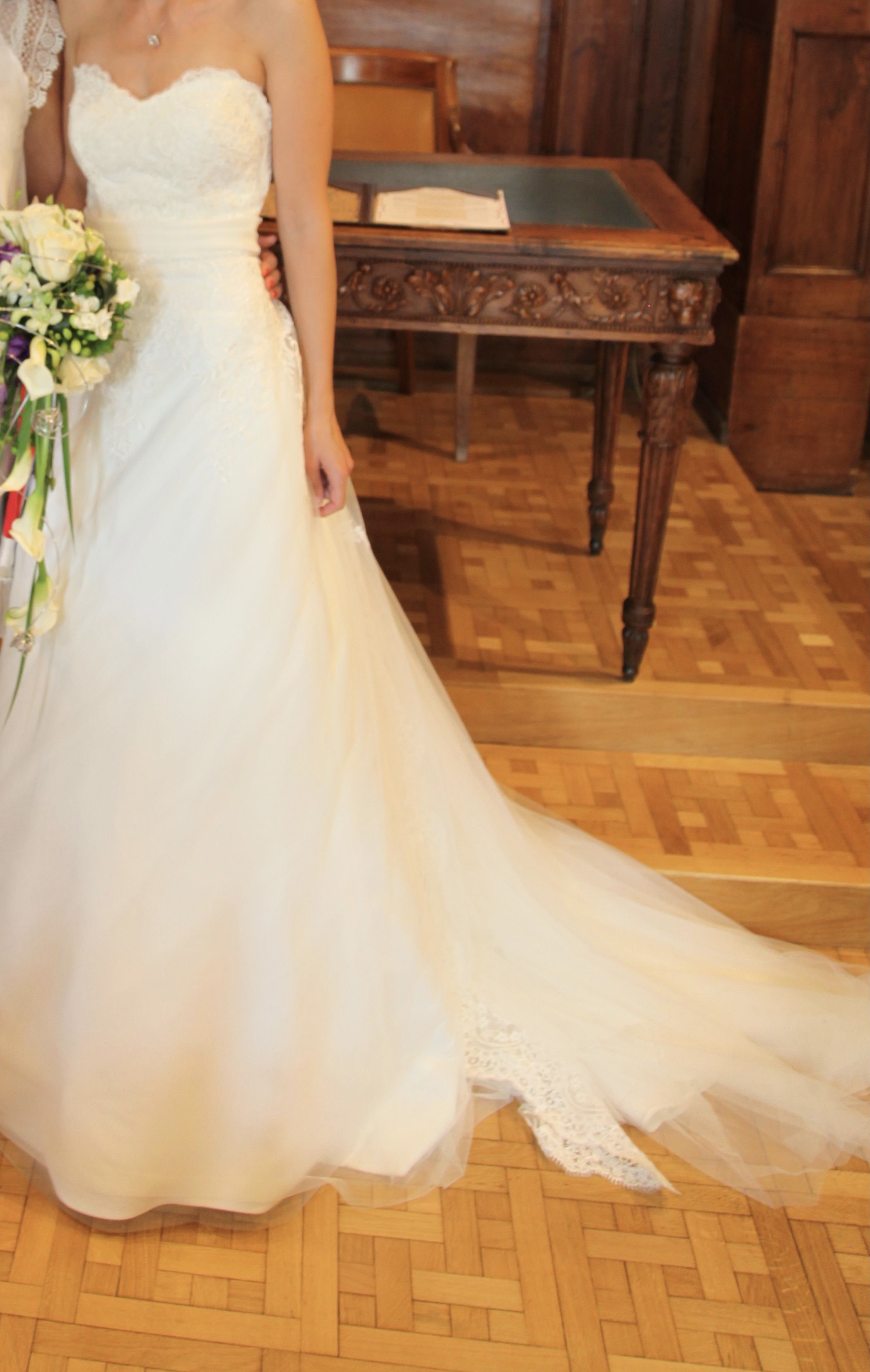 Elle date de 2015, n’a été portée qu’une seule fois et a été lavée en pressing spécialisé après le mariage