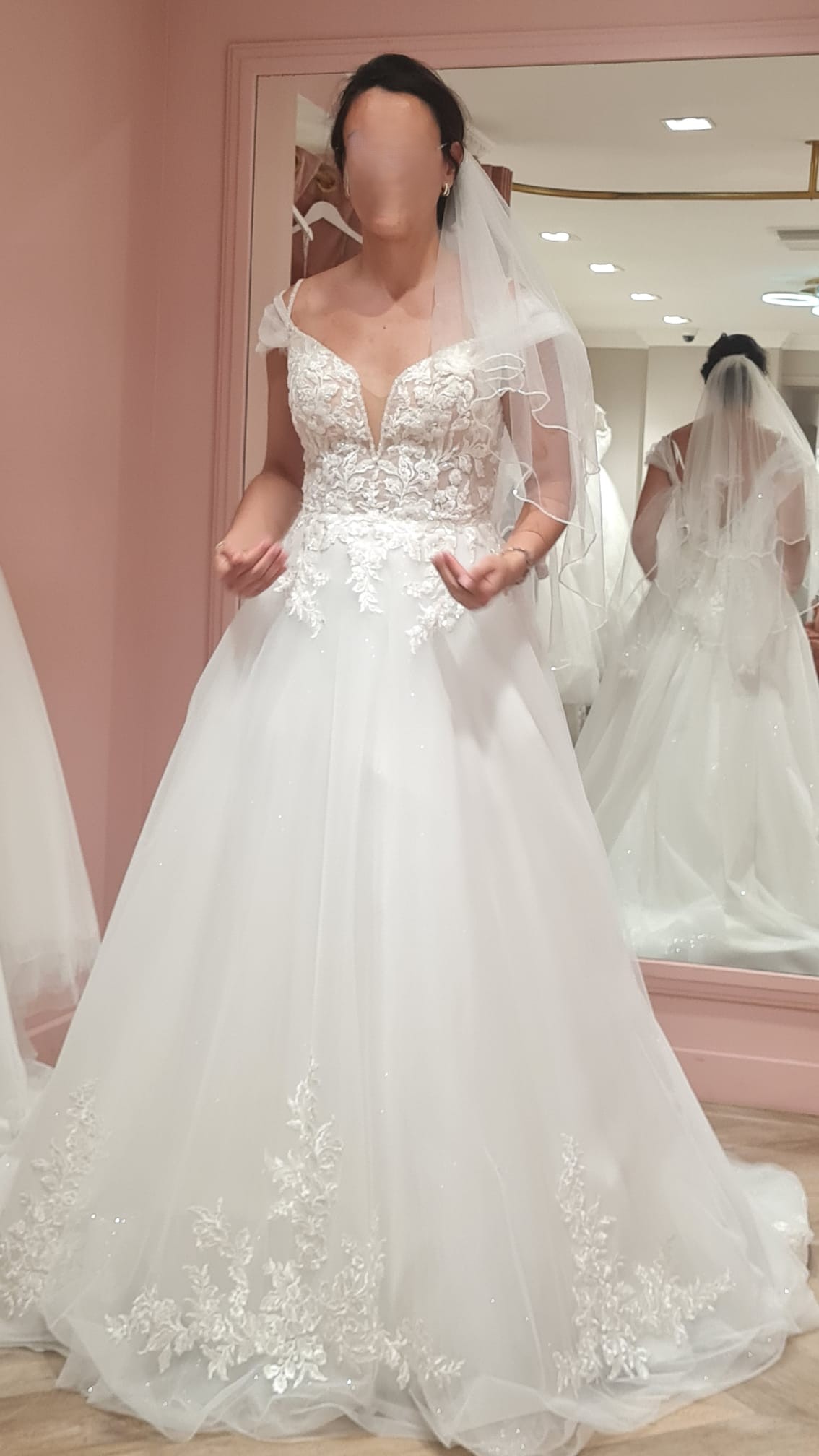 Style : robe princesse, dos nu, jupe en tulle pailletée avec broderies, décolleté haltier en V avec dentelles fines et perles. Elle possède deux bretelles fines en perles. Les épaulettes en tulle ont été rajoutées à ma demande car je trouvais que cela faisait plus beau mais vous pouvez les faire enlever facilement si vous préférez.