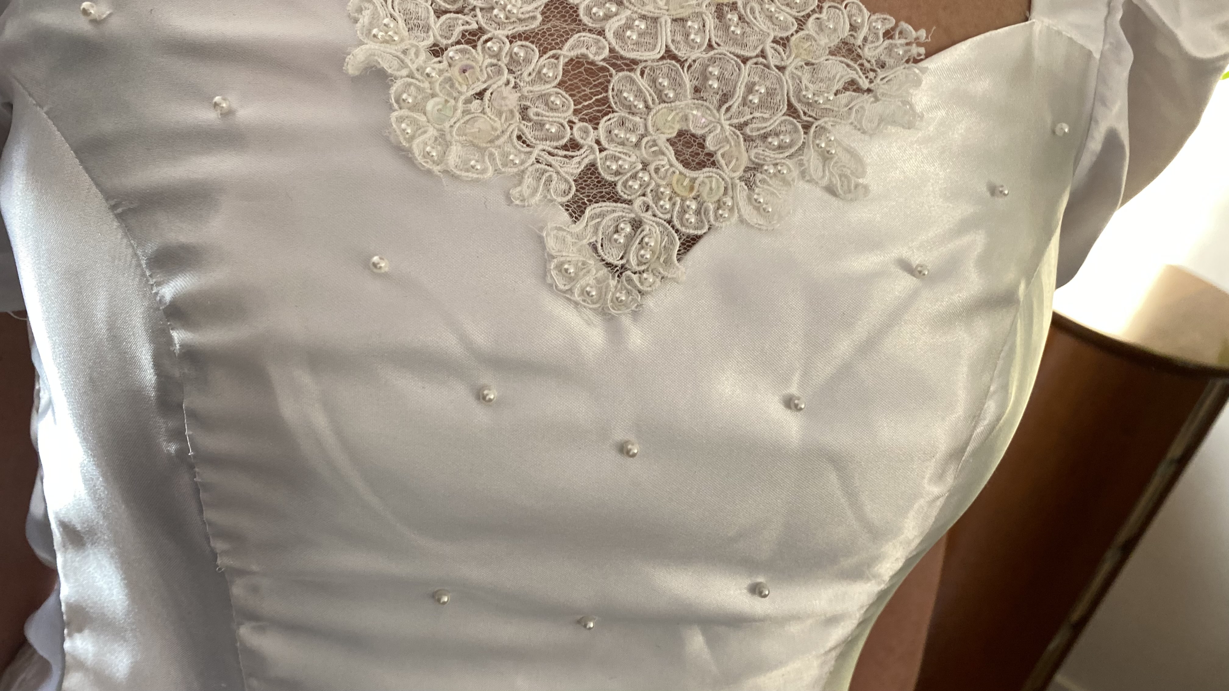 Robe de mariée en satin blanc avec son jupon en tulle, taille 38/ 40 composé d’un boléro,manches longues, d’une paire de gants blancs, et offerts :une coiffe en tulle blanche et une épingle à cheveux avec perles .