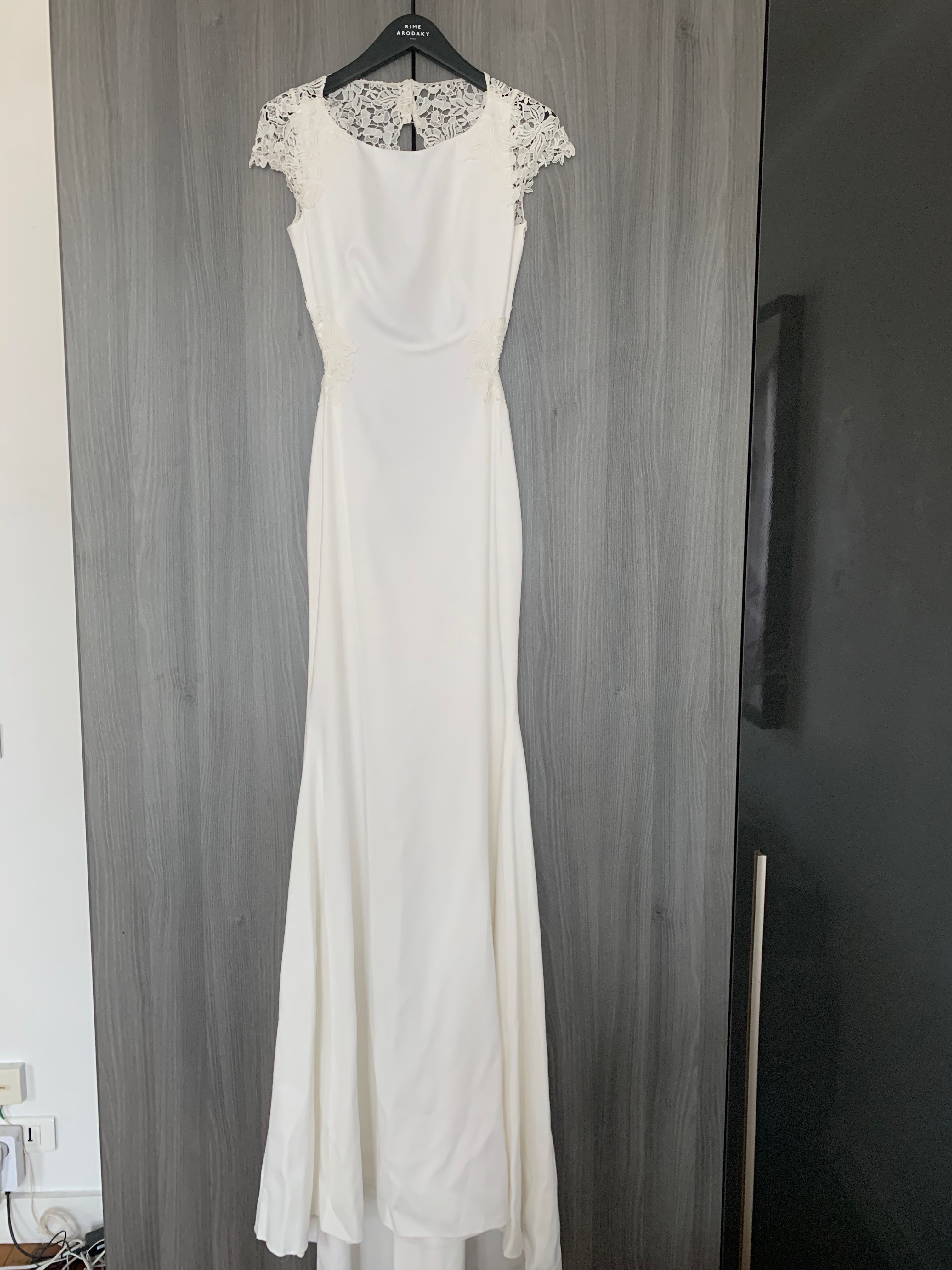 La robe Adele de Rime Arodaky n’a jamais été portée. Aucune retouche n’a été faite que se soit au niveau de la taille ou de la longueur. C’est une robe de mariée de forme sirène. Dans un style simple et glamour. Cette jolie robe bi-matière en crêpe et dentelle, vous assurera une élégance certaine le jour J. Coupe sirène Col rond Manches courtes Broderie fleuri Prix initial : 3690 €