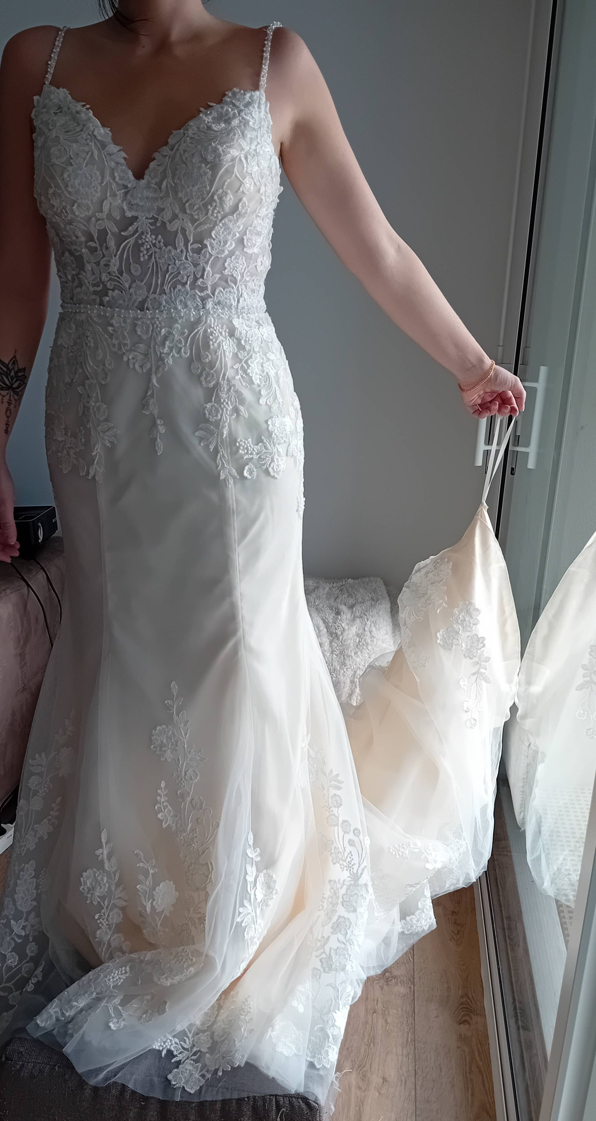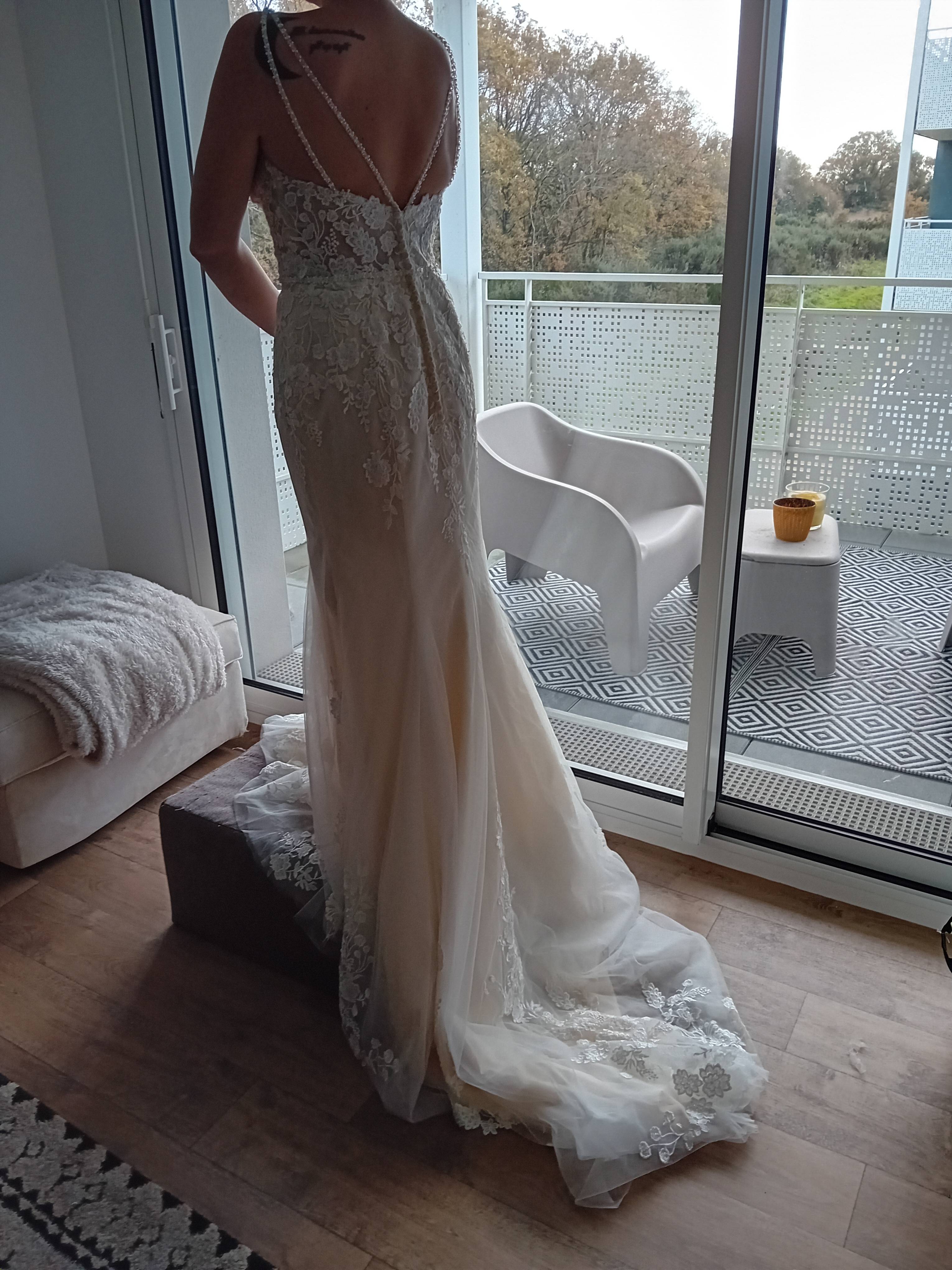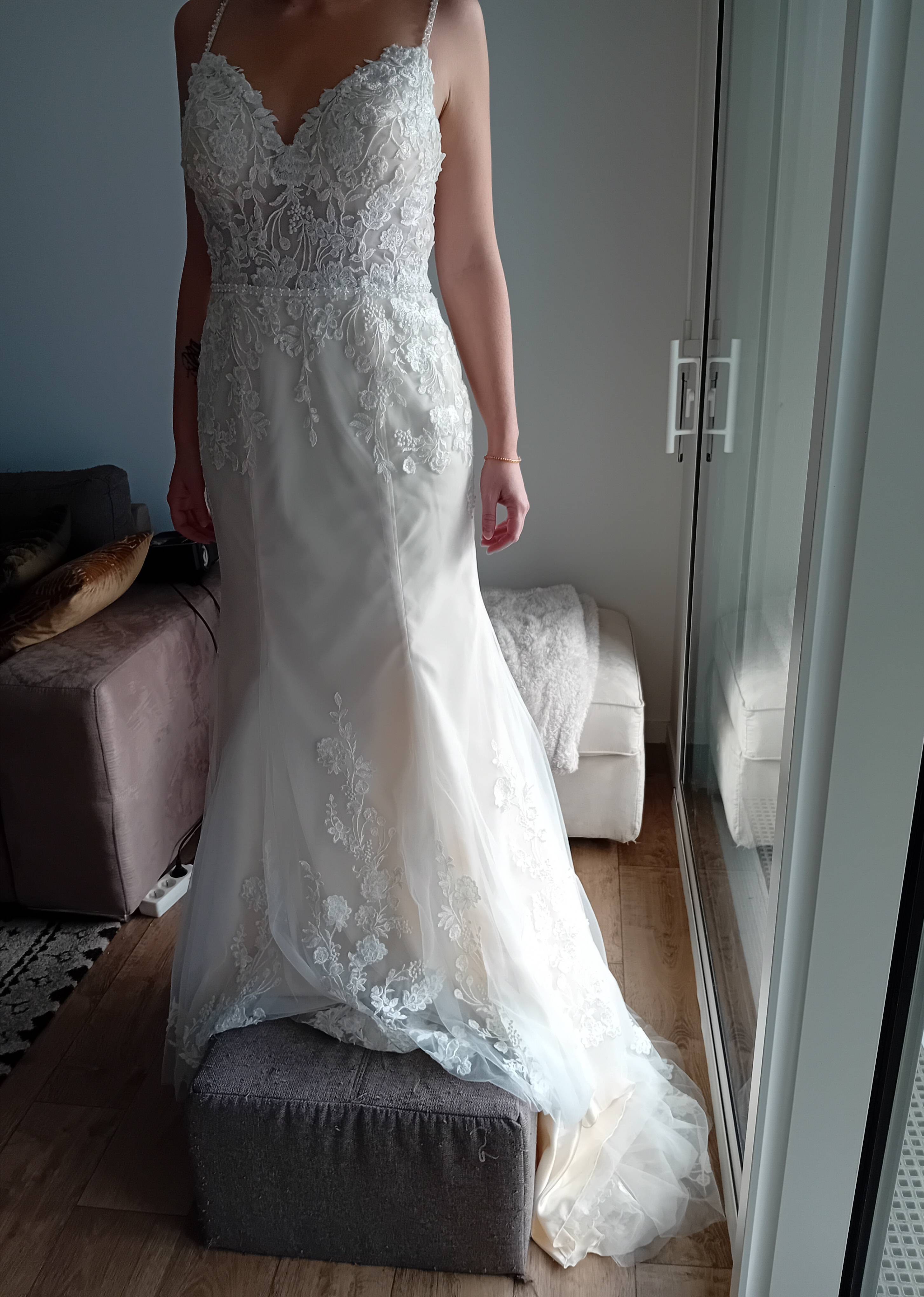 Je vend cette somptueuse robe de mariée à la coupe sirène, alliant modernité et romantisme. C’est une robe de milieu de gamme en polyester acheté 1200€. Je ne me souviens plus de la marque.