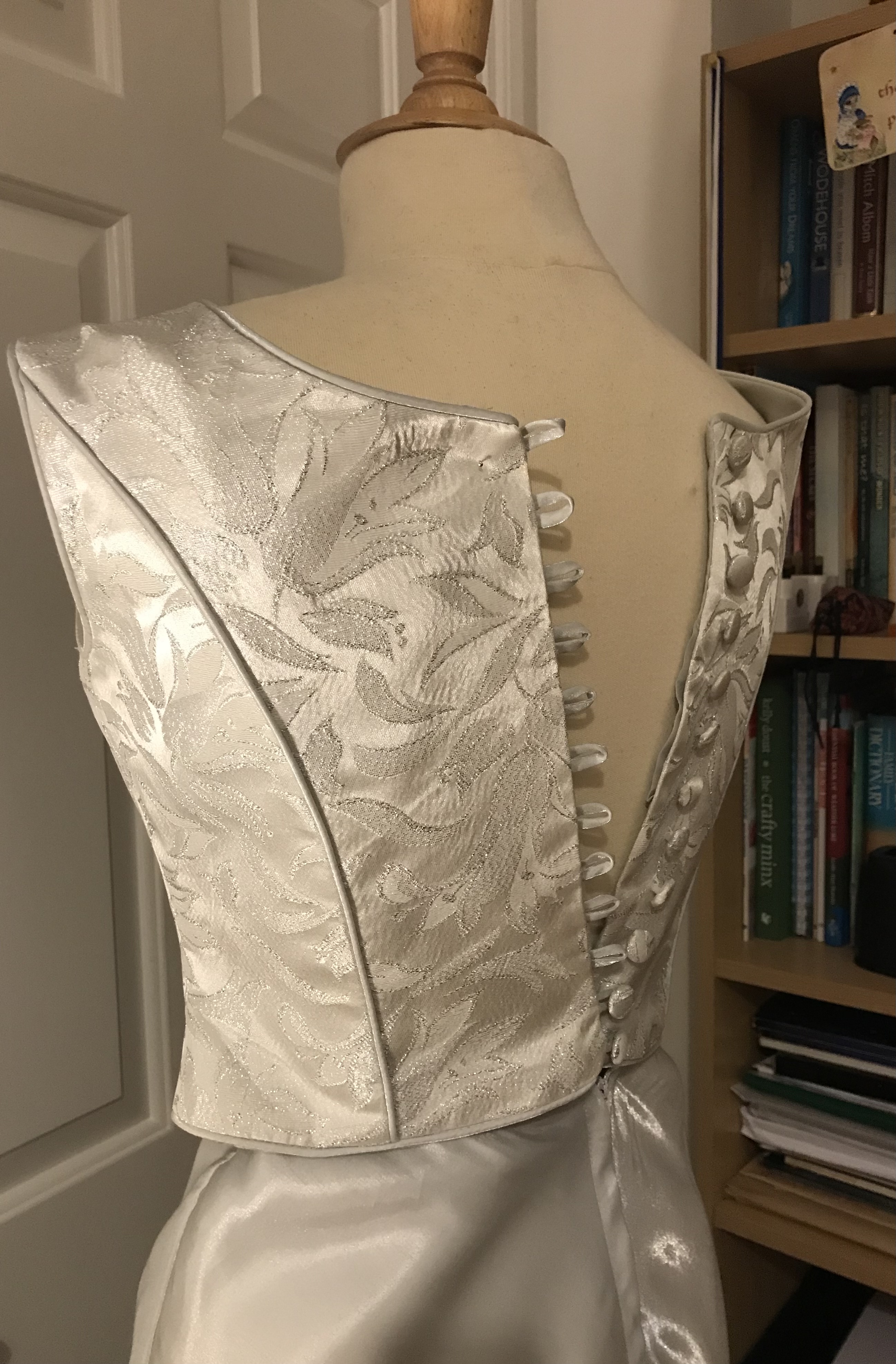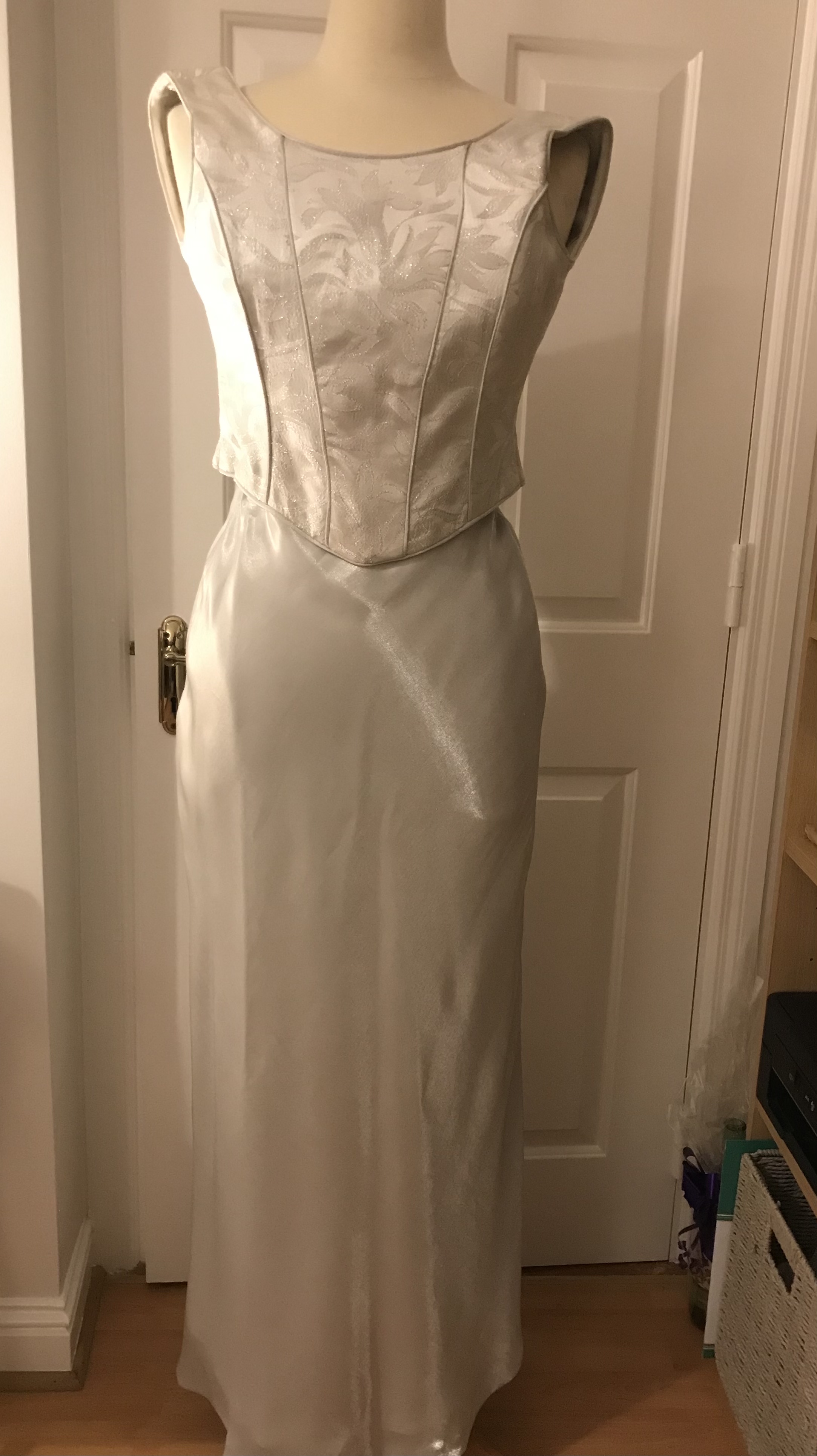 Two piece custom made silver wedding dress. Top is embossed brocade with covered buttons at the back. The skirt is satin sheen