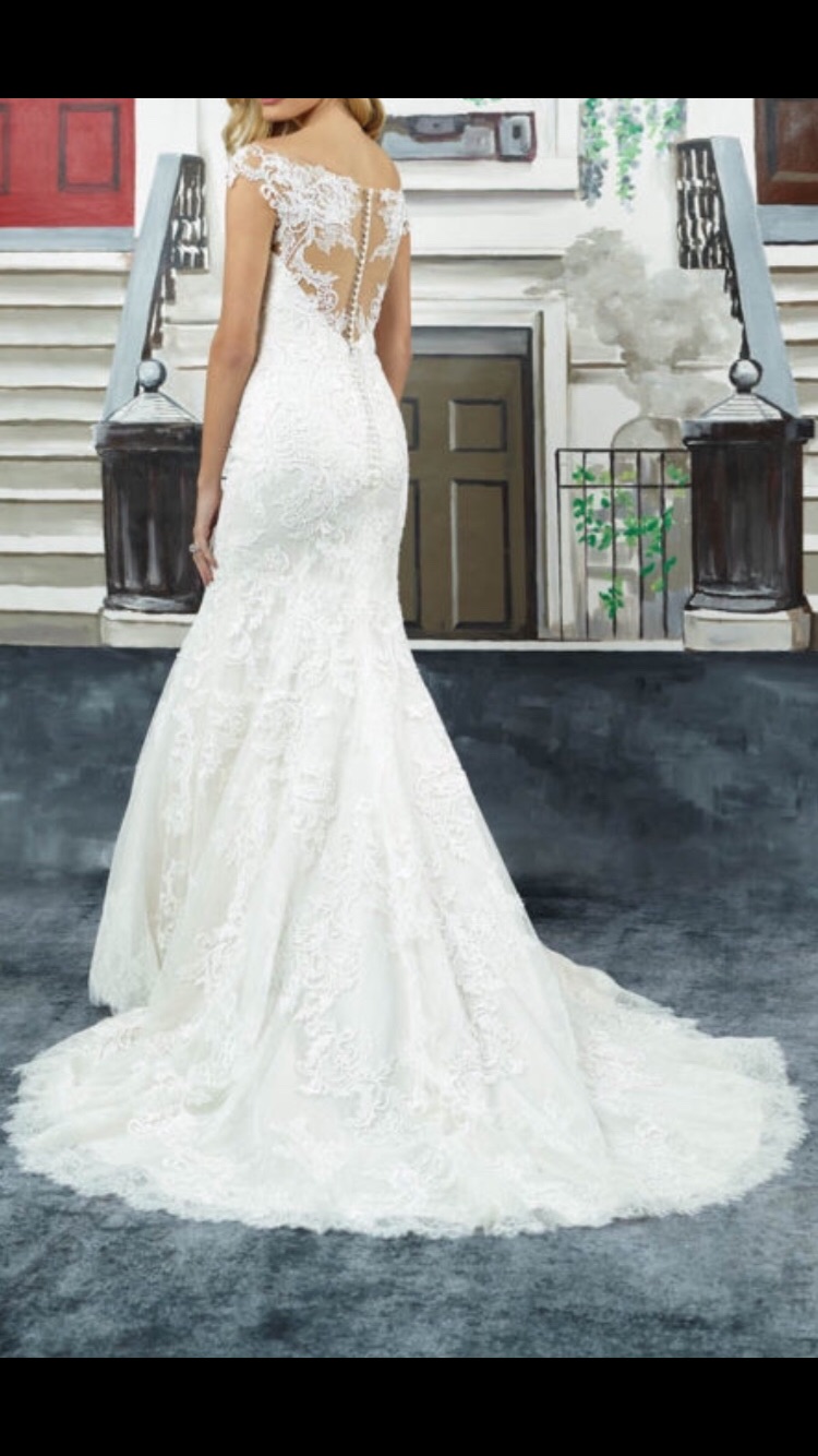 Beautiful ivory Justin Alexander wedding dress. Illusion lace off the shoulder fit and flare. Venice lace adorns the illusion back, finished with buttons and loops. Excellent brand new condition and professionally cleaned. Size 12 and can be altered. Trail of the dress can be tied up for evening reception.