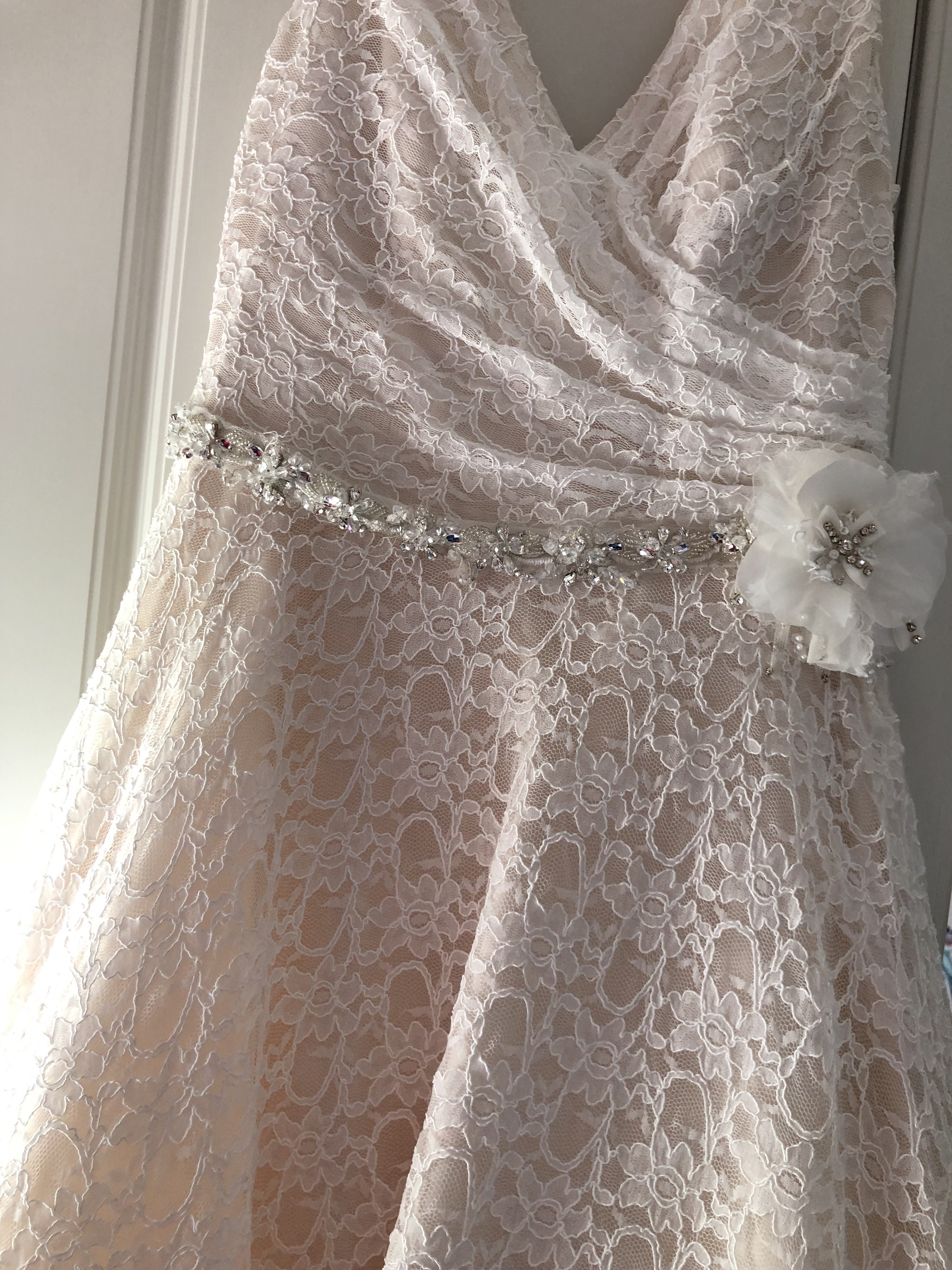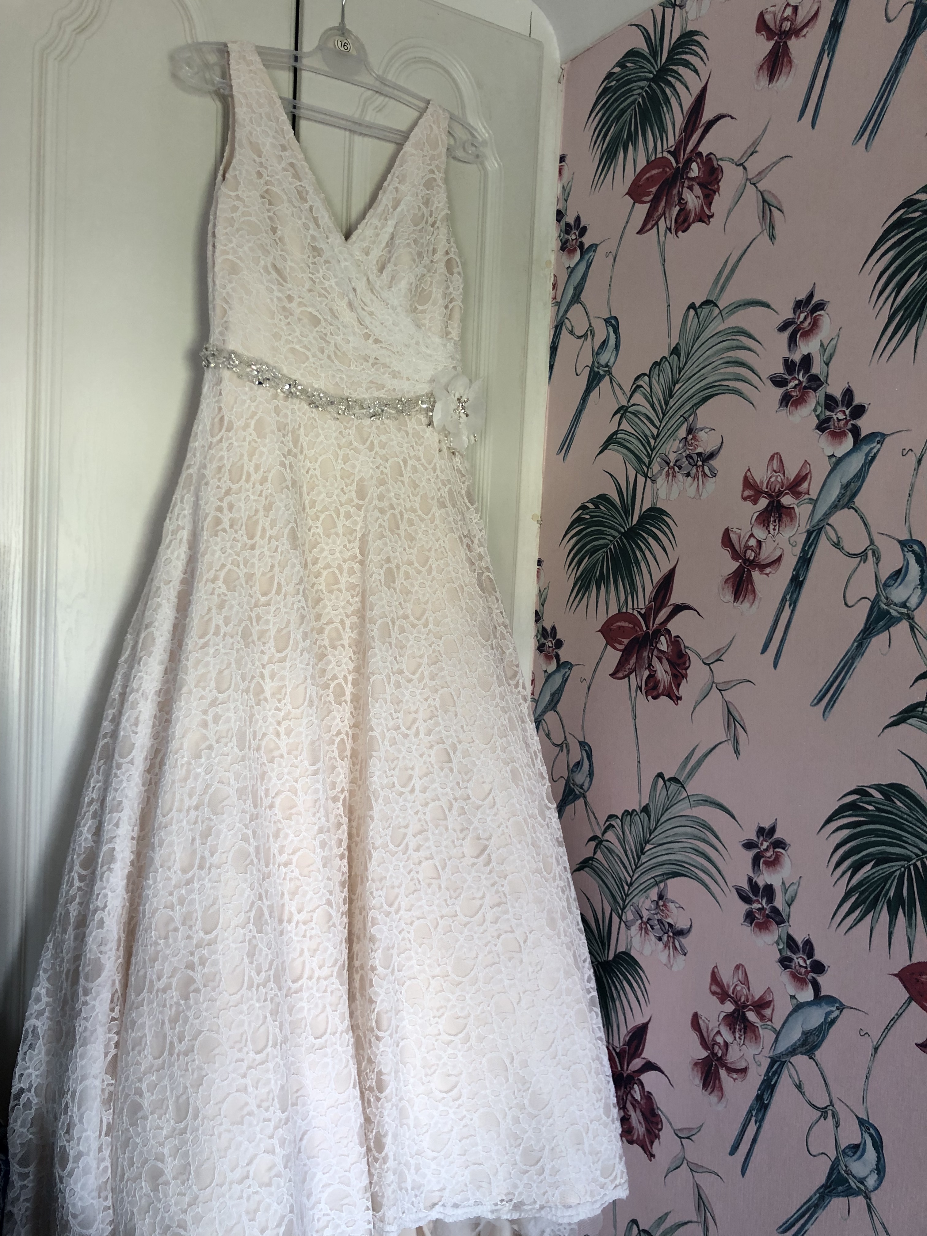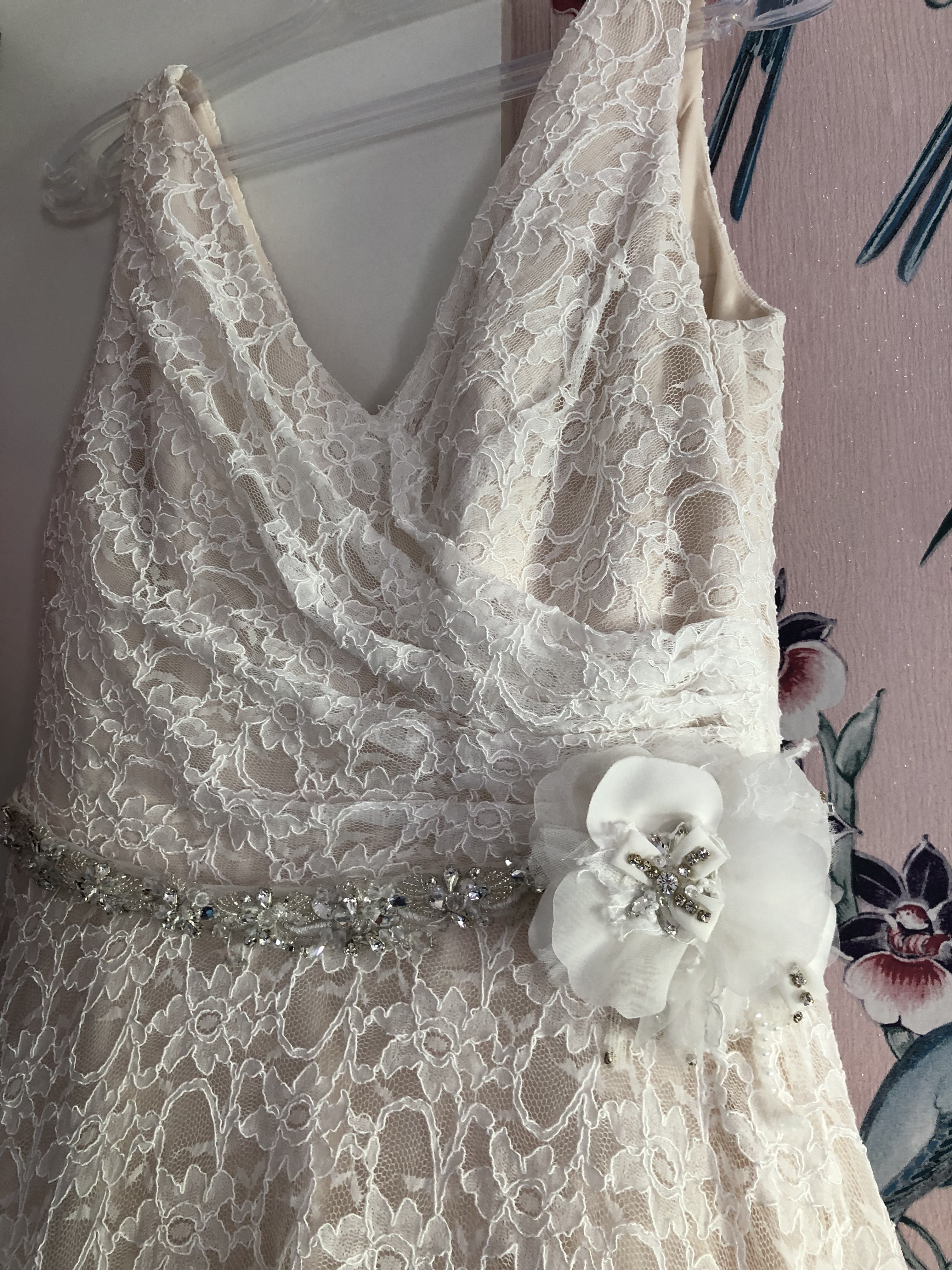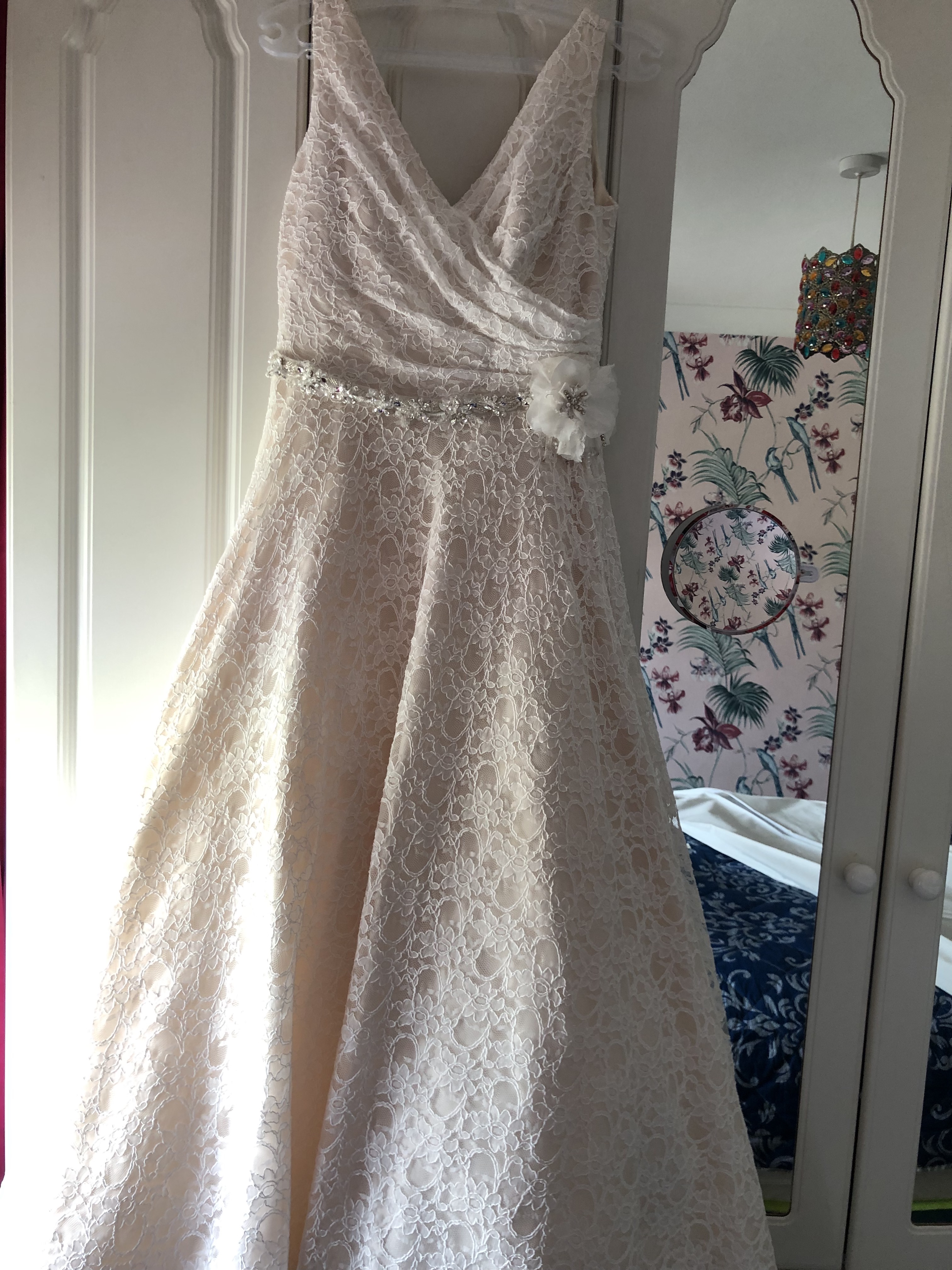 Lace Embroidery on Net Over Soft Satin Morilee Bridal Wedding Dress with Christal belt and beautiful details. Champagne/Gold/White colour satin with white colour lace embroidered all over the gown. V-neck Aline Sleeveless gown. Uk size 16-18. Dry-cleaned and ready to wear, in perfect condition.