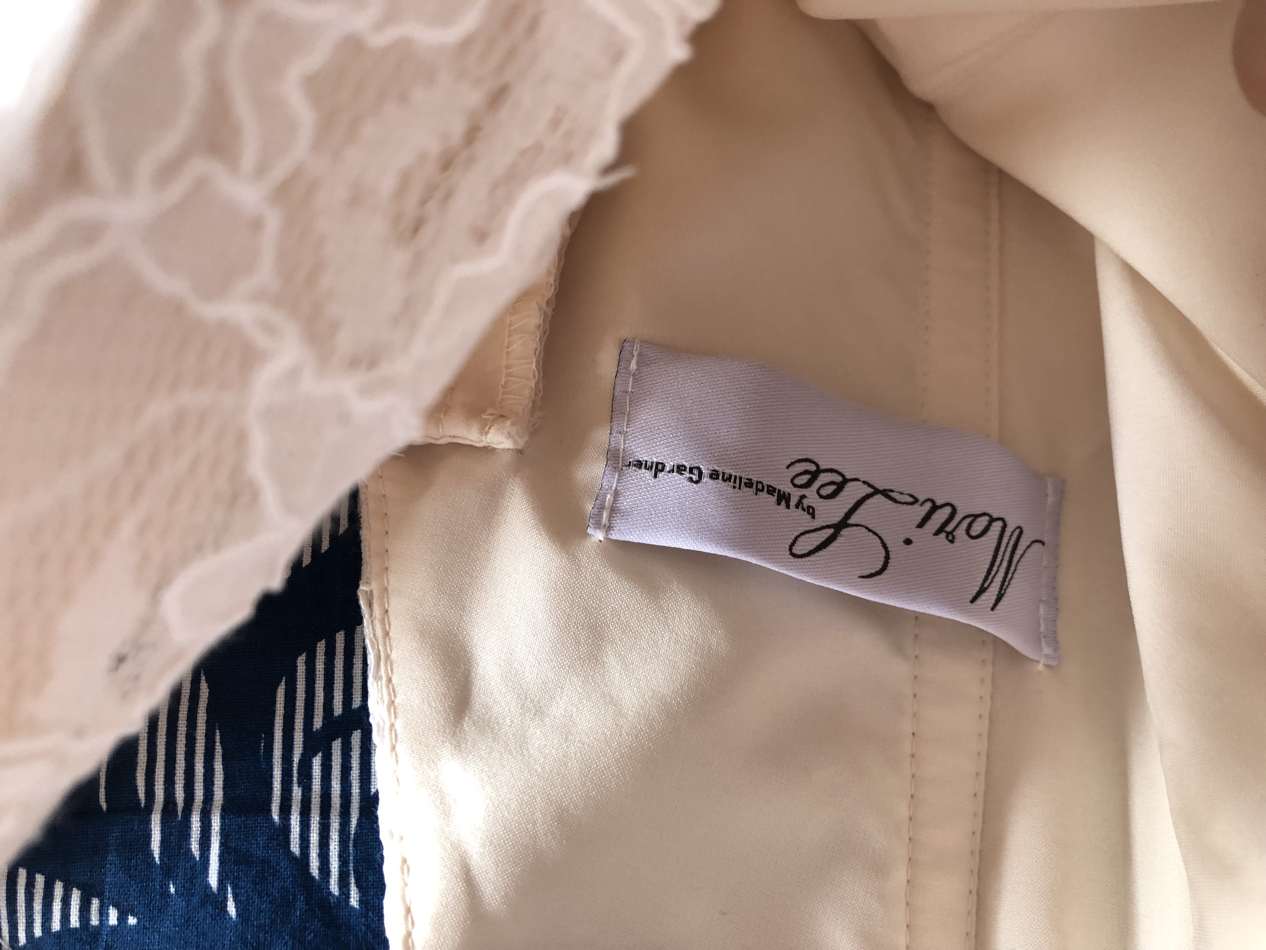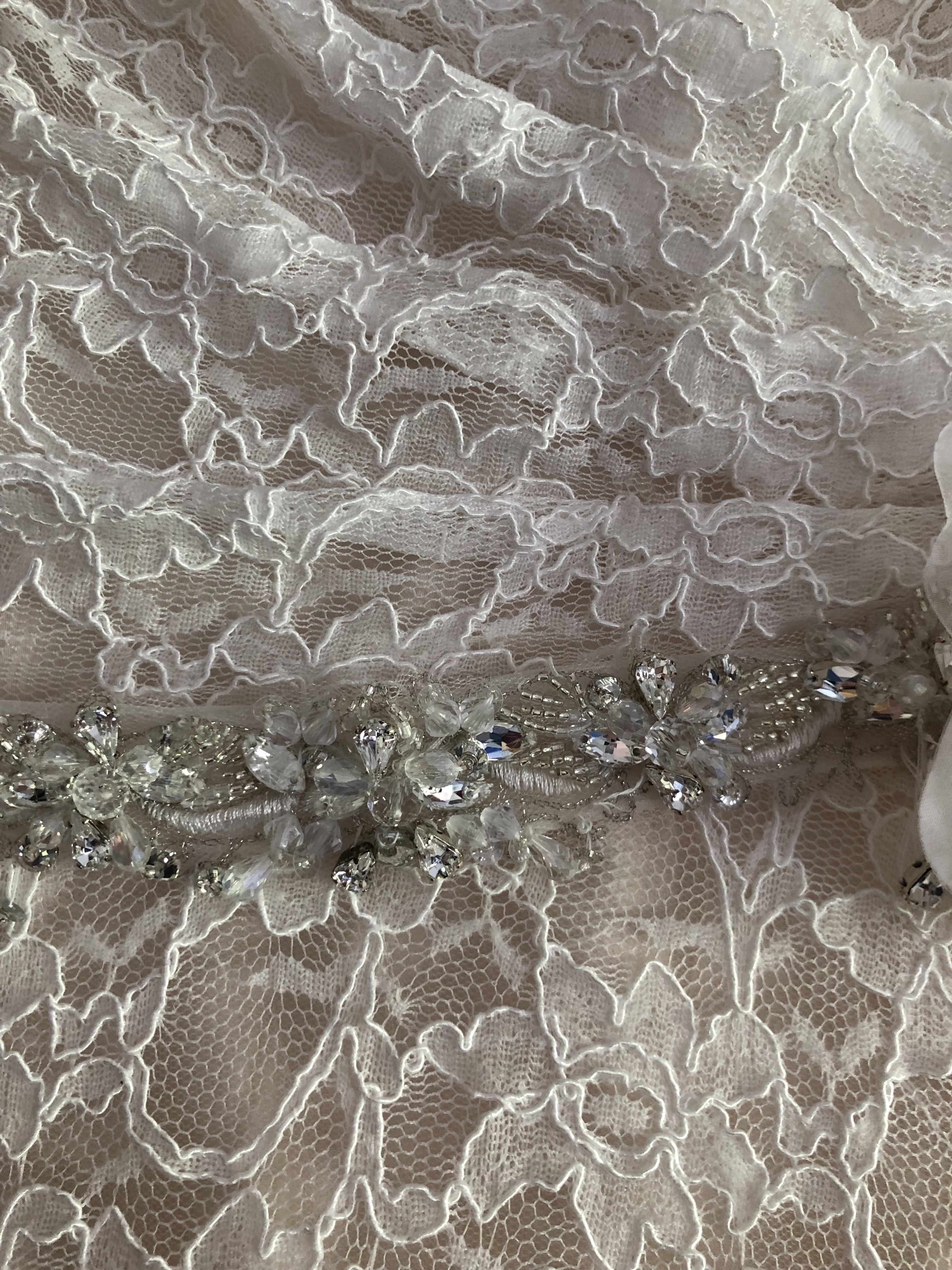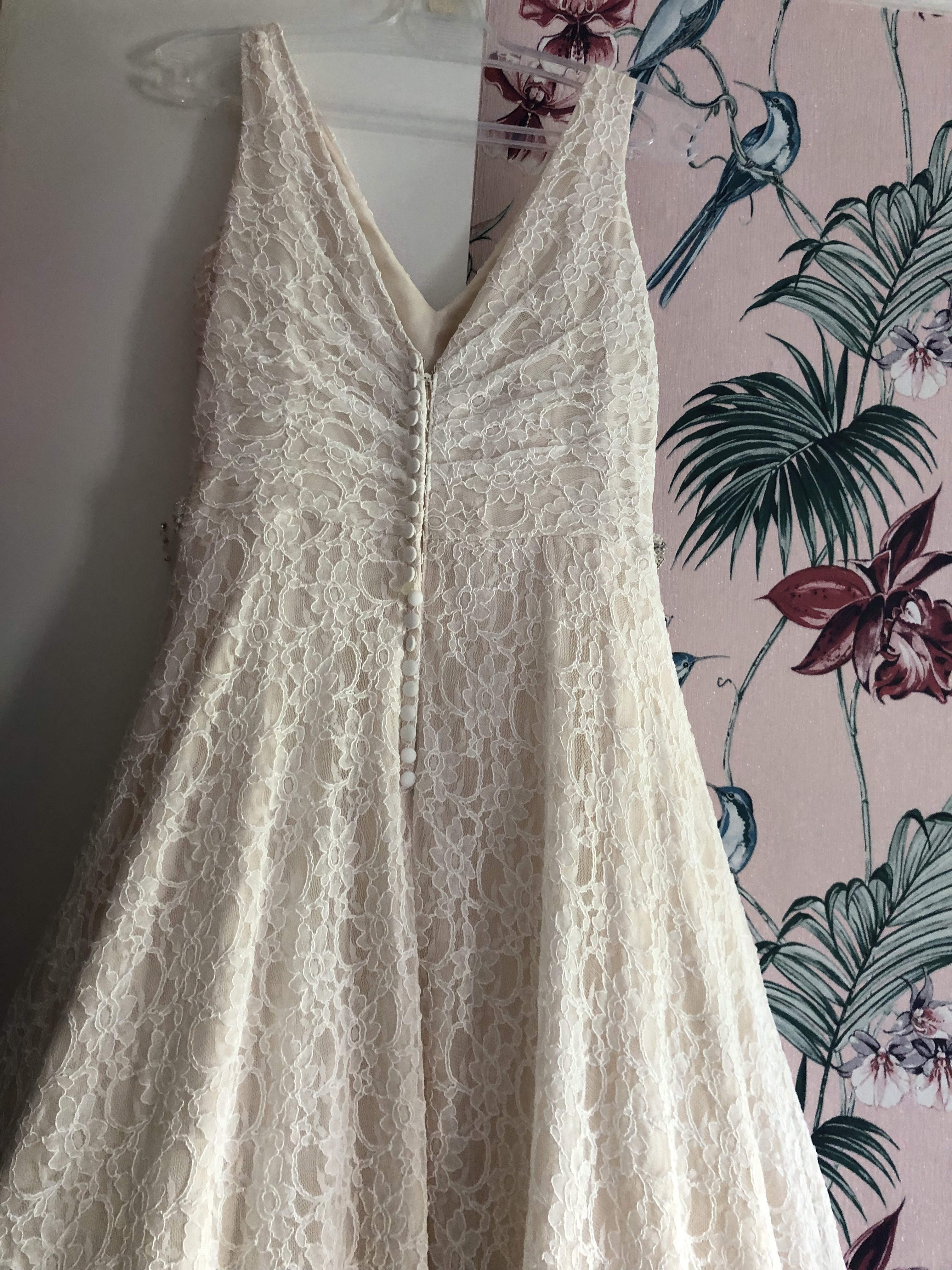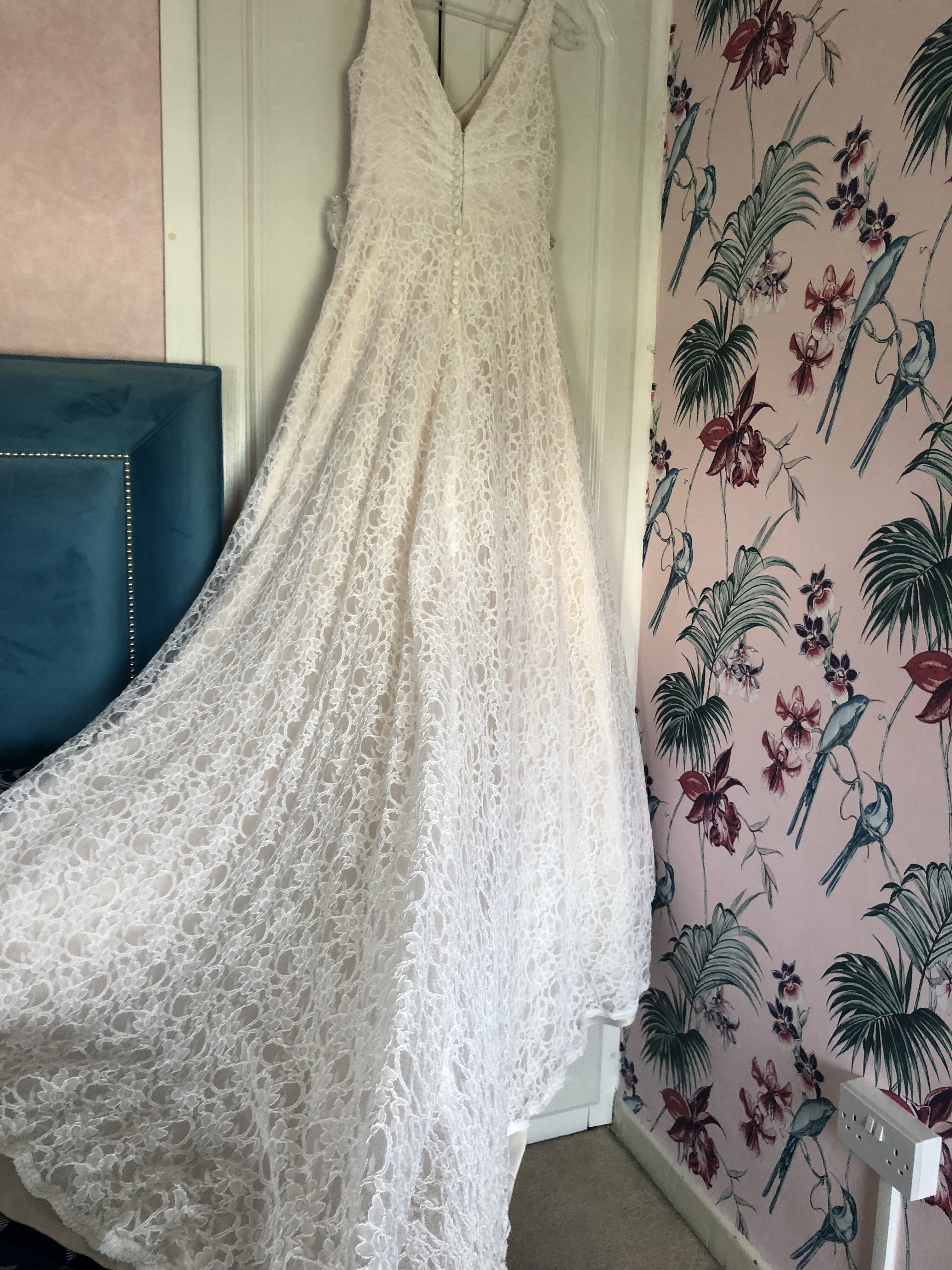 Lace Embroidery on Net Over Soft Satin Morilee Bridal Wedding Dress with Christal belt and beautiful details. Champagne/Gold/White colour satin with white colour lace embroidered all over the gown. V-neck Aline Sleeveless gown. Uk size 16-18. Dry-cleaned and ready to wear, in perfect condition.