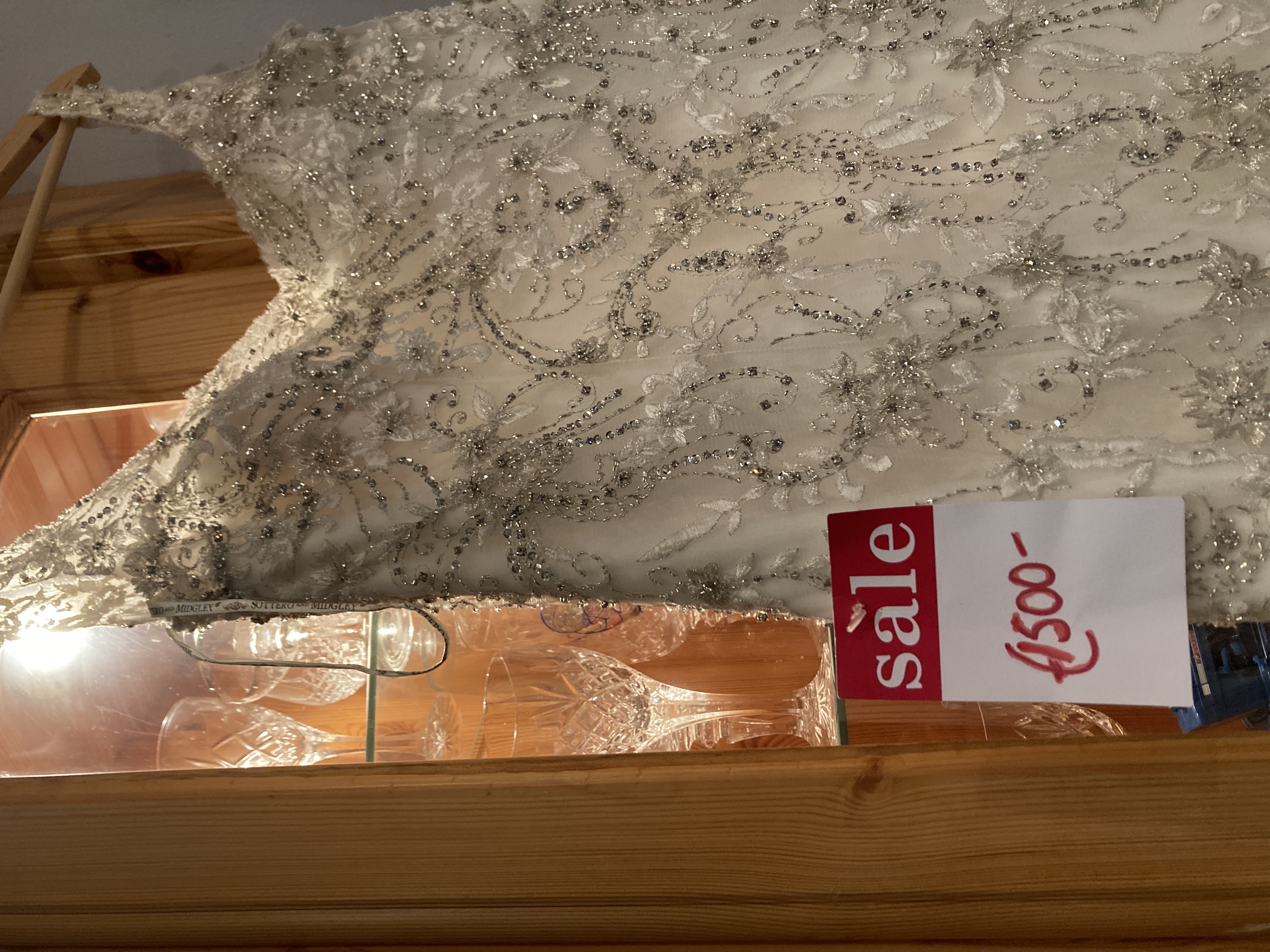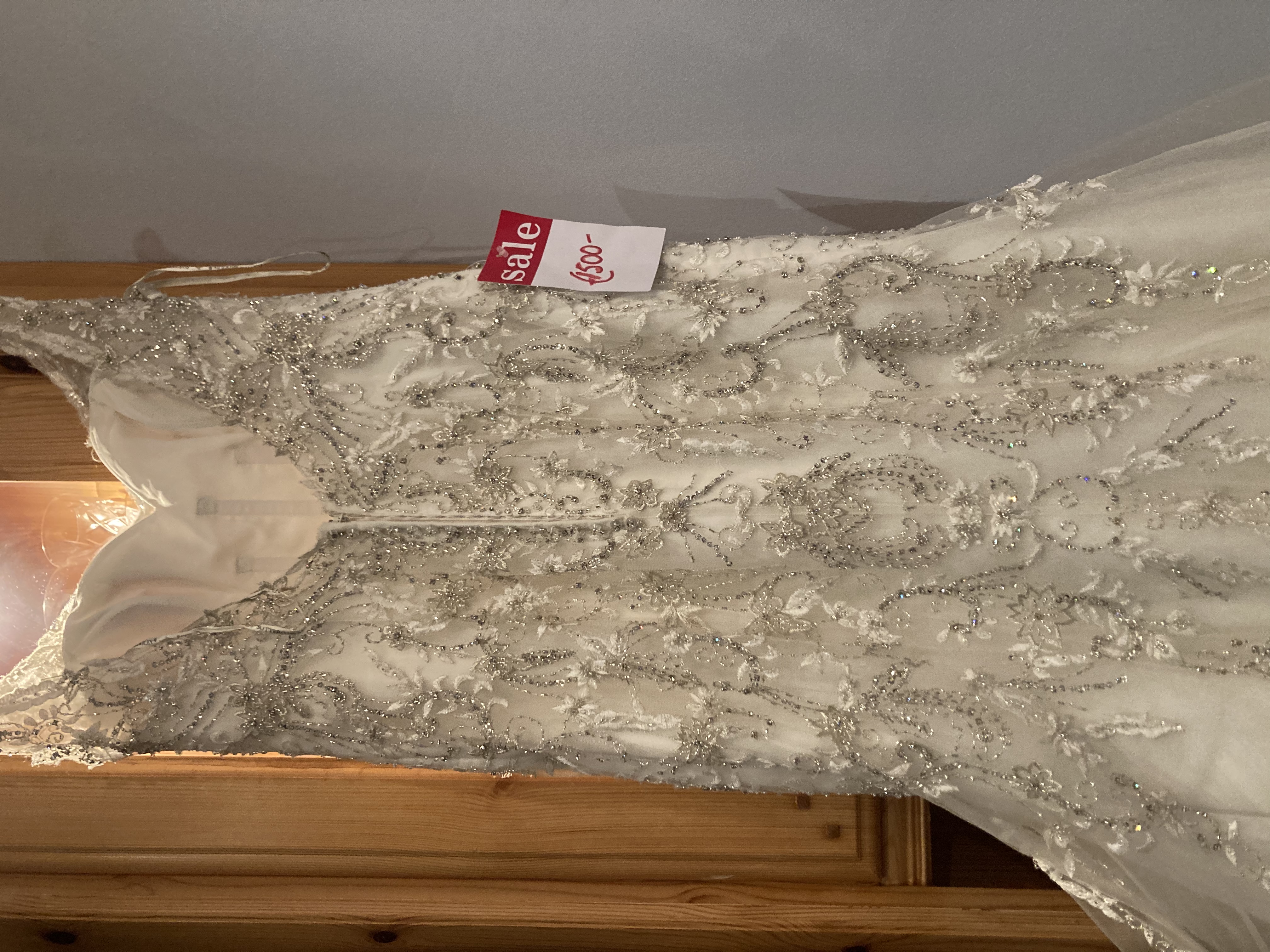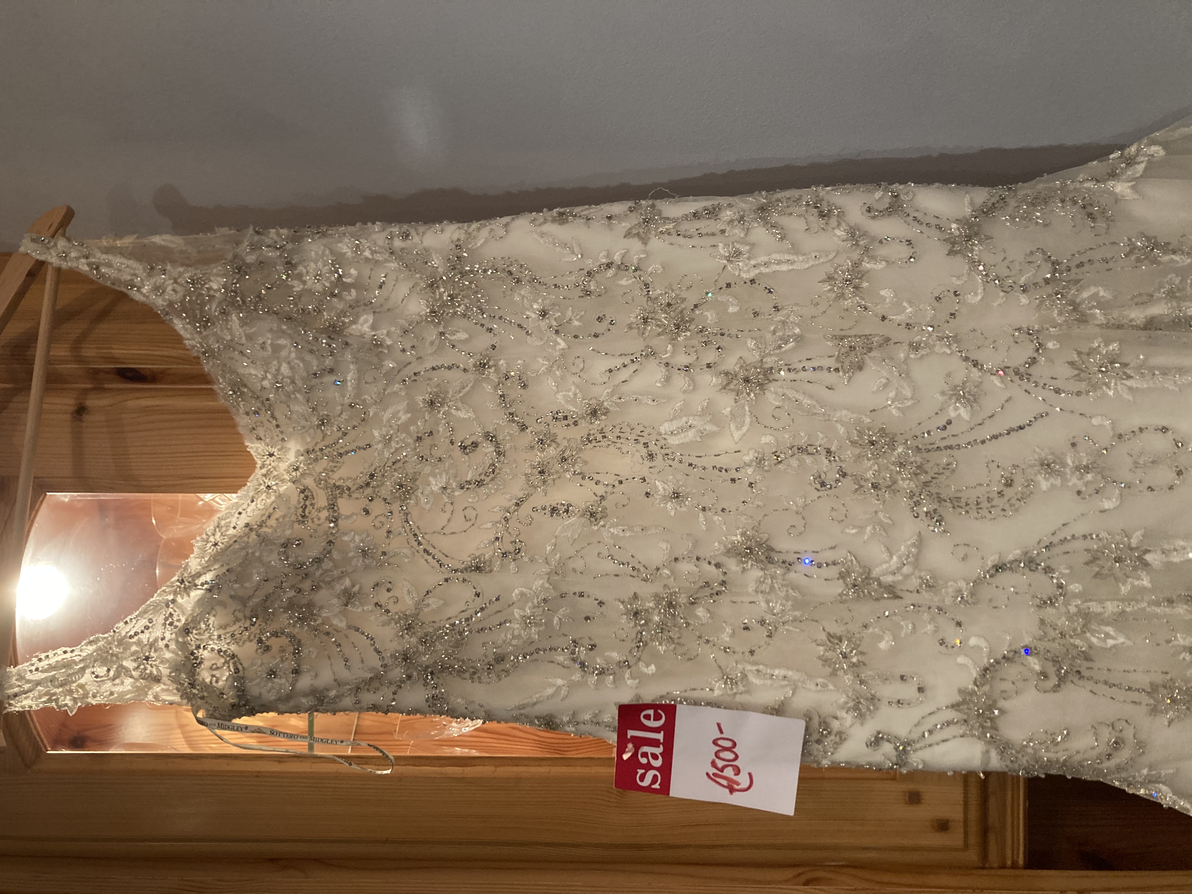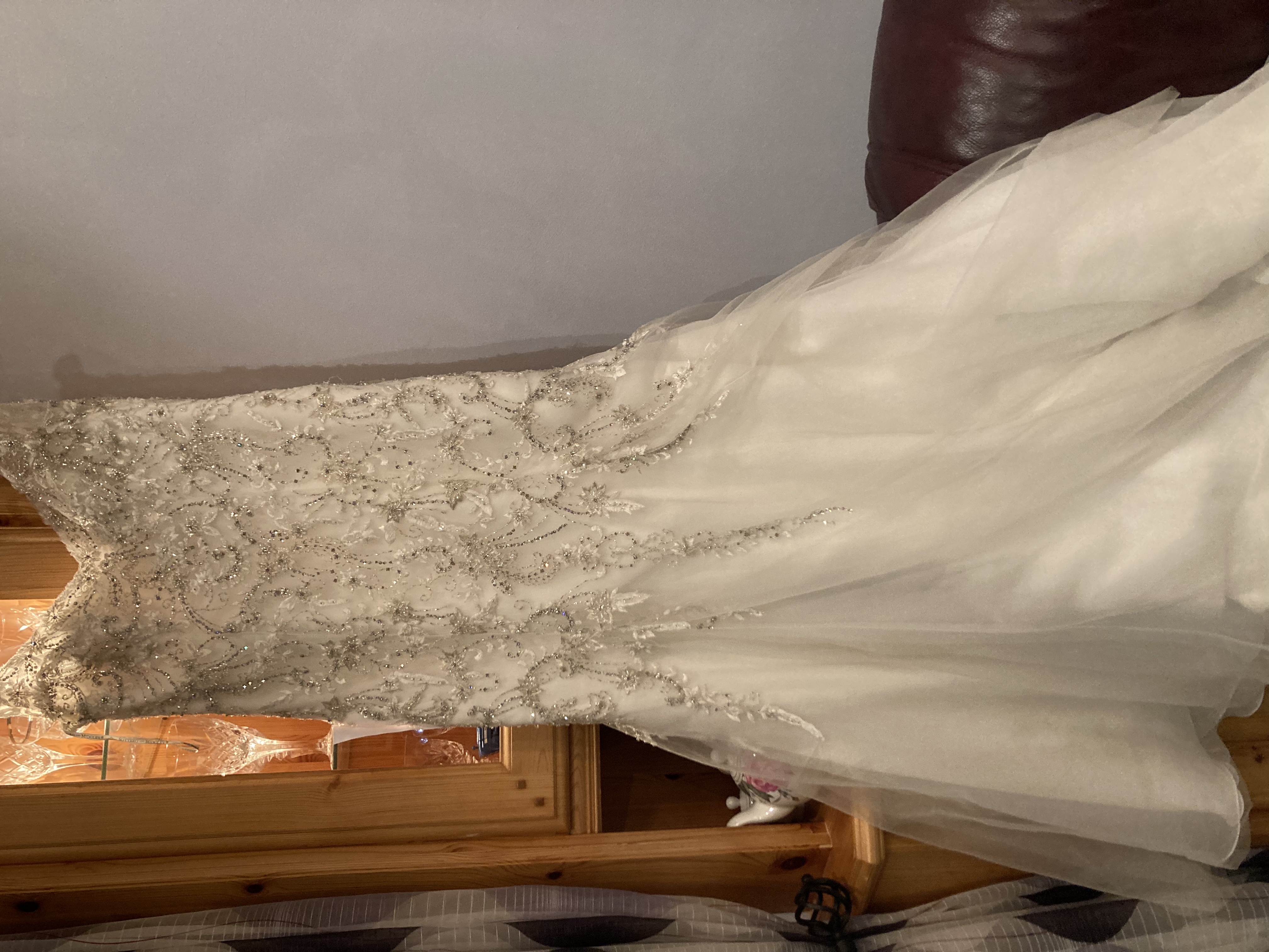 A Maggie Sottero impulse buy. Never worn. A size 10 off-white/ivory dress with a tulle bodice accented in beaded embroidery and Swarovski crystals, a sweetheart, a plunging V back and a tulle skirt over Chantilly lace. This is worth viewing Original price as seen on tag €2250.00 bought at sale for €1500.00 selling for €800. or nearest offer.