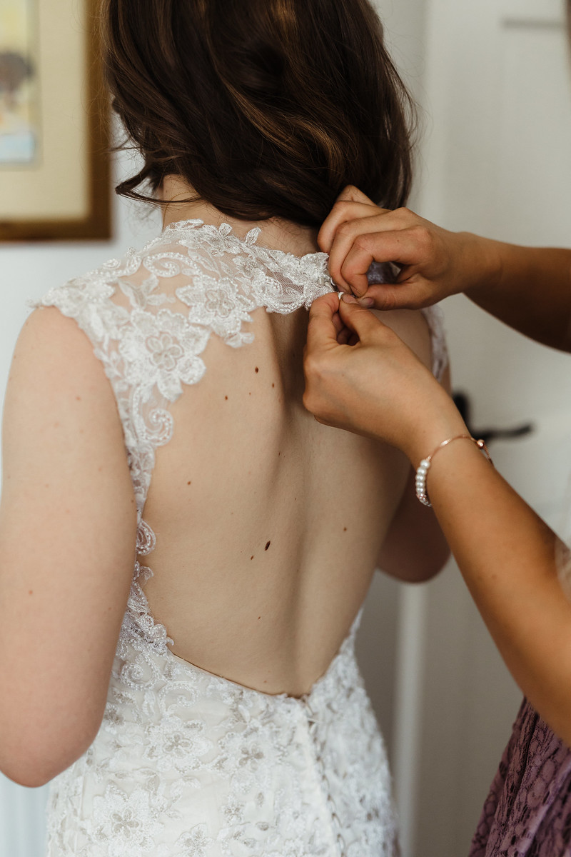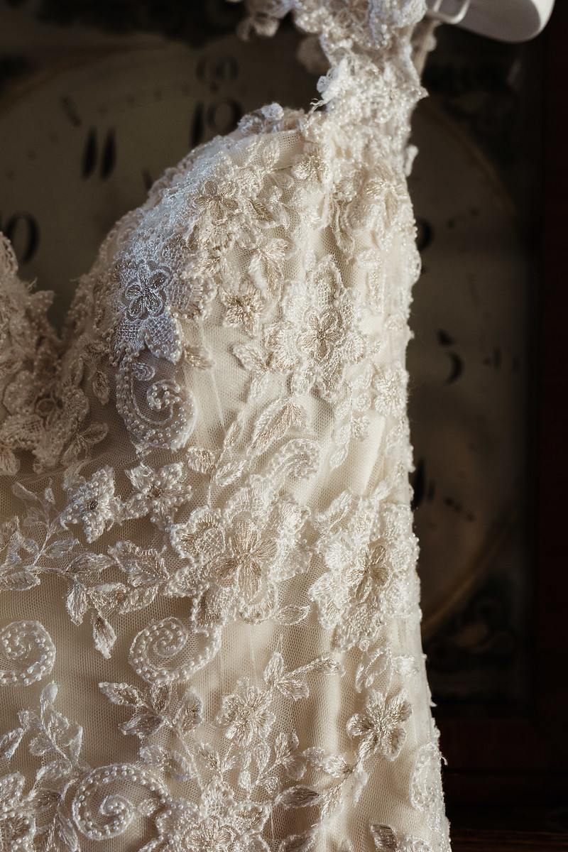 The dress has delicate pearls interwoven throughout the lace, a stunning train which is over a meter long, a gorgeous open back with dainty buttons and beautiful capped lace sleeves.