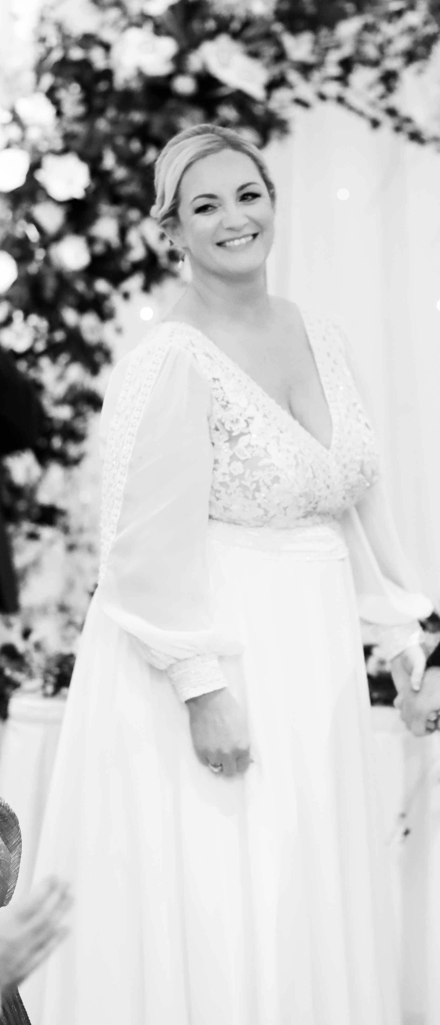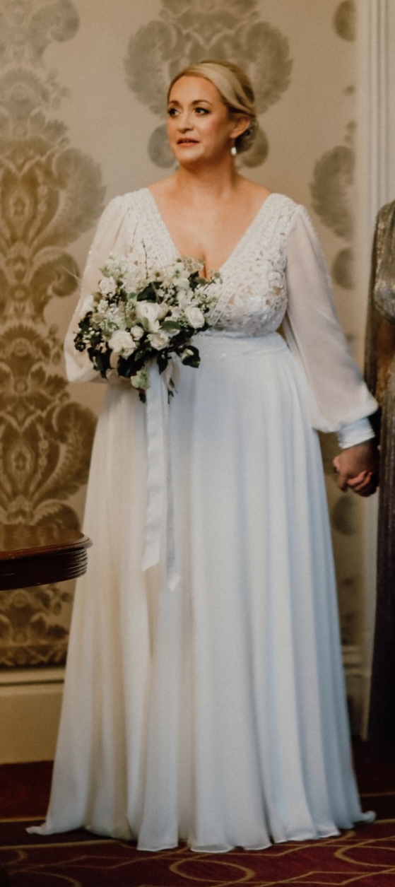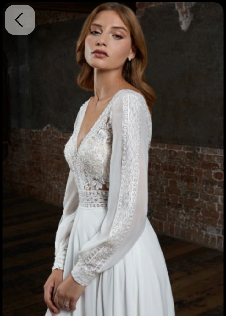 A stunning bohemian A line wedding gown with detailed chiffon cuffed sleeves