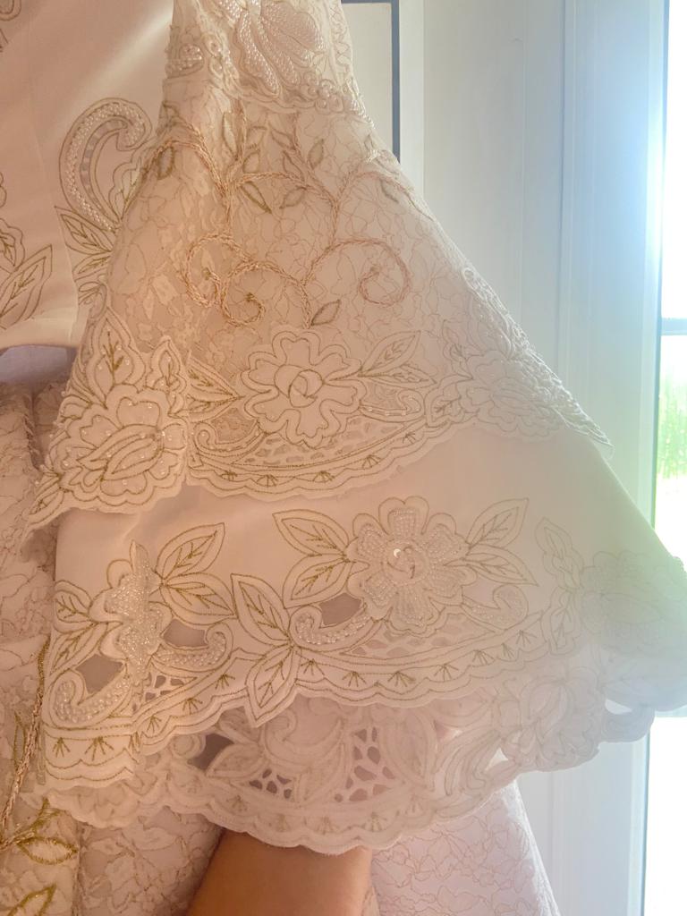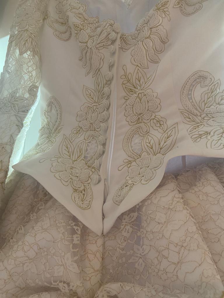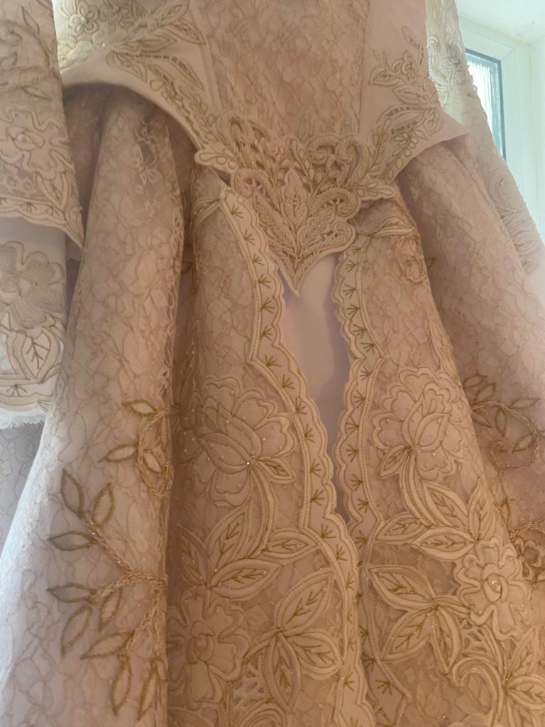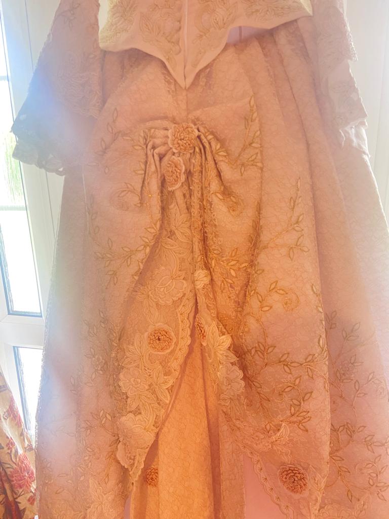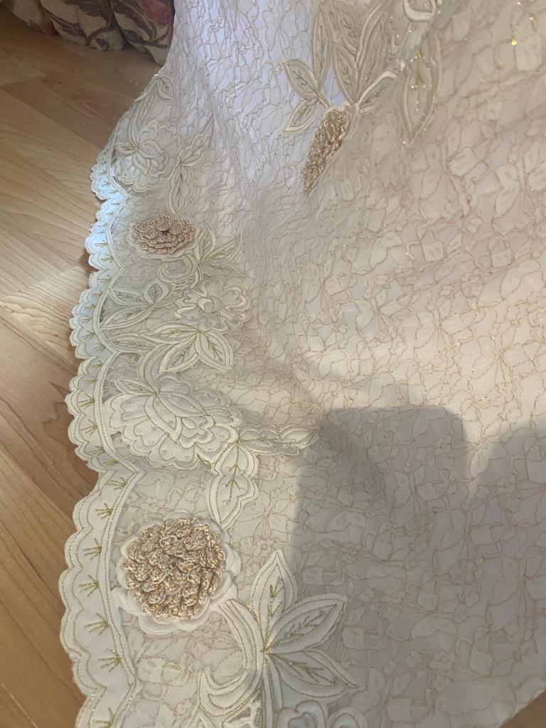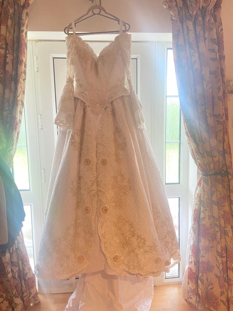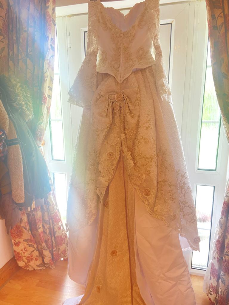 Beautiful bespoke wedding dress by now and forever bridal , worn once in pristine condition, professionally dry cleaned , will just need a steam from being in its protective bag . This dress is unique with its hand stitched lace and flowers . it’s a mix of ivory and gold , beautiful Victorian style . This dress was bought for 3,500 euro and as you can see it is worth it for all the intricate detail . Selling for 1,400 euro ono. This dress has to be seen in person the photos don’t do it justice , any viewings welcome .