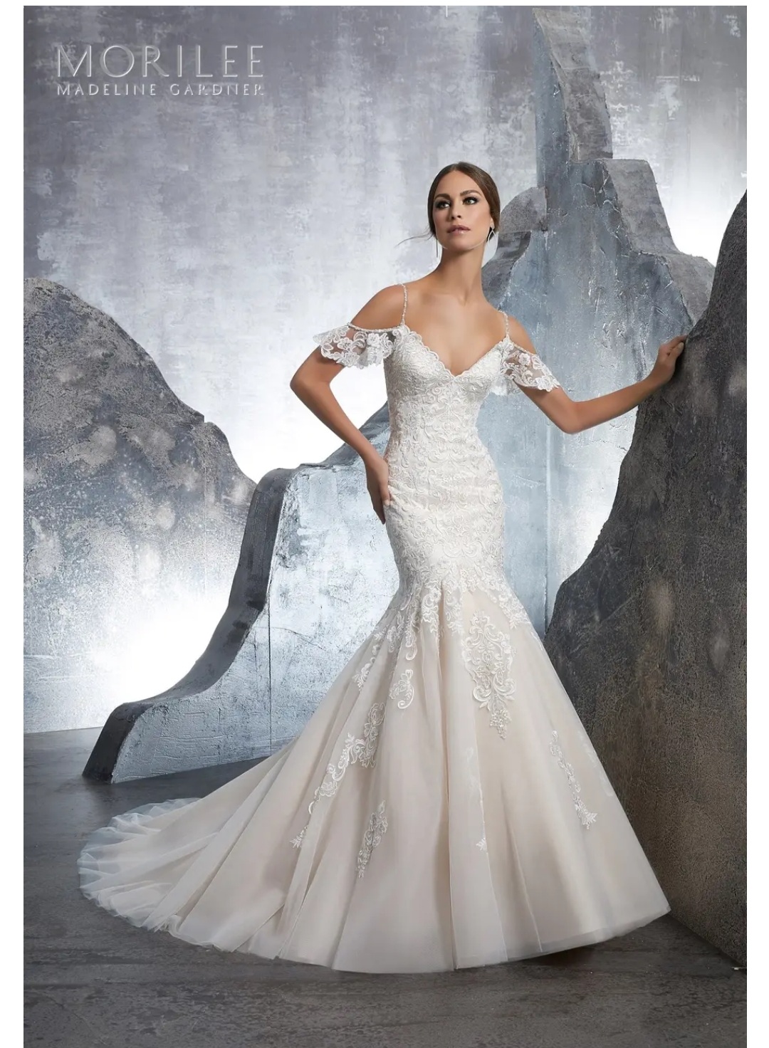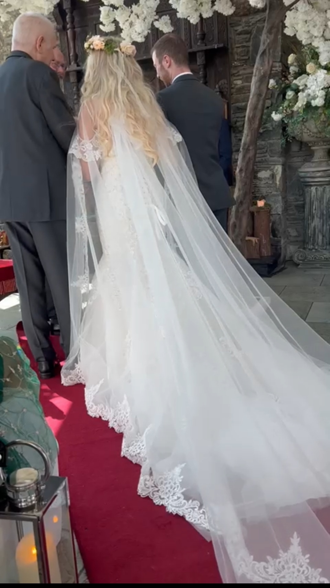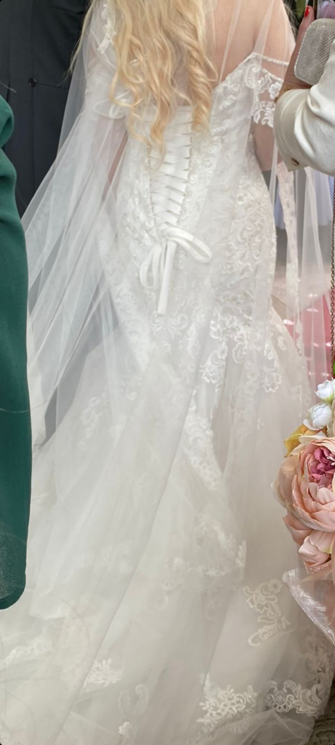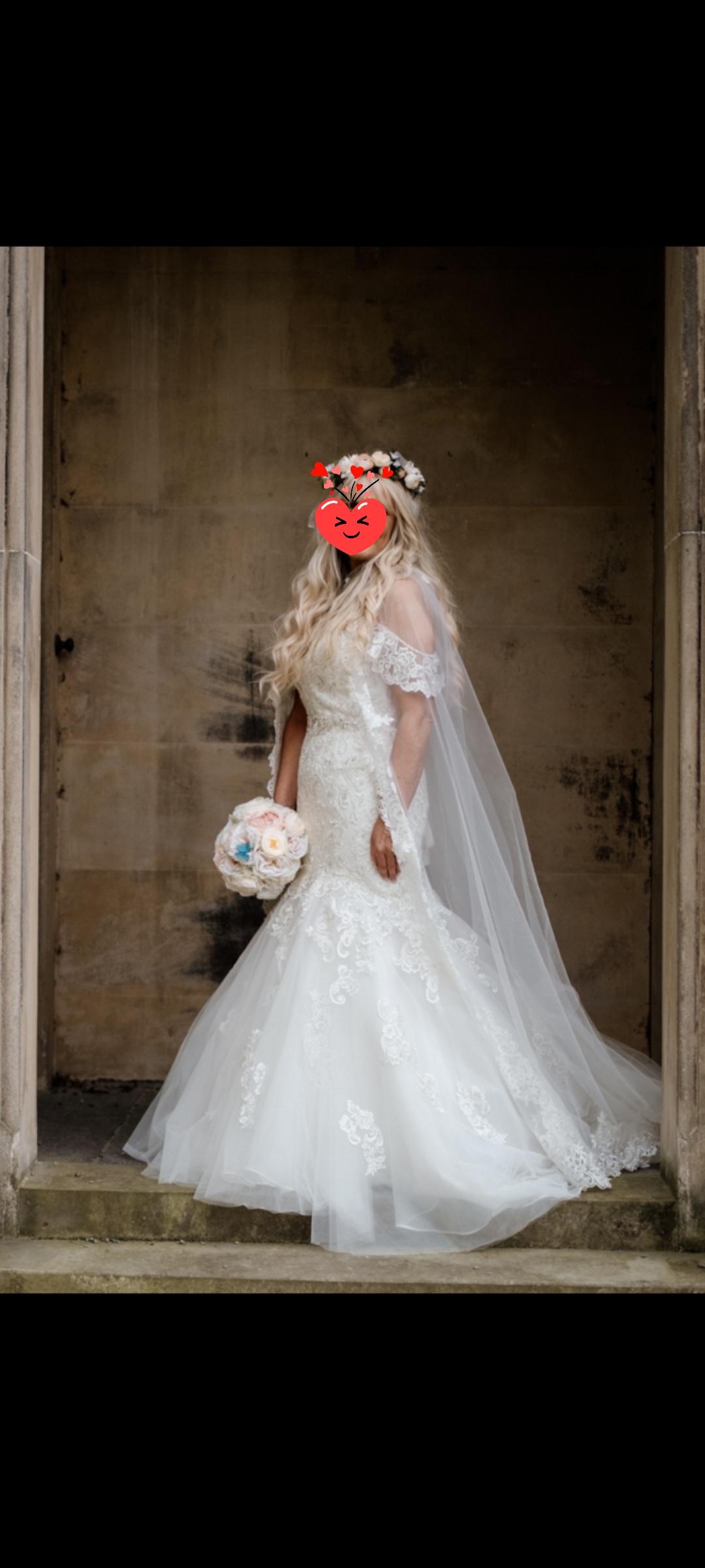 Stunning Mori Lee mermaids ivory wedding gown currently at dry cleaners should be ready within the next two weeks comes with stunning wide hooded ivory lace Cathedral length cape Veil. I only wore this dress for 1-hour for the ceremony the only alterations done to the stress was a light diamonte belt added which can be removed and also stitching to the scalloped lace that falls across the upper arm. Dress States it’s a size 10 but would fit due to the corset back up to a size 14. I also have the beautiful Brides bouquet in silk flowers with matching floral crown. all will come with the dress for asking price!