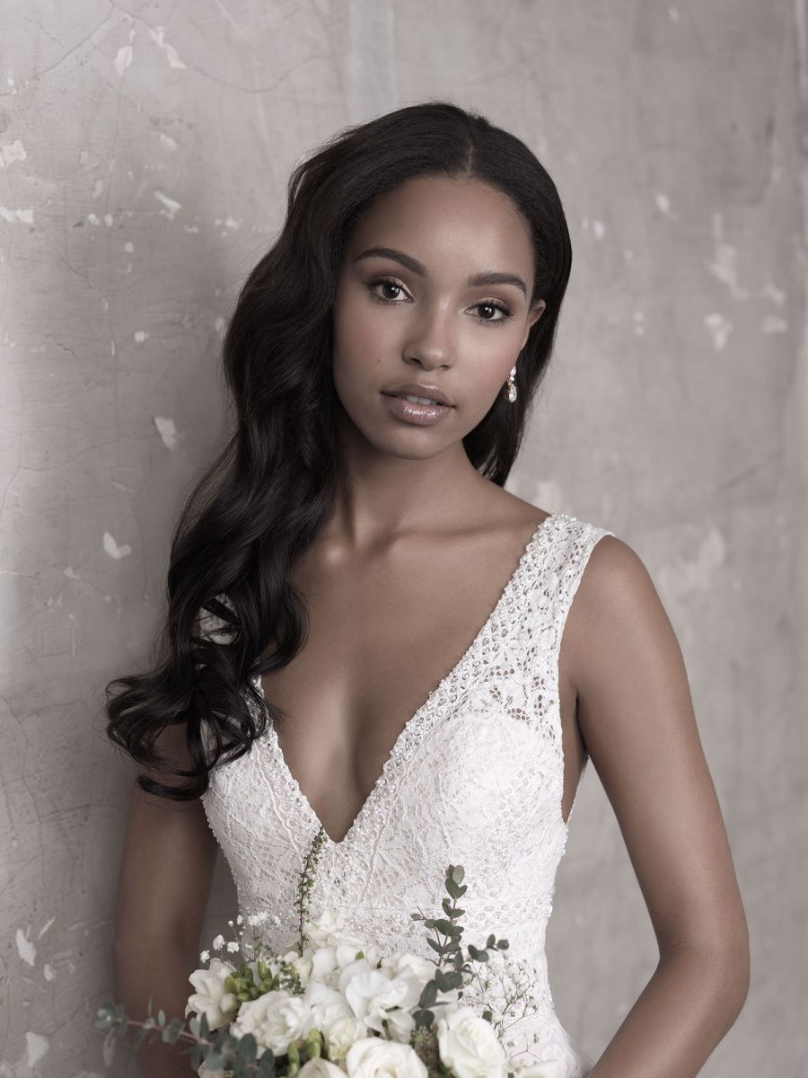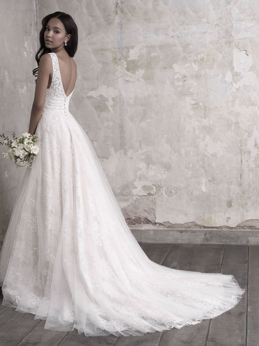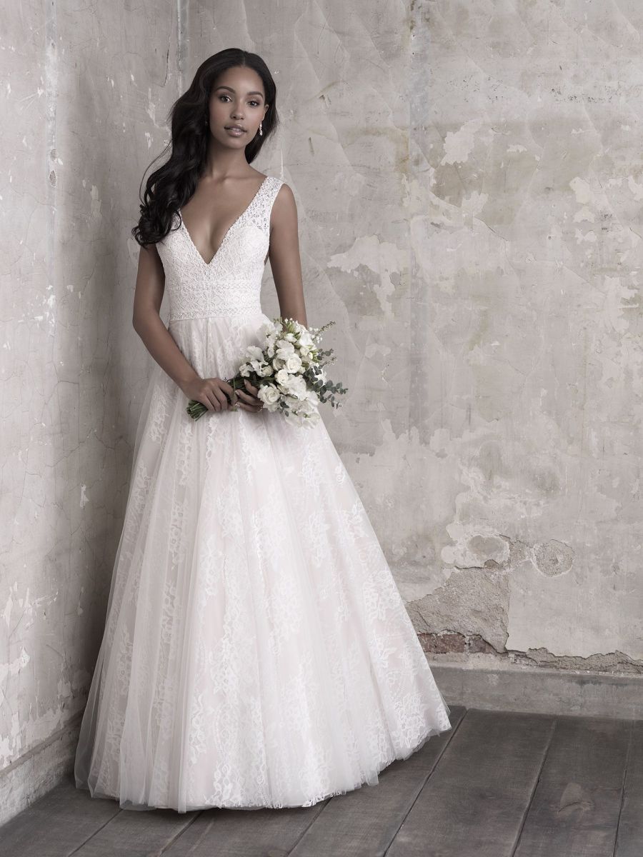 breathtaking Madison James MJ463 Plunging V-Neckline Lace A-Line Wedding Dress! This gorgeous gown is crafted using a playful combination of luxe lace, tulle, and English net for a beautifully textured appearance that’s still sleek and modern. Designed with a figure-flattering a-line silhouette,piece pairs a fitted bodice and a voluminous flared skirt for a slimming proportion-play that looks fabulous from every angle. A plunging v-neckline is accented by tapered illusion lace straps that wrap around into a deep scoop back.An embellished band at the natural waistline adds a further figure-cinching effect that accents feminine curves perfectly. The full-length pleated lace skirt with a playful tulle overlay completes the look.