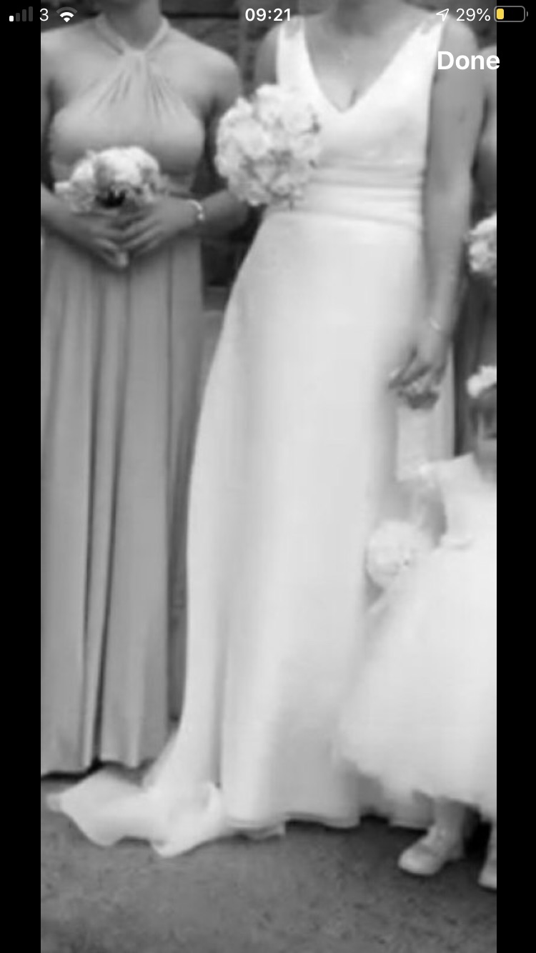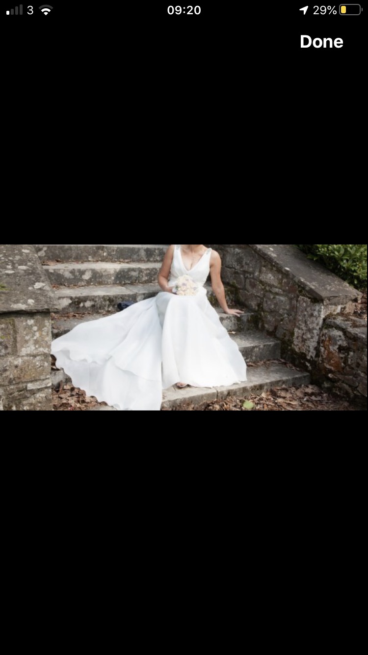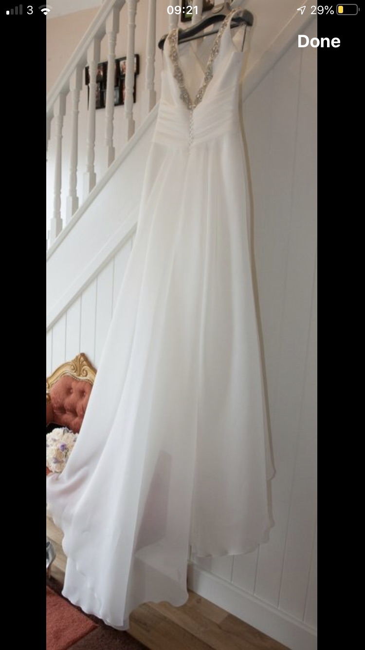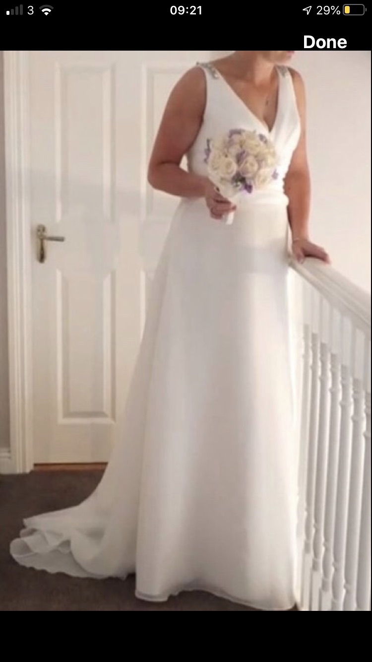 Wedding Dress made with organza material, to fit a size 12/14. Added embellishments at the back. Very light and comfortable to wear. Bow at back not included.