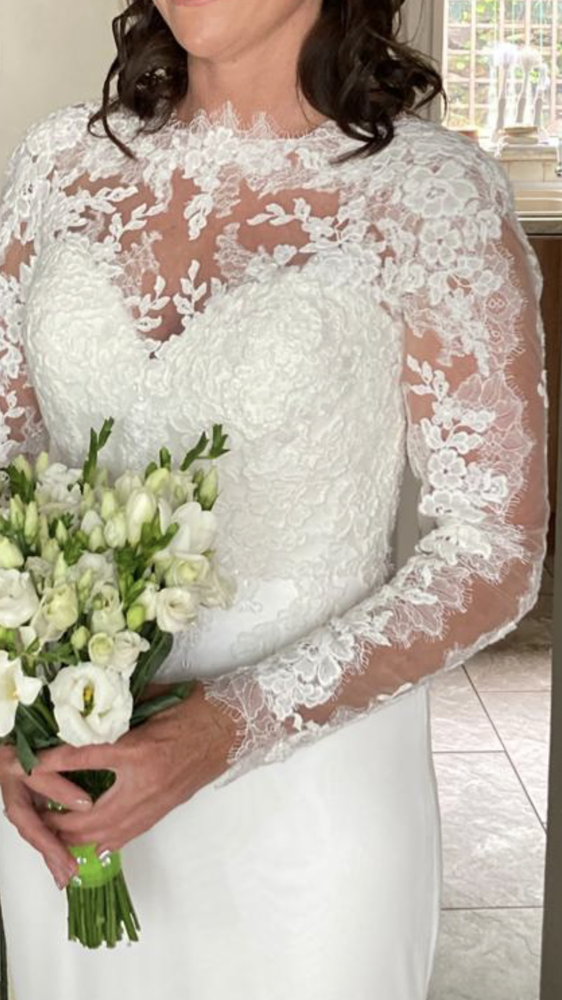 Alterations to hem length.sleeves & hips taken in. Bustle added to train.
