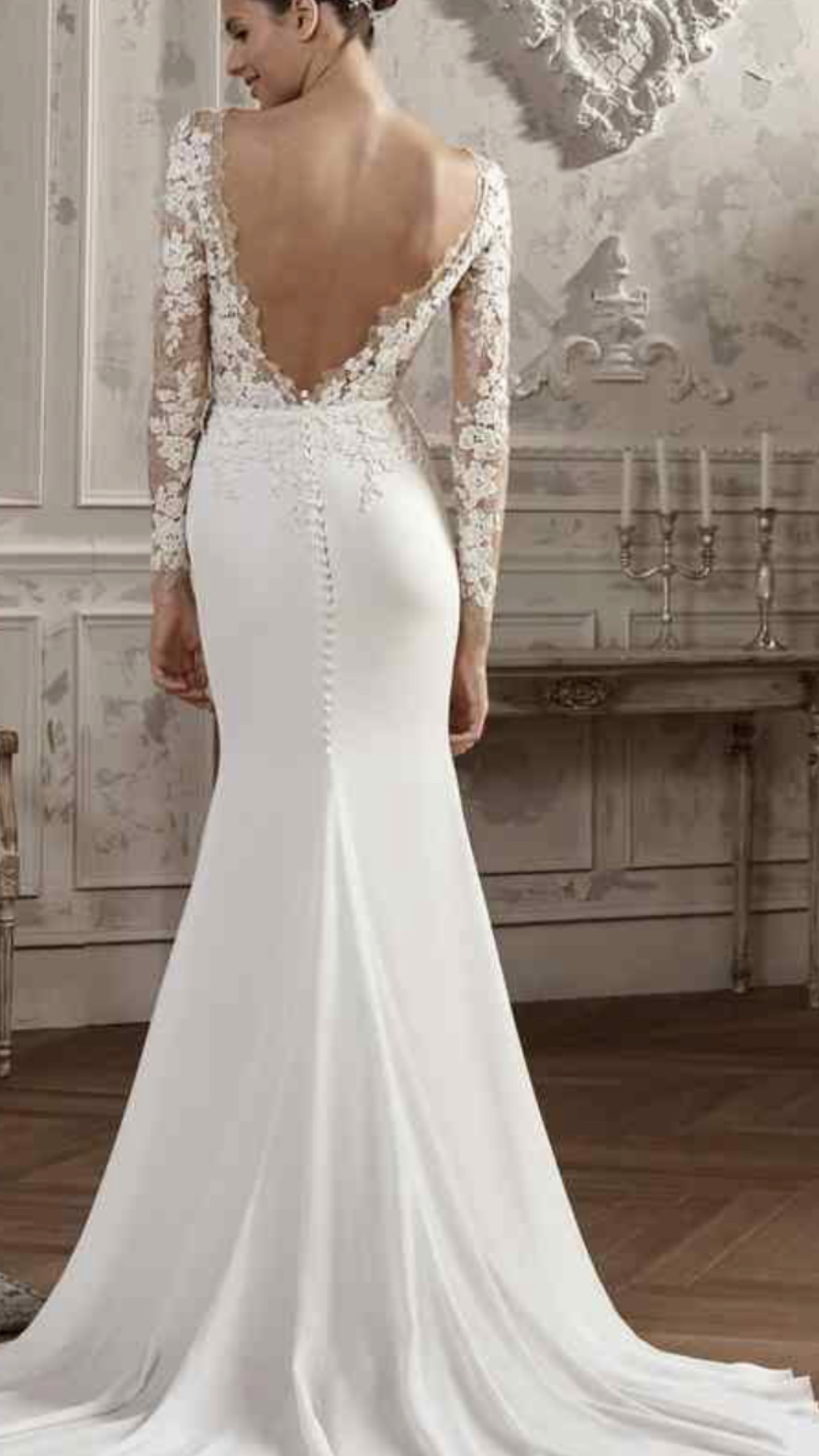 Mermaid silhouette with sleeves, chiffon tulle & embroidery thread & beads, bateau neckline. Detachable lining bodice. Lace melts into classic & flowing fabrics to create highly elegant contrast effects.