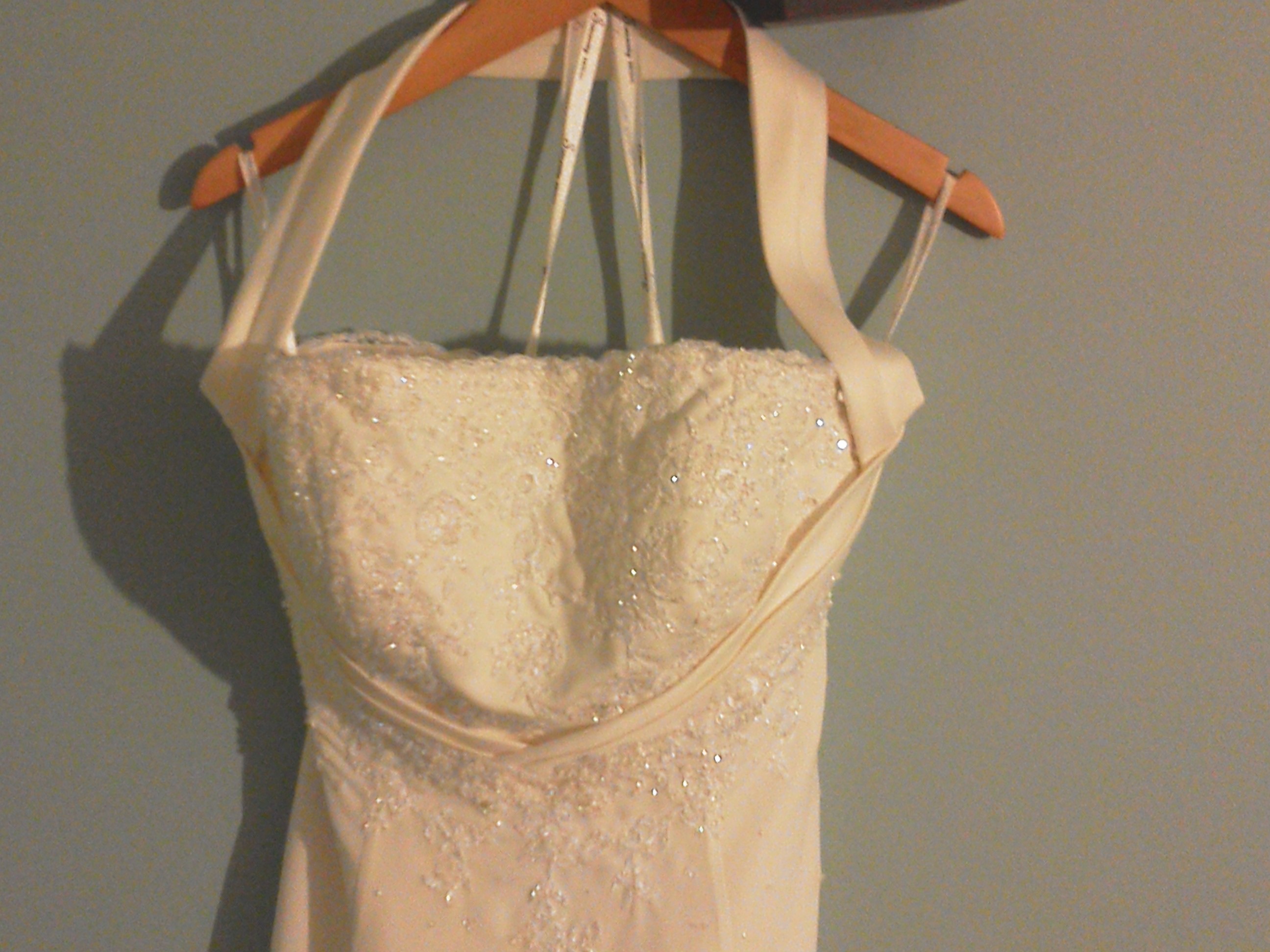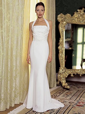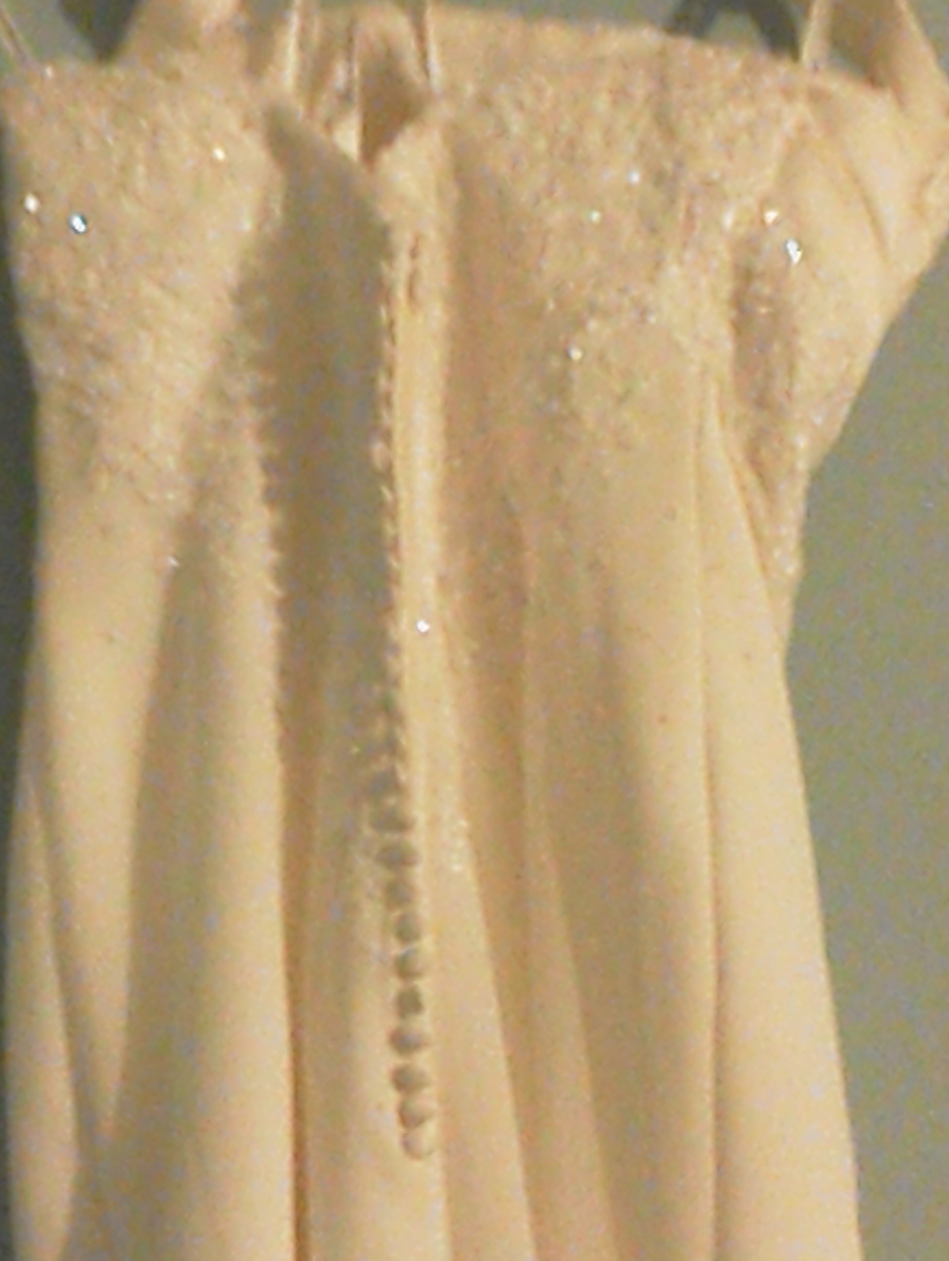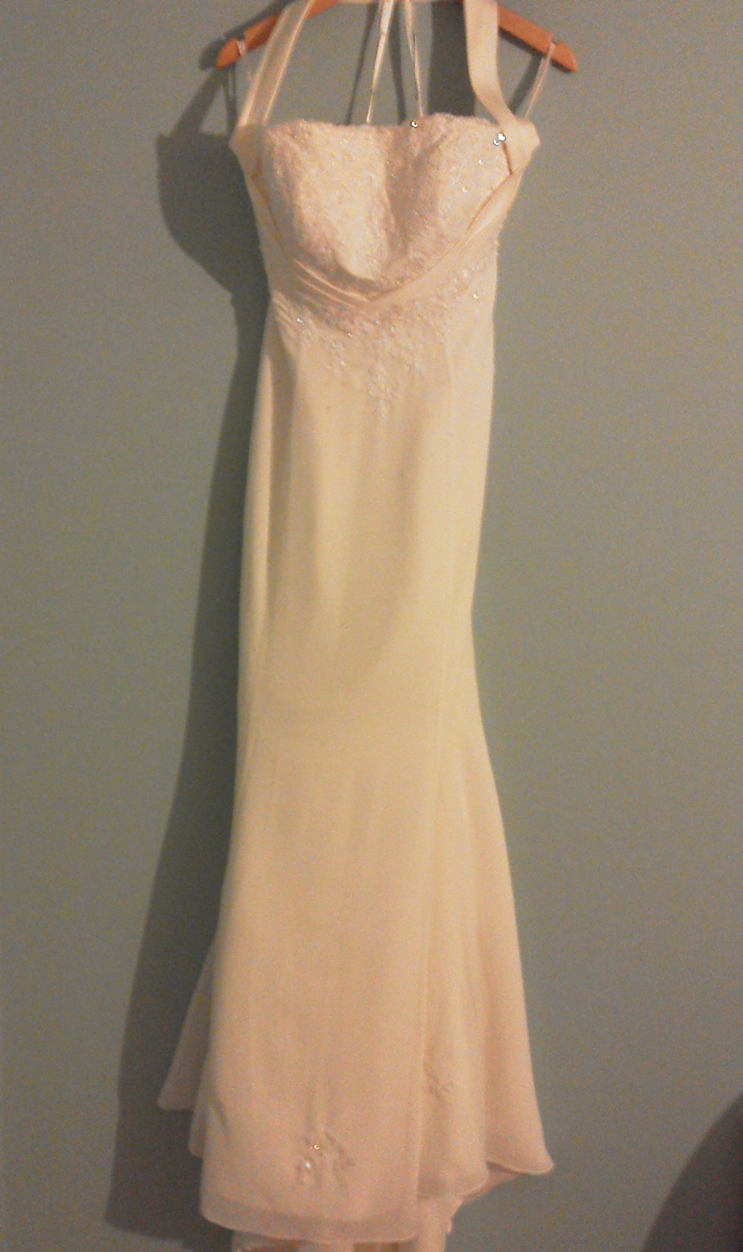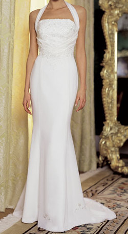 It is a mermaid style dress with a beaded pleated empire waist, made from chiffon and satin with a halter effect neckline with detachable halter straps. Zip fastening back with satin buttons. It extends to the floor with a sweep train.