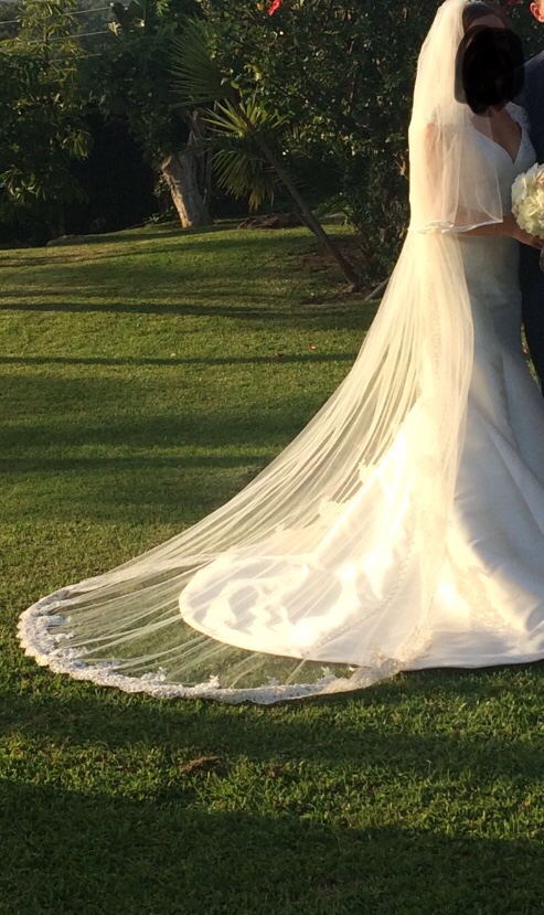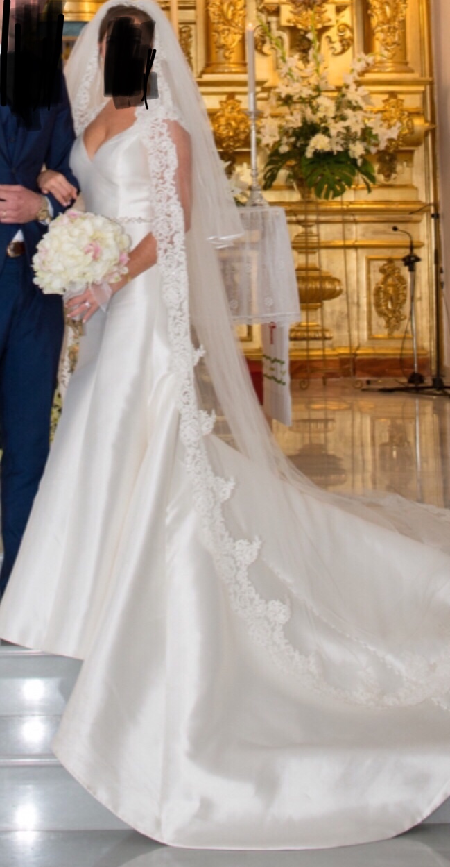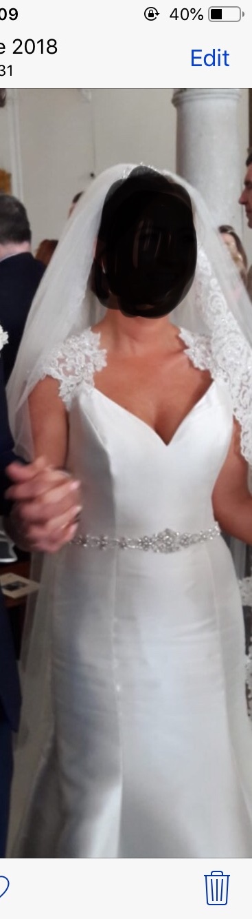 A fit and flare, v-neck mikado gown with a beaded waistband. Lace edged Keyhole open back and lace cap-sleeves. Bought in 2018 in McElhinneys. Worn once. Dry cleaned and in perfect condition. Lace edged 2 tier cathedral veil also included which was bought separately for €500.