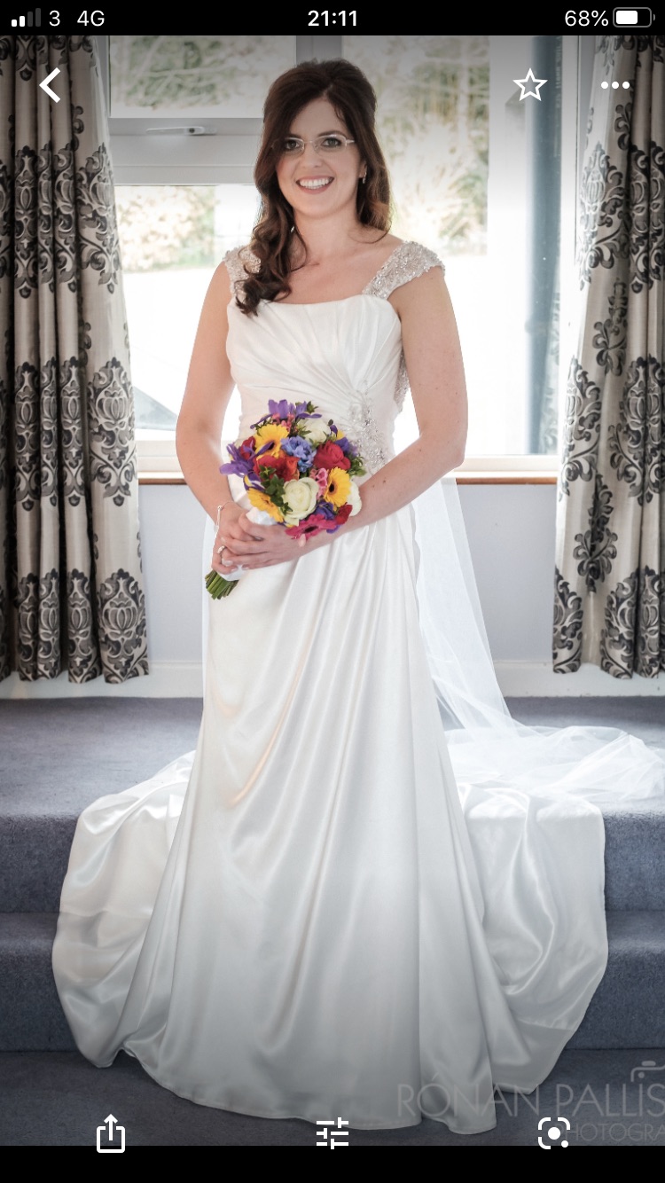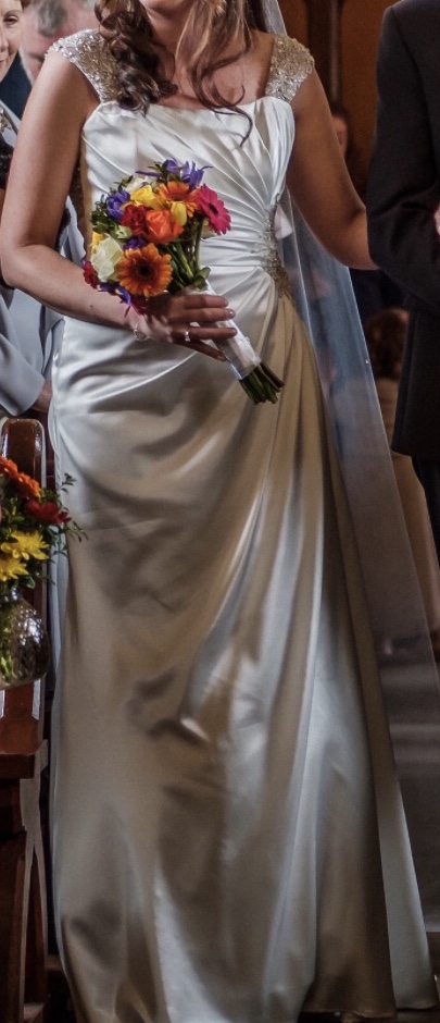 Sleeveless soft duchess satin fit and flare gown with crystal encrusted hand-beaded straps, directionally draped bodice, flattering ruching at the waist with matching beaded accent, and train, train was shortened. Lovely low V back edged in the same crystal-encrusted hand-beading. Supportive boning in the bodice helps with the look and makes the dress very comfortable.