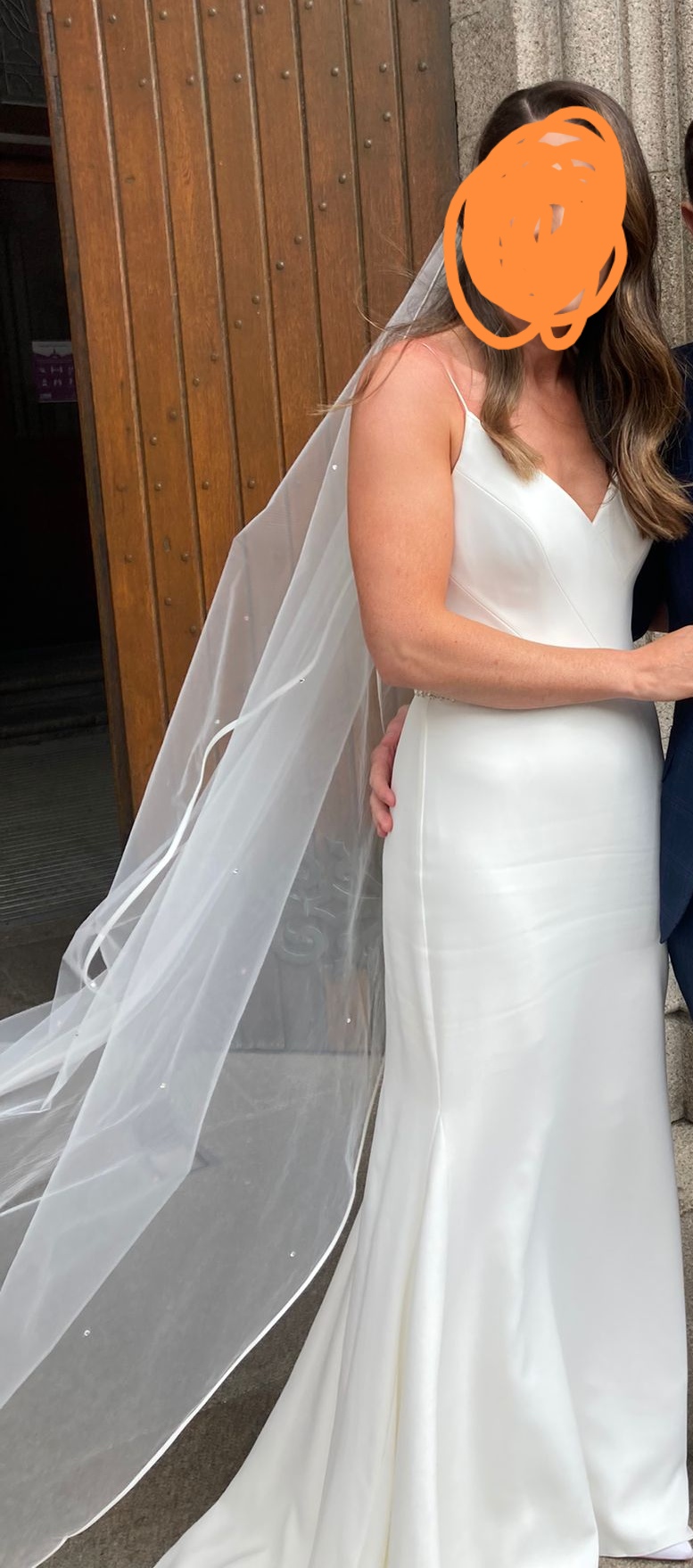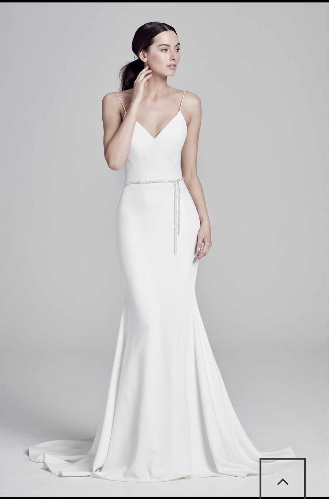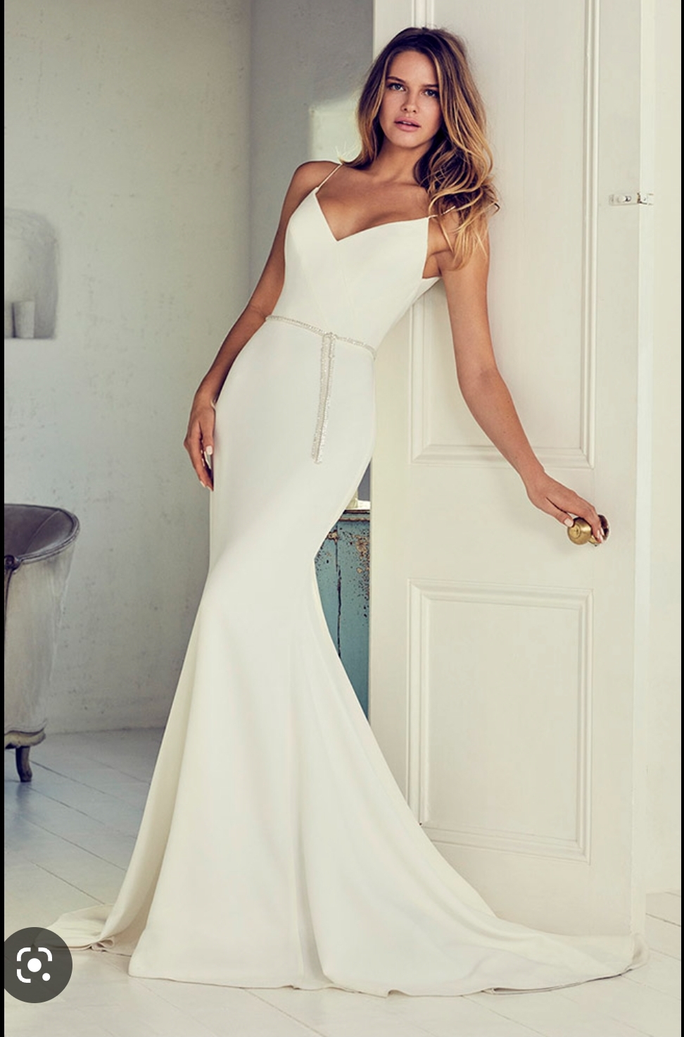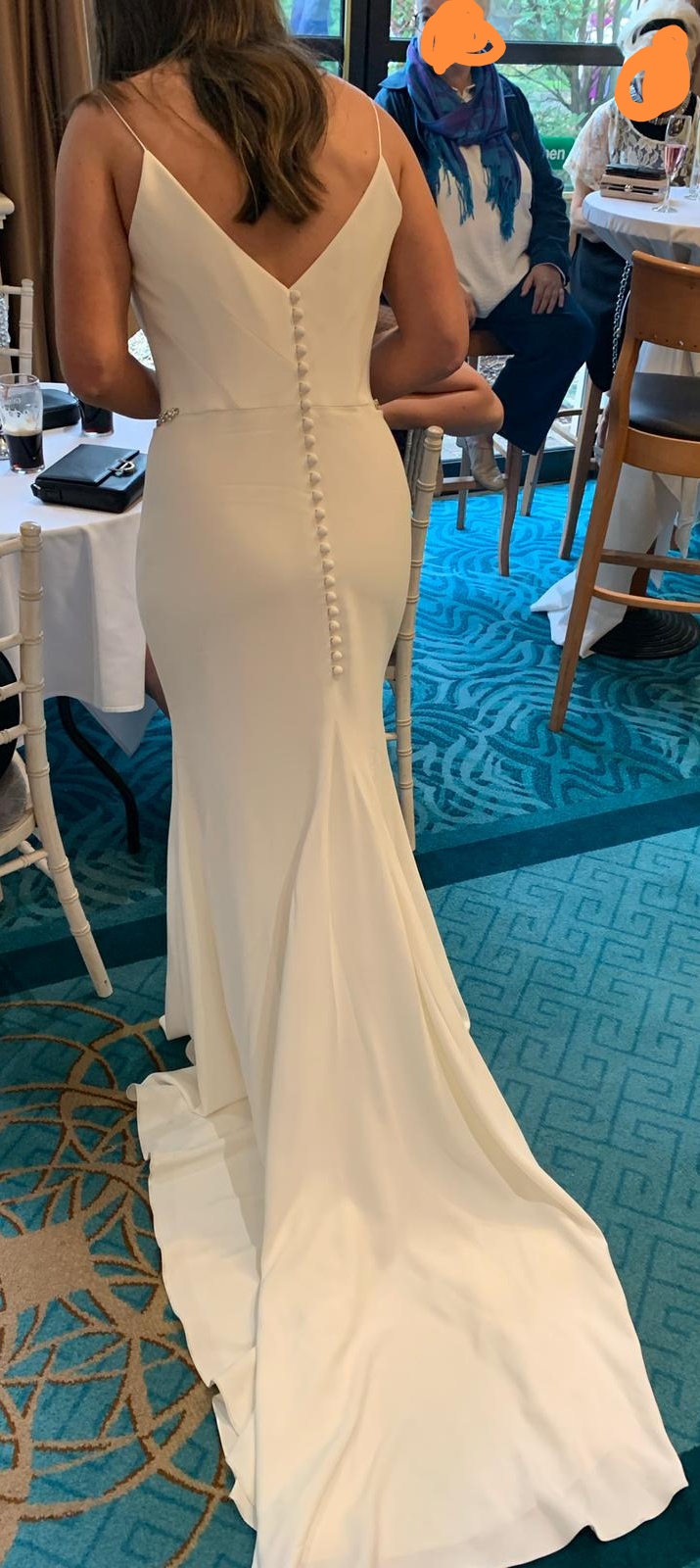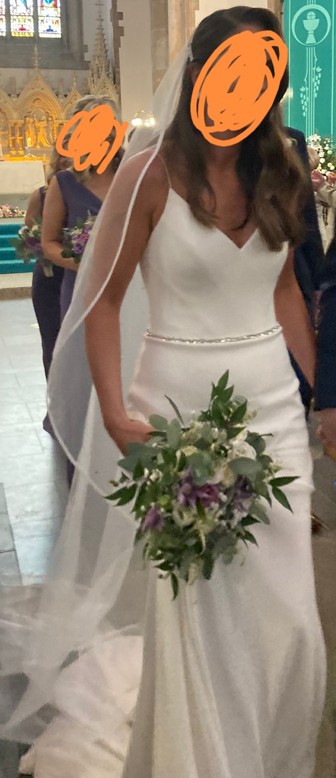 The stunning Suzanne Neville ‘Venus’ wedding dress is made from Italian stretch crepe. It is utterly cool and modern and breathtakingly simple. The signature Suzanne Neville corseted bodice features thin ballerina straps and the skirt kicks out in a dramatic fishtail. This dress has been worn once, has been professionally dry cleaned and is in immaculate condition. Worn by a highstreet size 10 with the only alterations being to the length to fit 5’8″ wearing 3 1/2 inch heels. Diamante belt has been added but can easily be removed/replaced with own by a seamstress. Can be posted/shipped for extra cost.