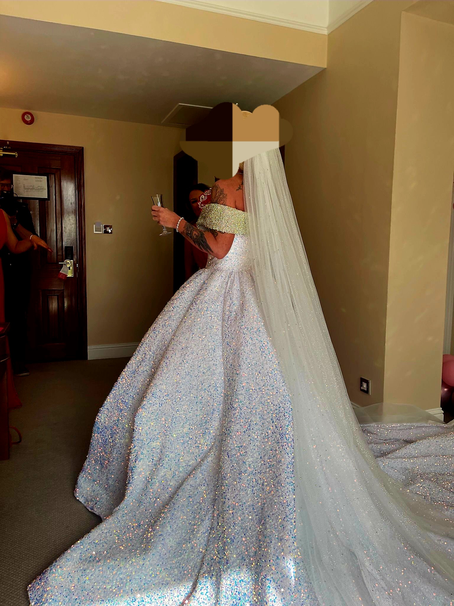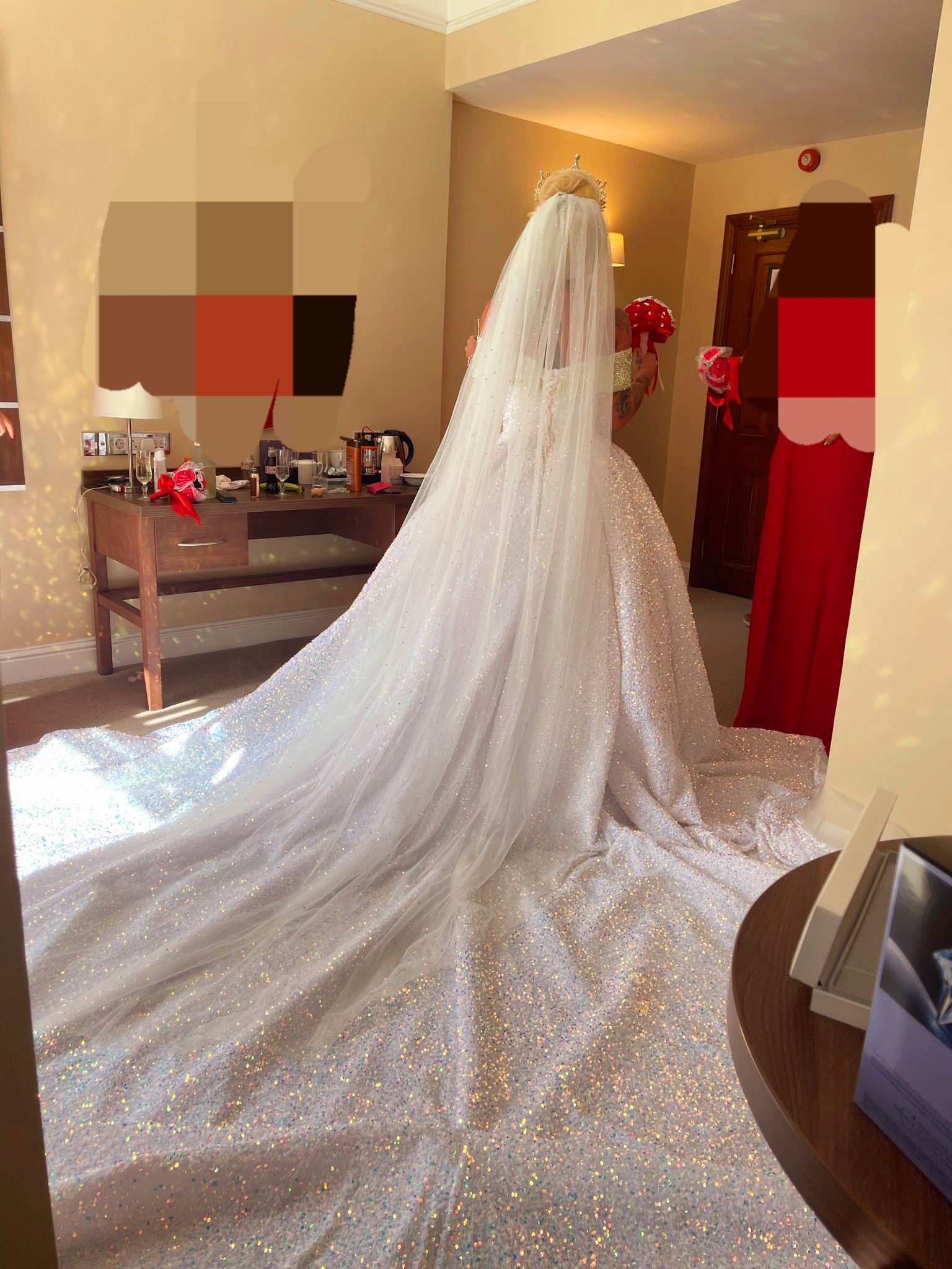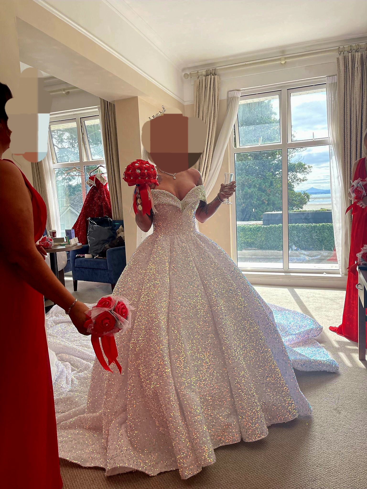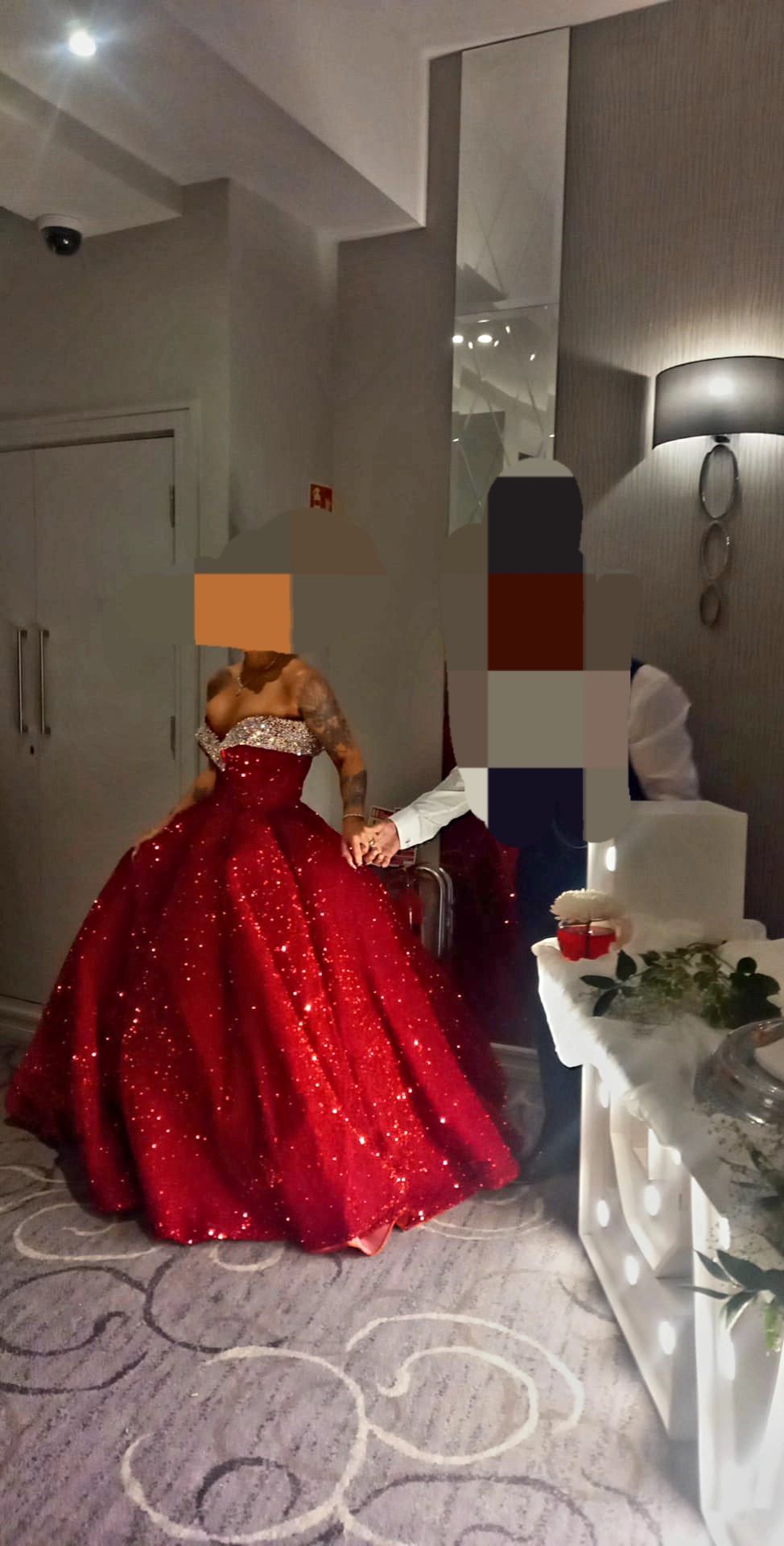 Handmade white swaorski wedding dress corset style top with sweetheart look covered in swaorski diamonds also second dress in red without train also same style corset with swaorski diamond sweetheart top half I would say this would fit a size 8 to 12 due to been a corset style as you can loosen or tighten the back also has 2 veils hand made pictures available upon request as 1st veil I didn’t feel was for me so got a different one made
