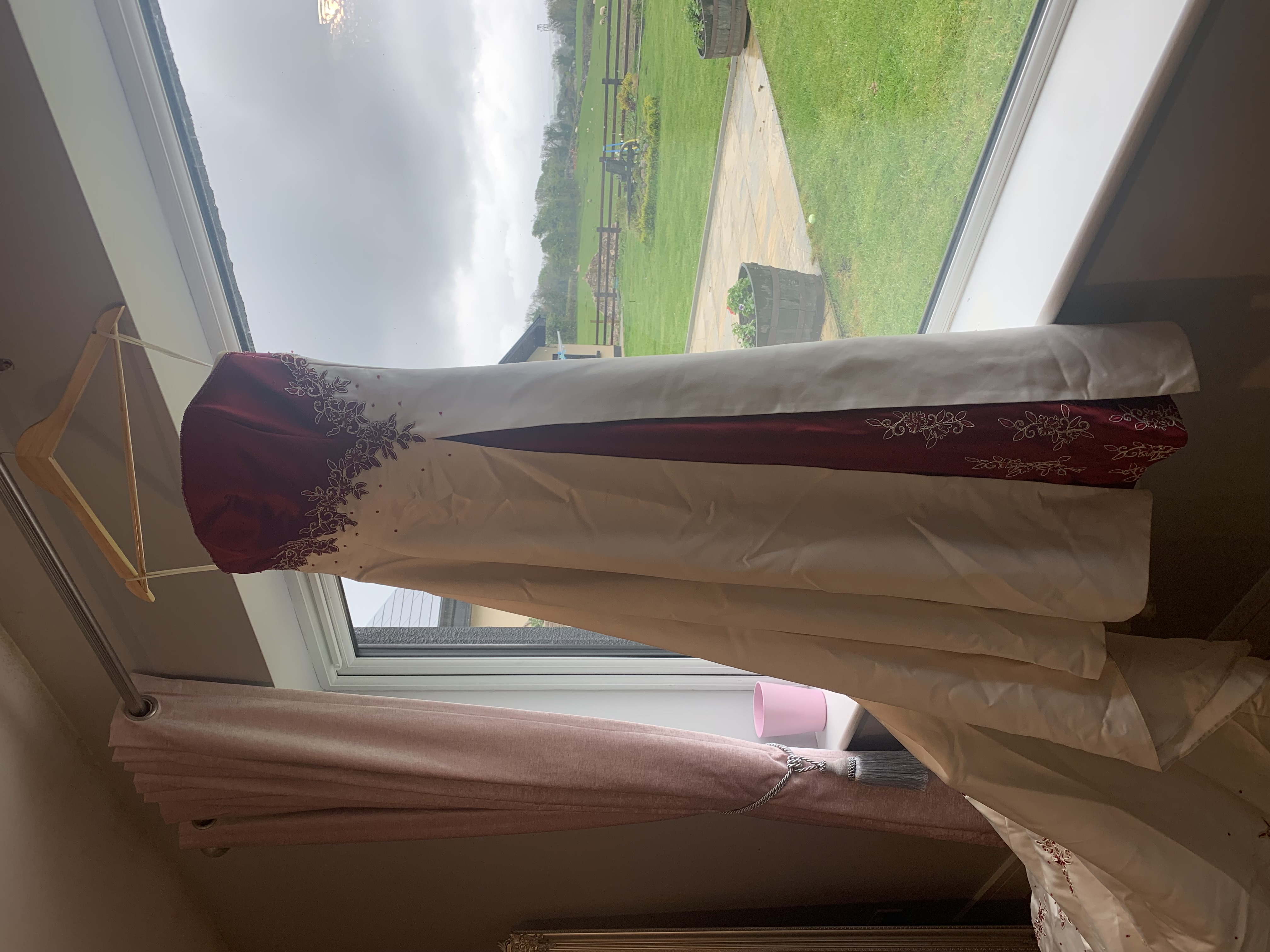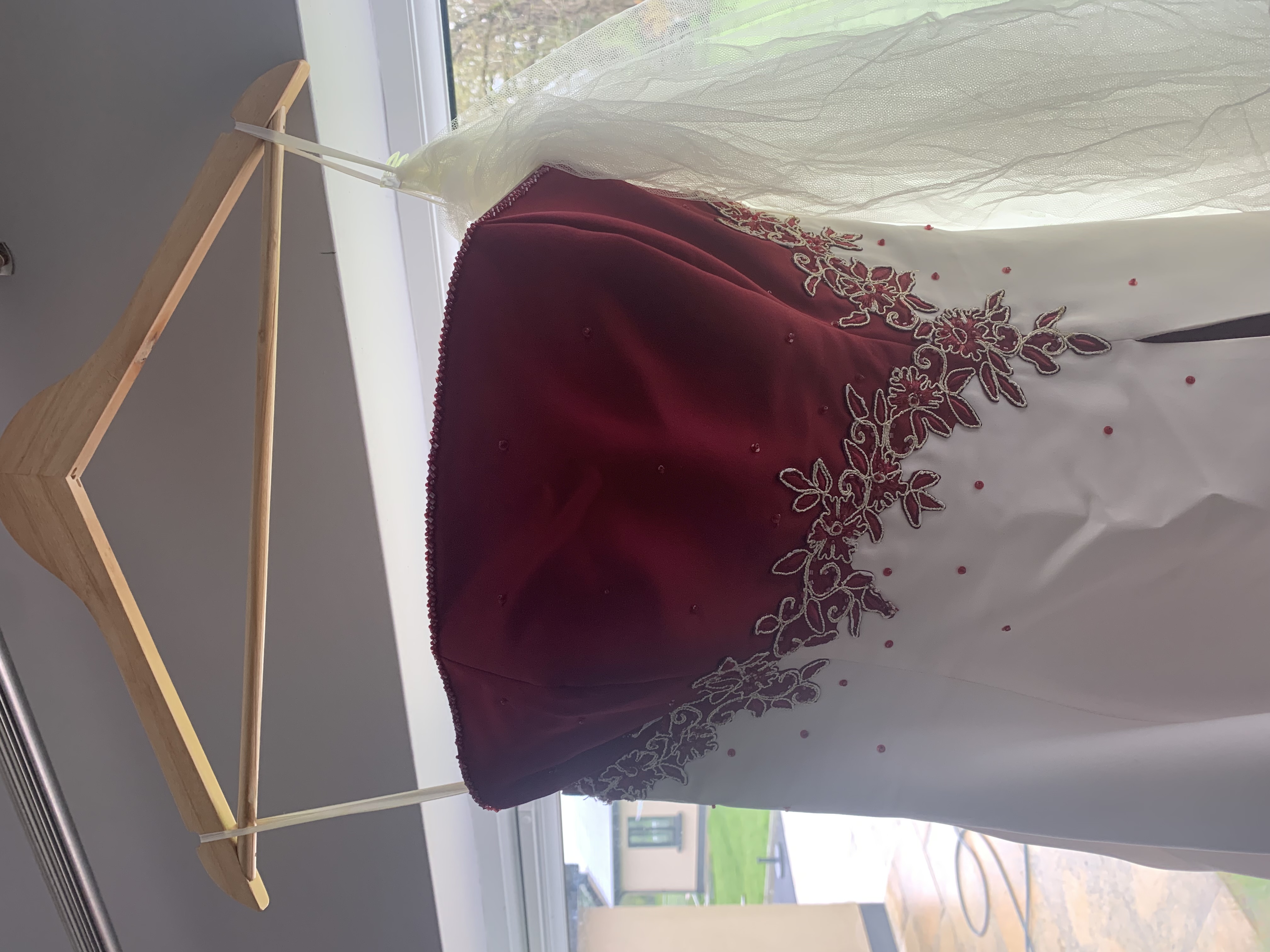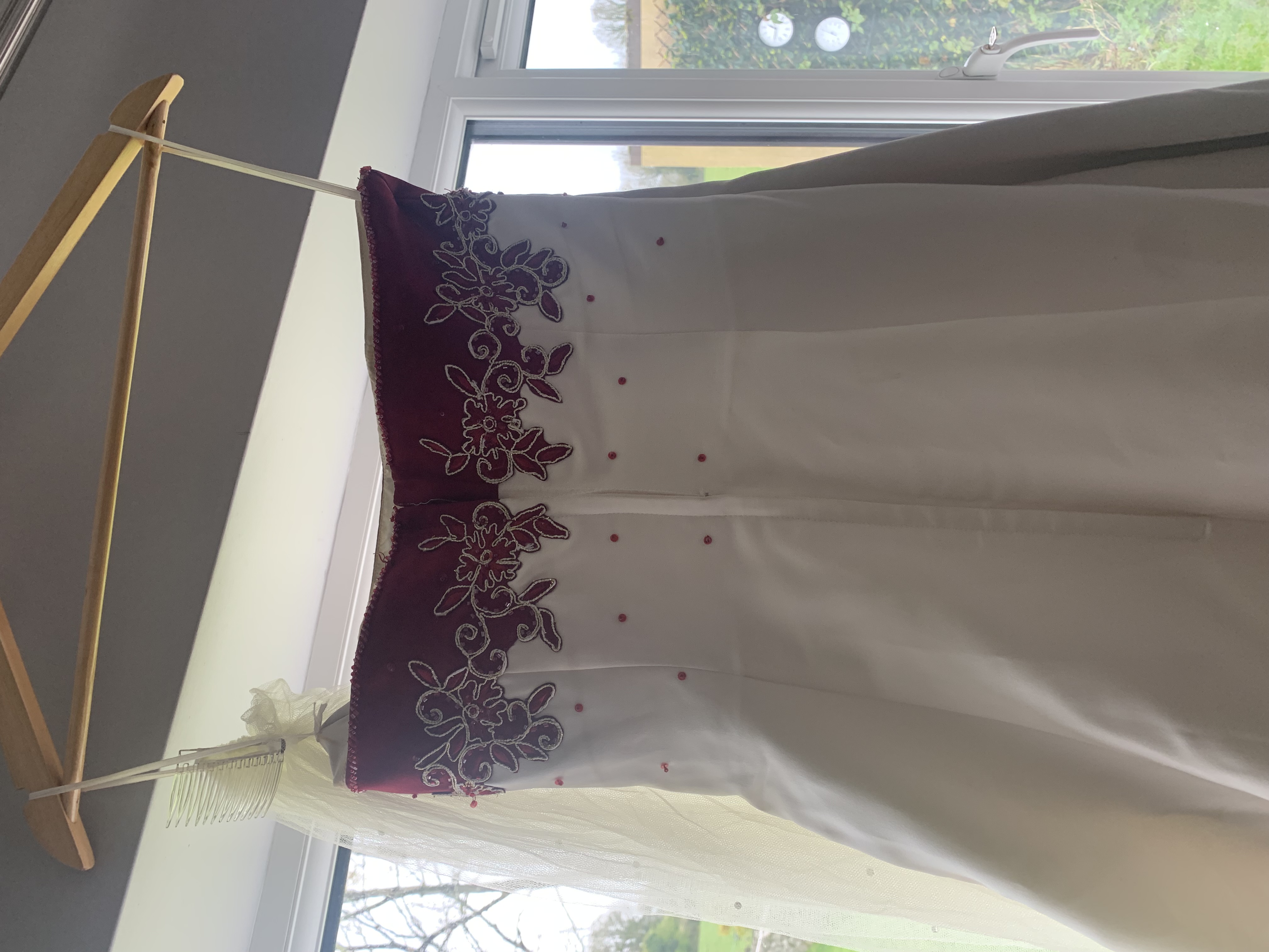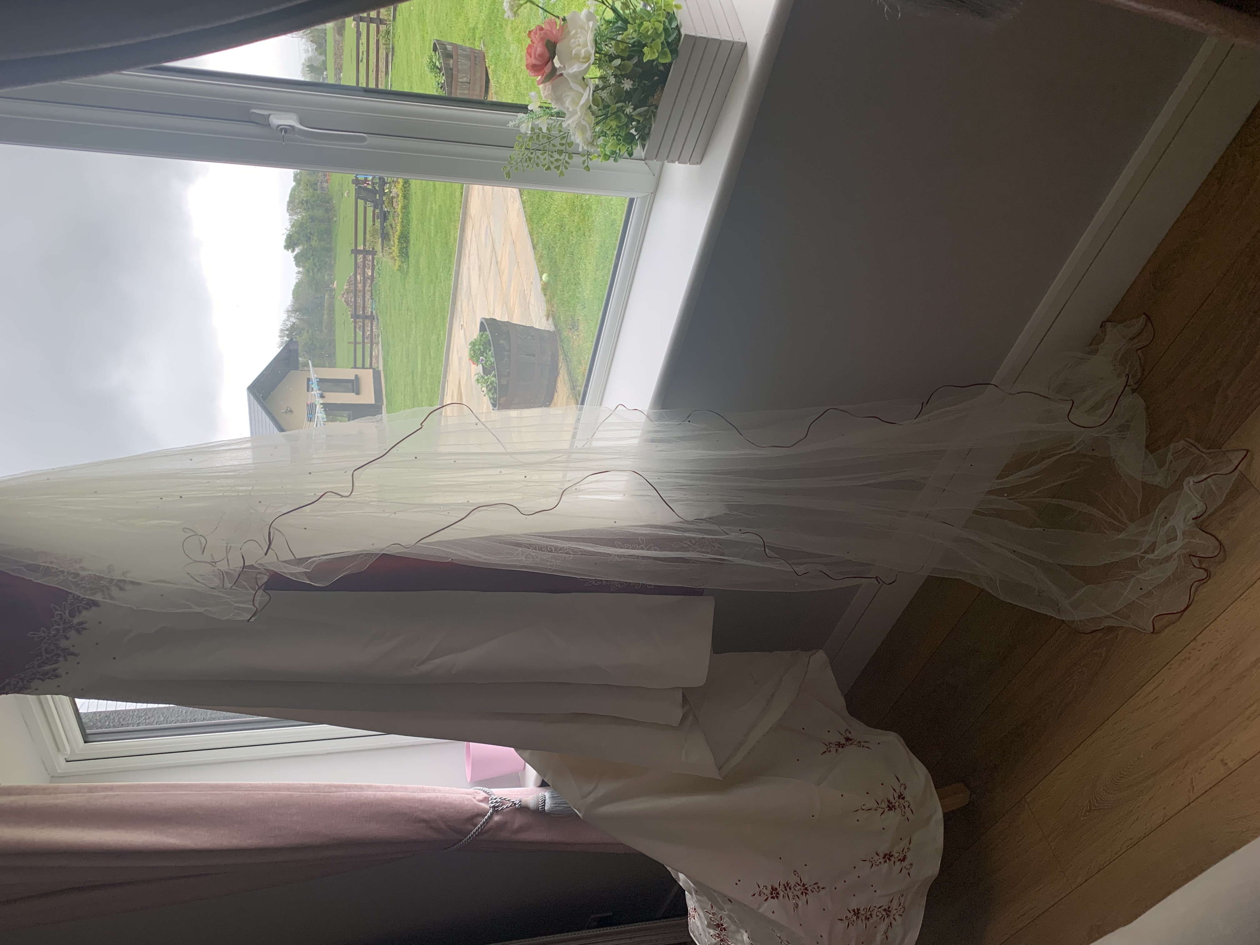 Gorgeous two tone dress with train that can be hooked up for dancing. Matching full length veil with matching trim all round. Not cleaned which is reflected in the price.