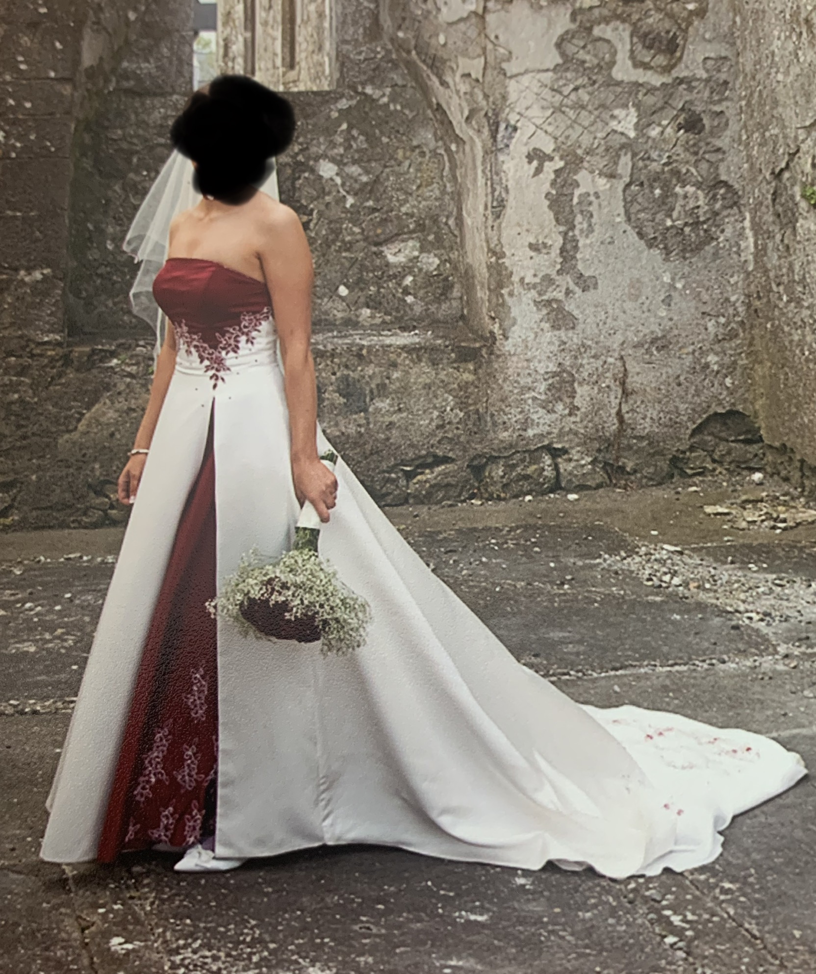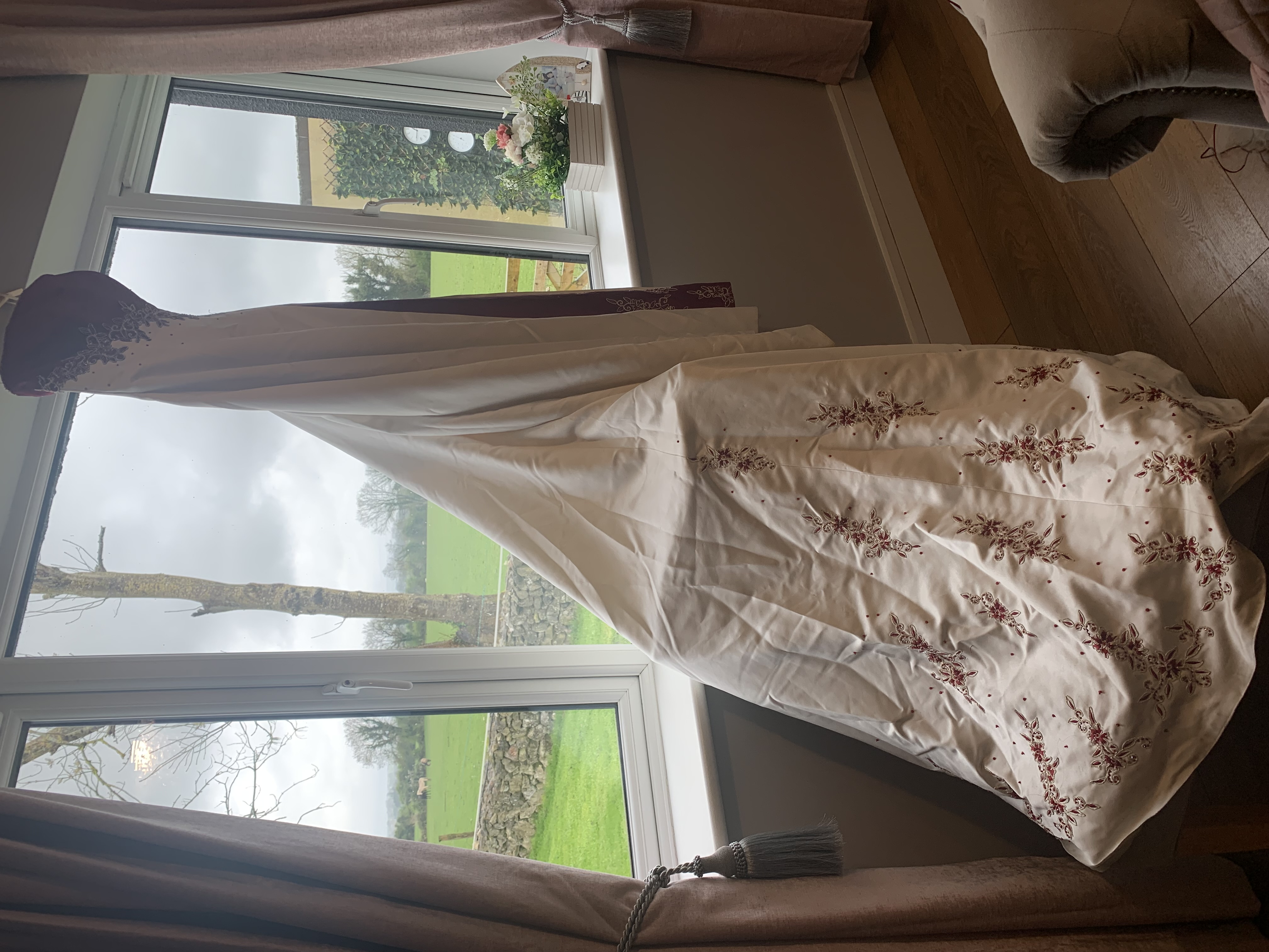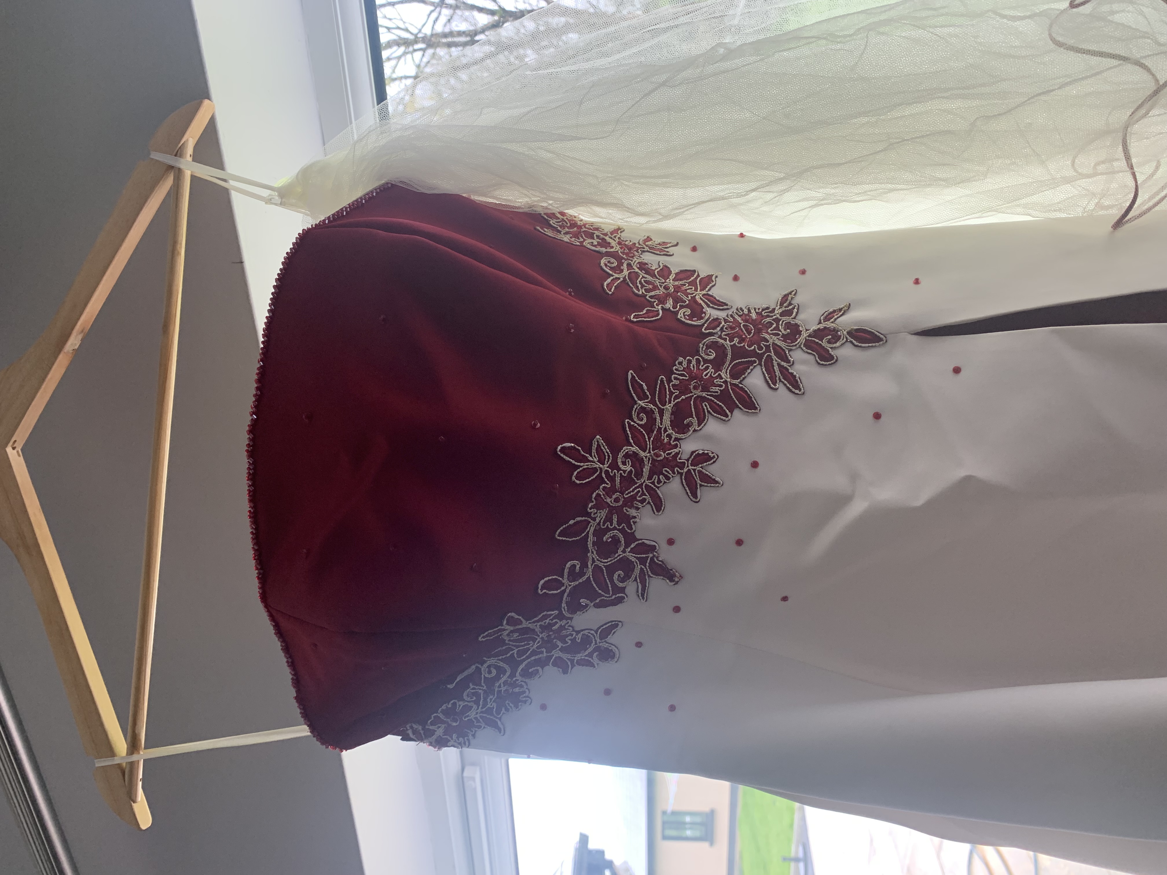 Gorgeous two tone dress with train that can be hooked up for dancing. Matching full length veil with matching trim all round. Not cleaned which is reflected in the price.