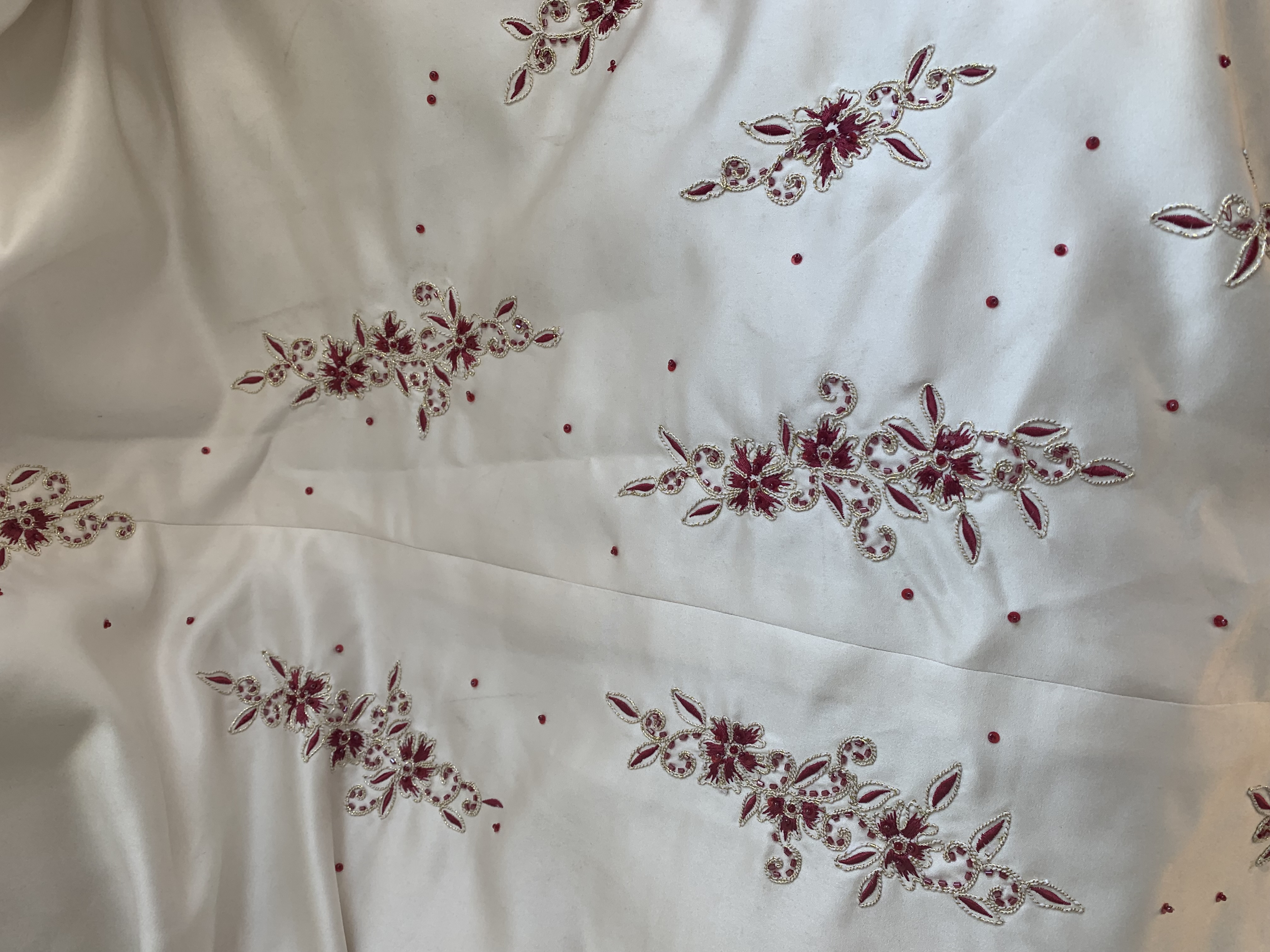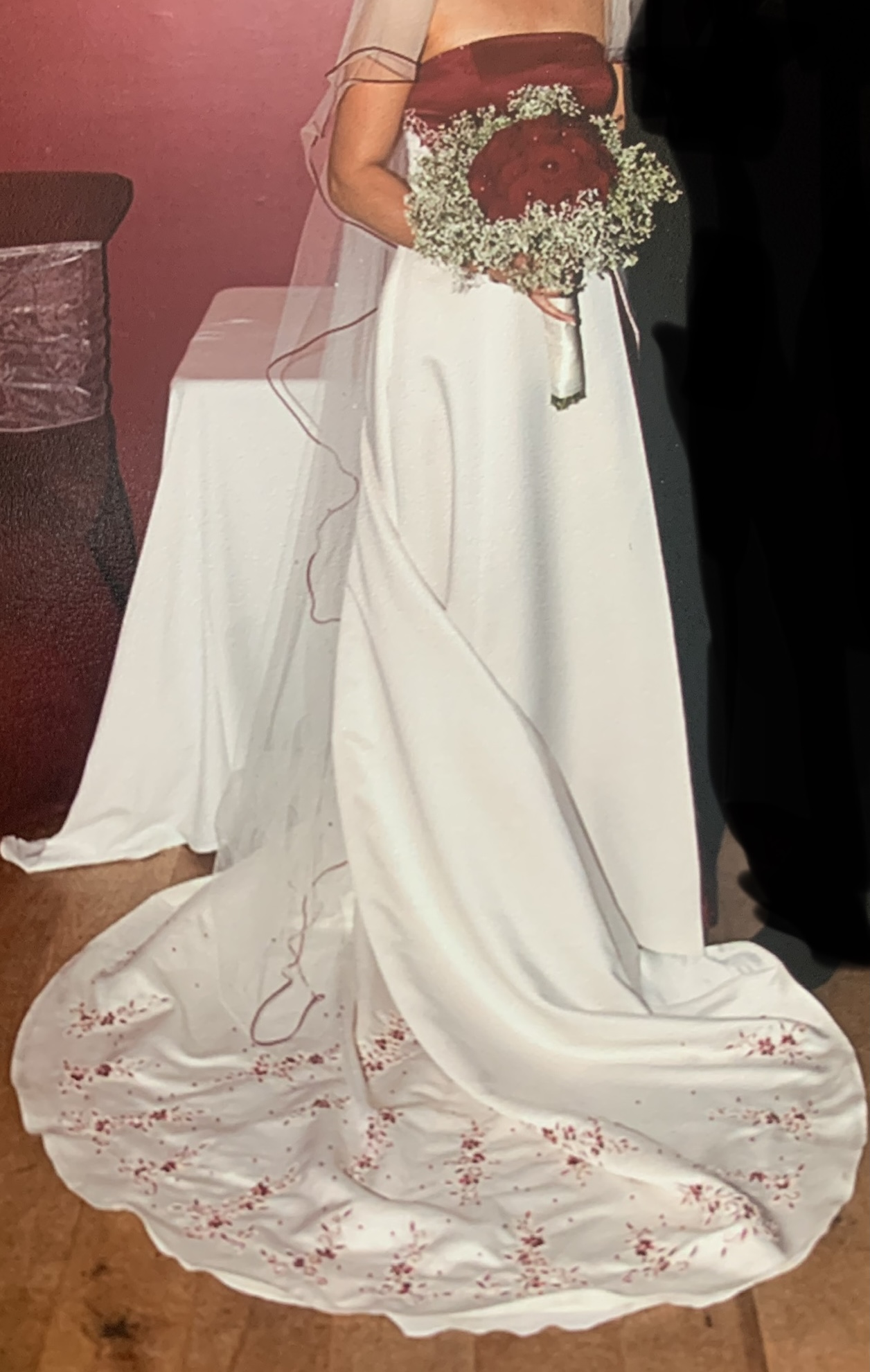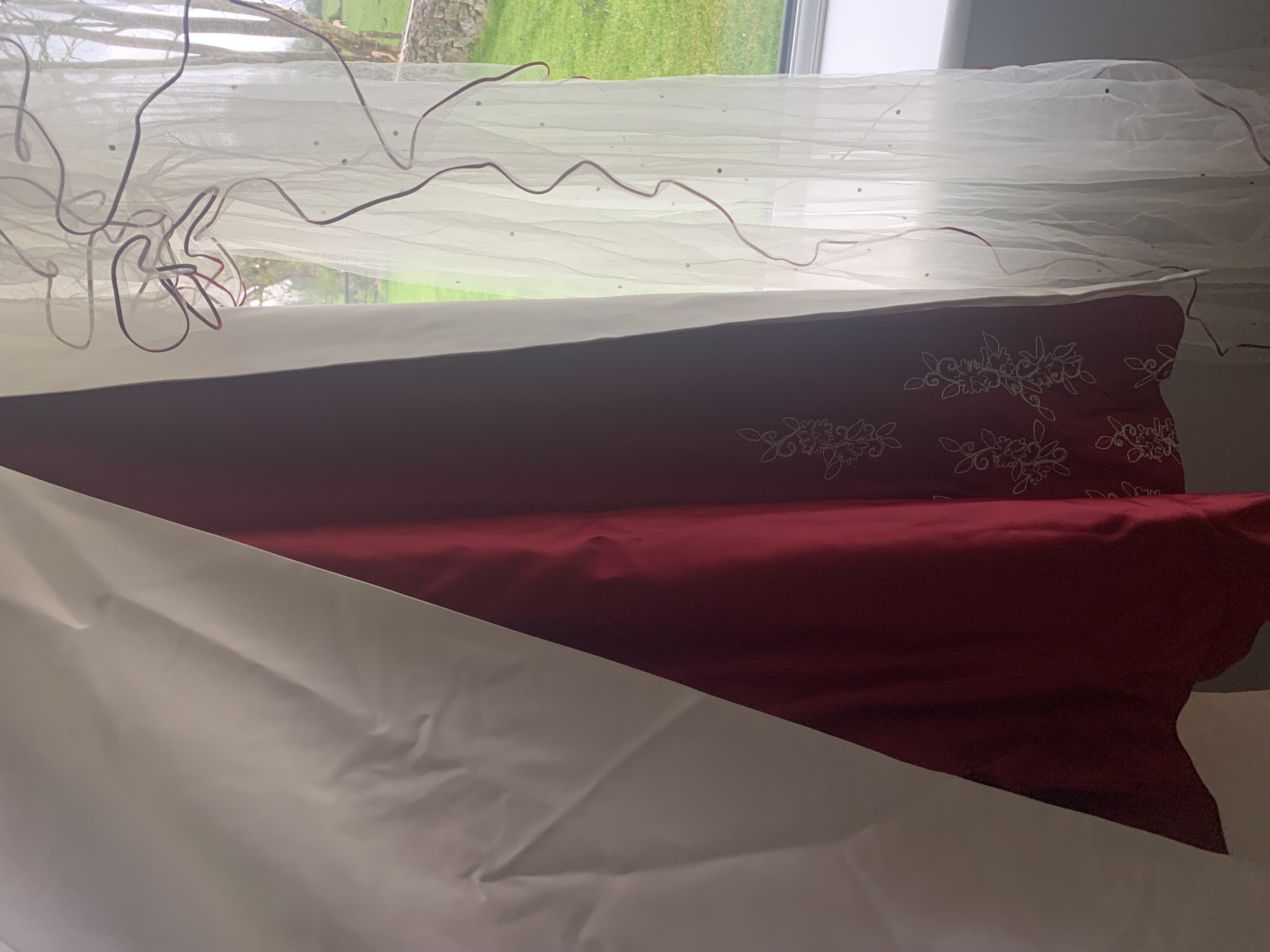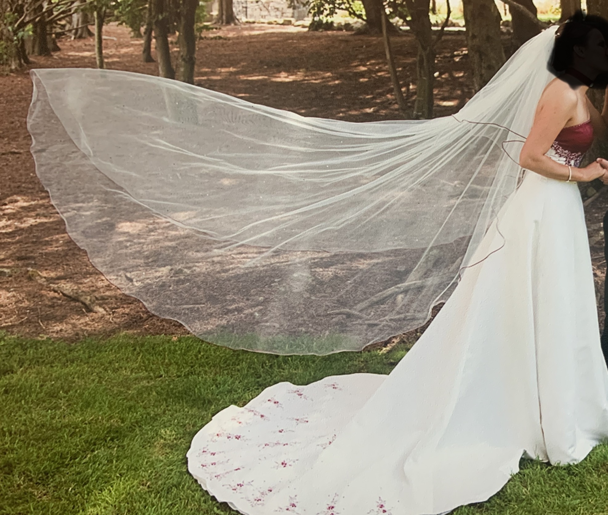 Gorgeous two tone dress with train that can be hooked up for dancing. Matching full length veil with matching trim all round. Not cleaned which is reflected in the price.