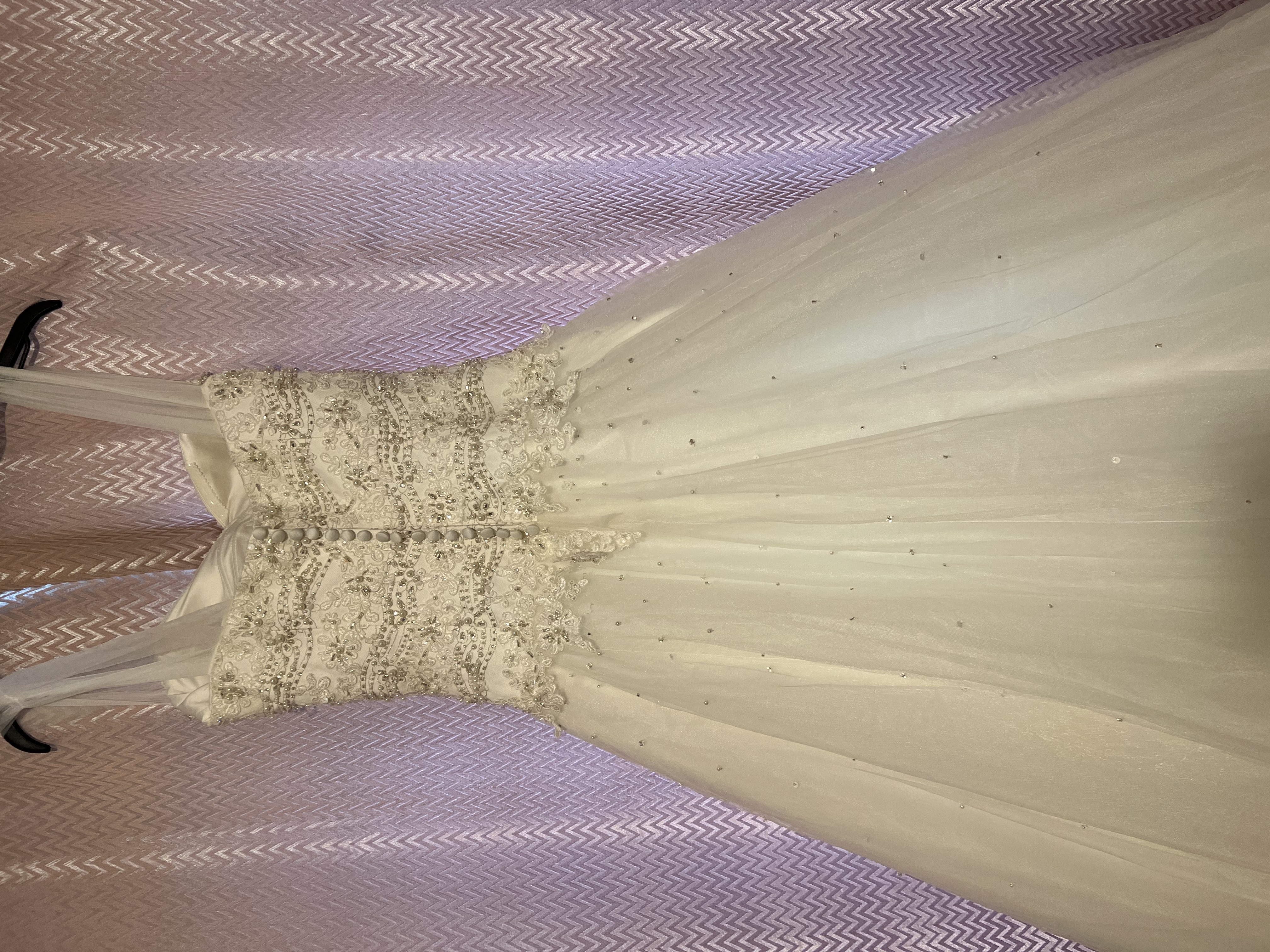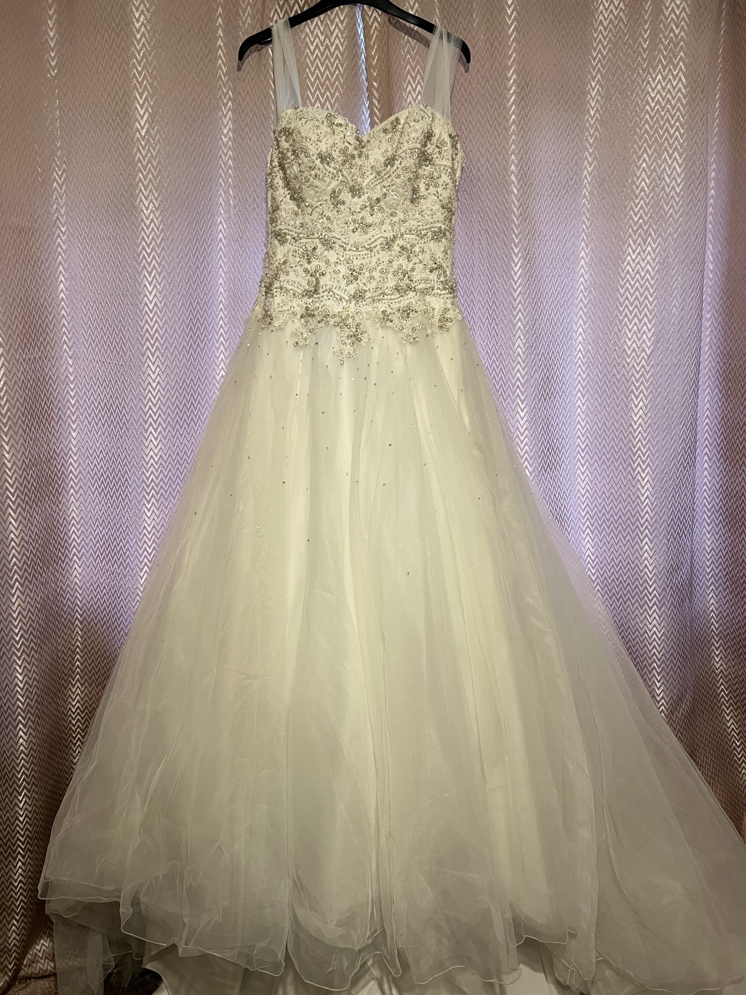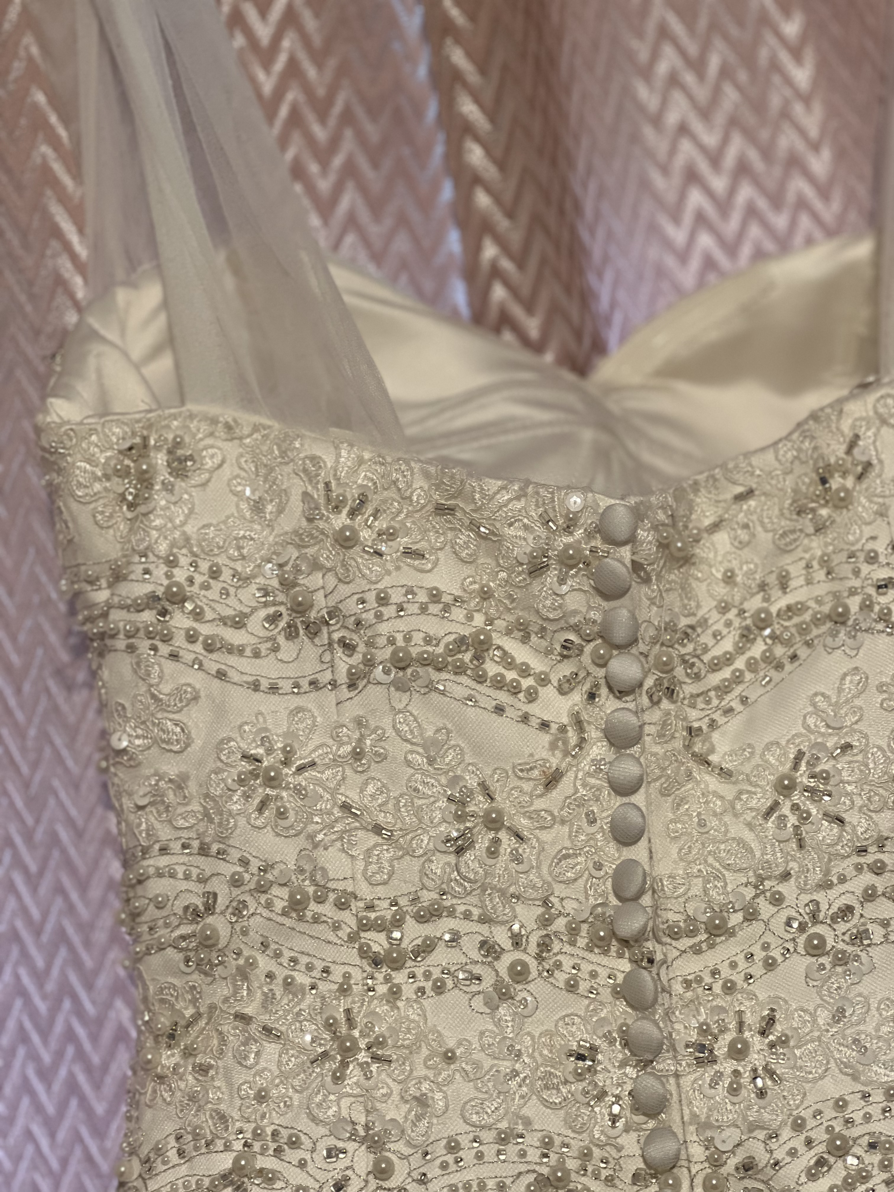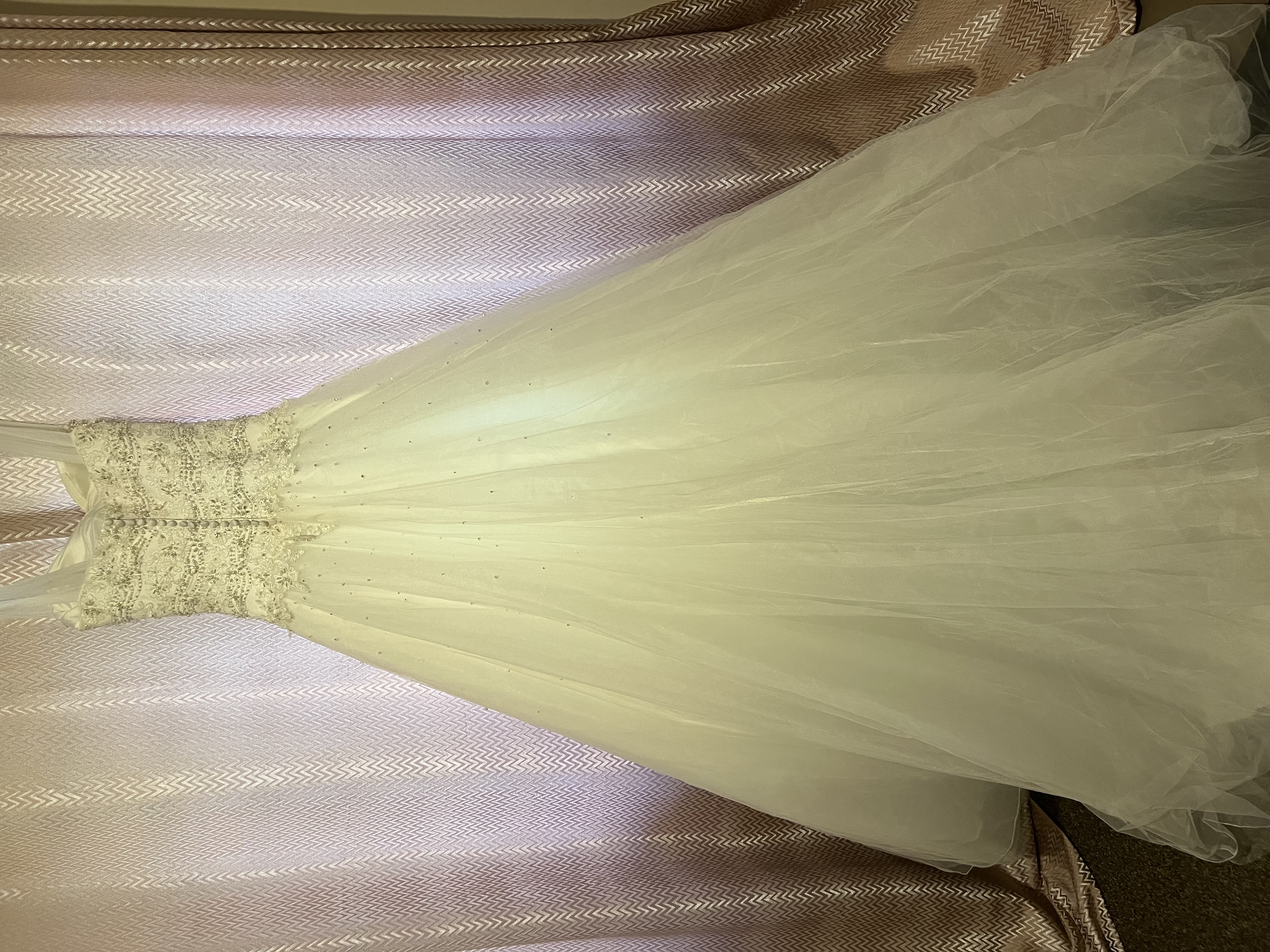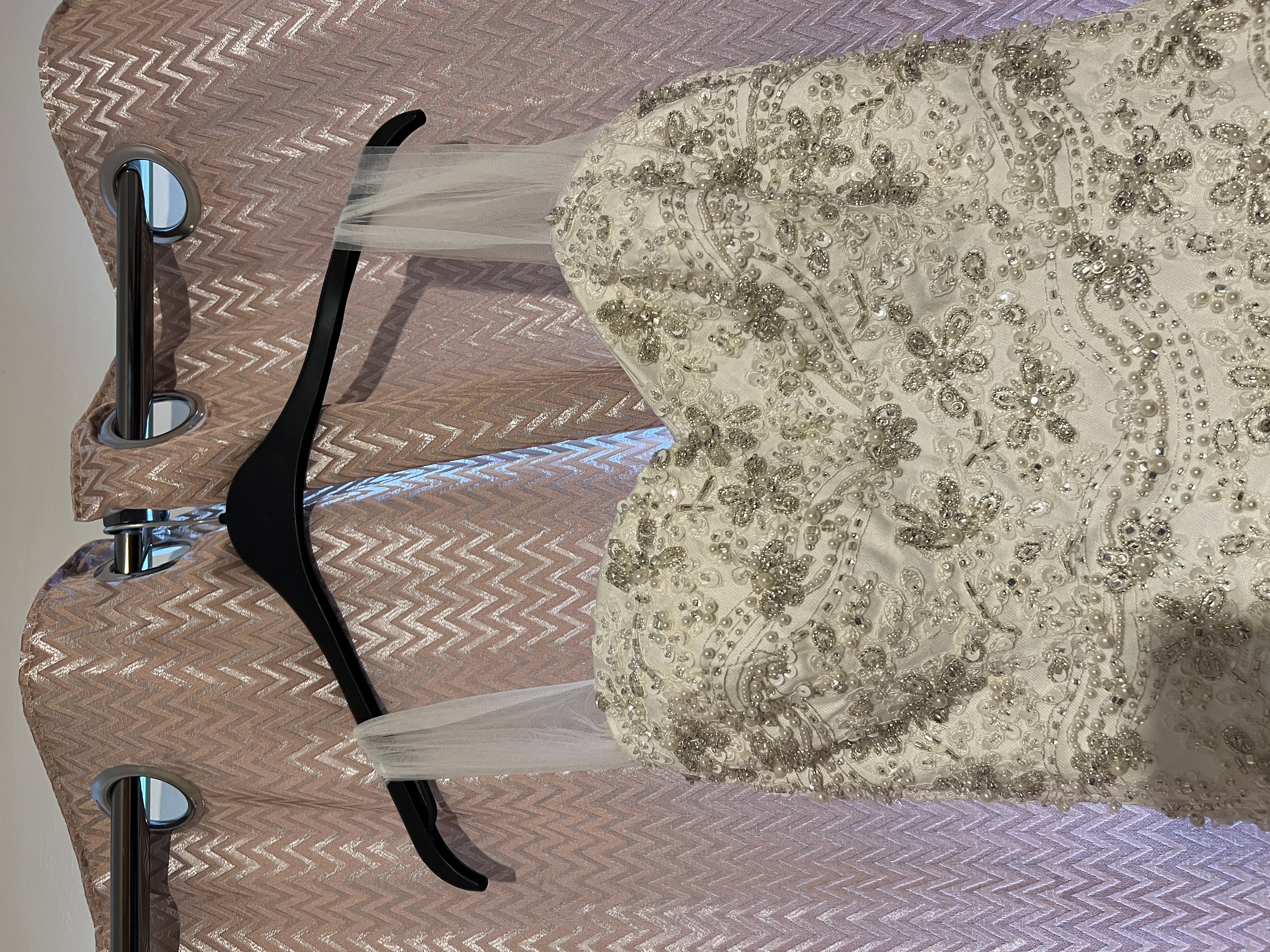Wedding dress, colour originally a bit off white, strapless . Can wear with attached straps or remove them to put them up or down etc. Has some beautiful beads on bodice and a back design to die for. Overally perfect fit for tall and petite women