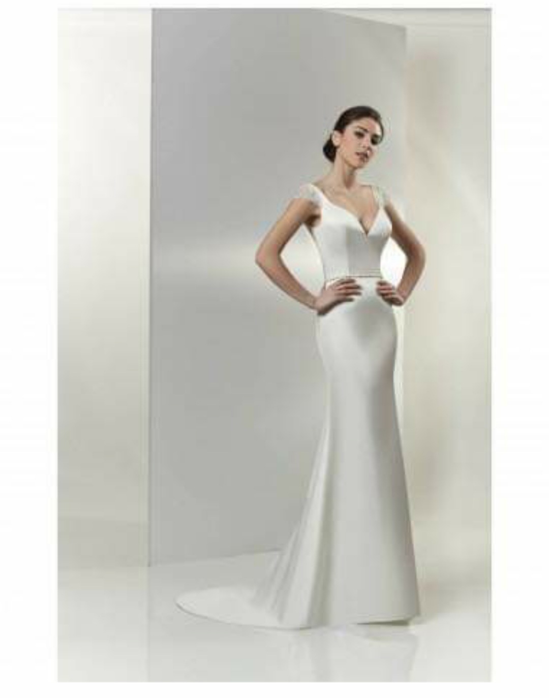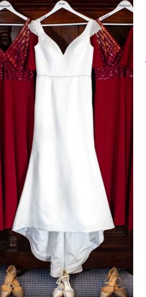Selling a Venus wedding dress in immaculate condition. Professionally dry cleaned and ready to wear. An ivory satin sheath style wedding dress with sweat heart neckline with diamante on both sleeves and belt on dress. It’s elegant, very comfortable and extremely flattering on.