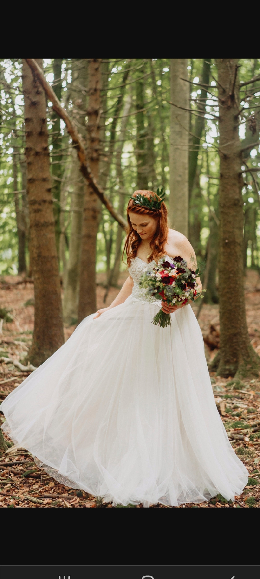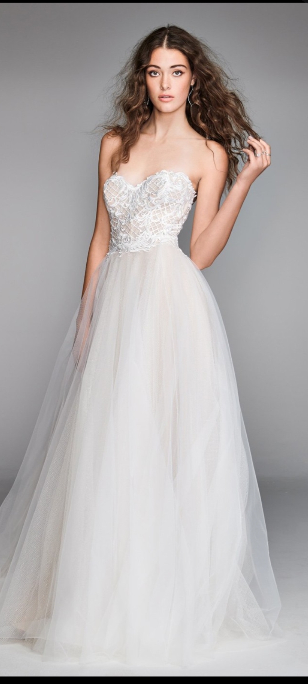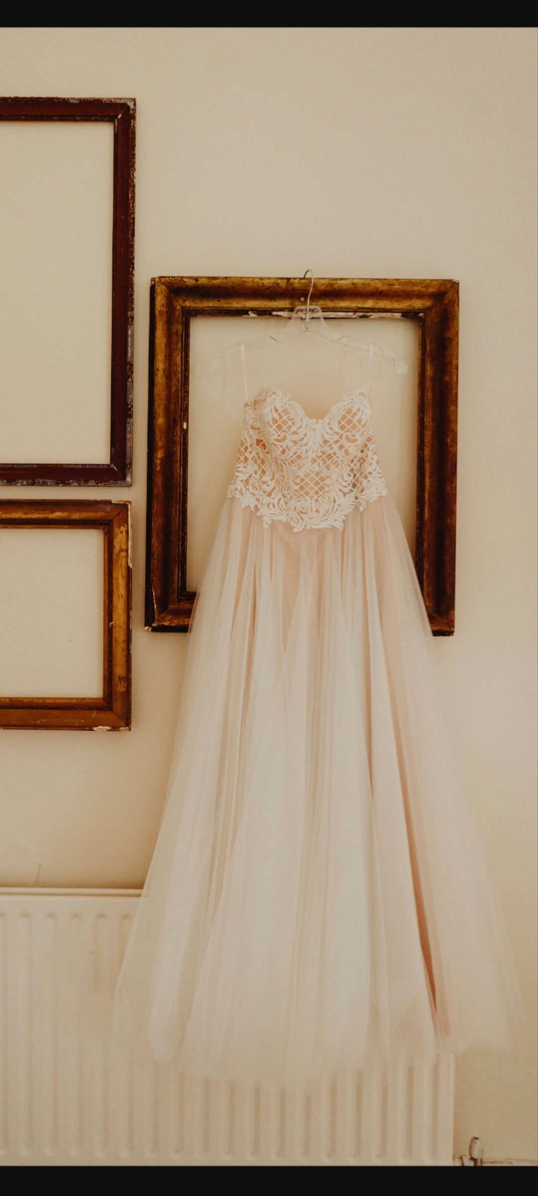 A-line bridal gown features an embroidered bodice over a soft tulle skirt, with a strapless sweetheart neckline. An invisible zipper closure lies on the curved semi-open back. Purchased in Memories Bridal Boutique Dublin. Ivory & Blush.