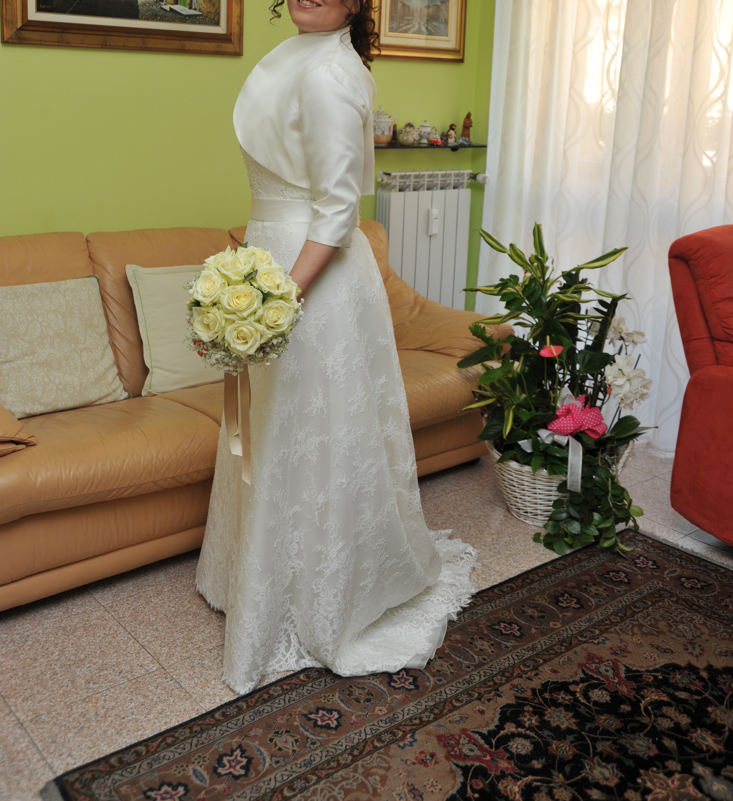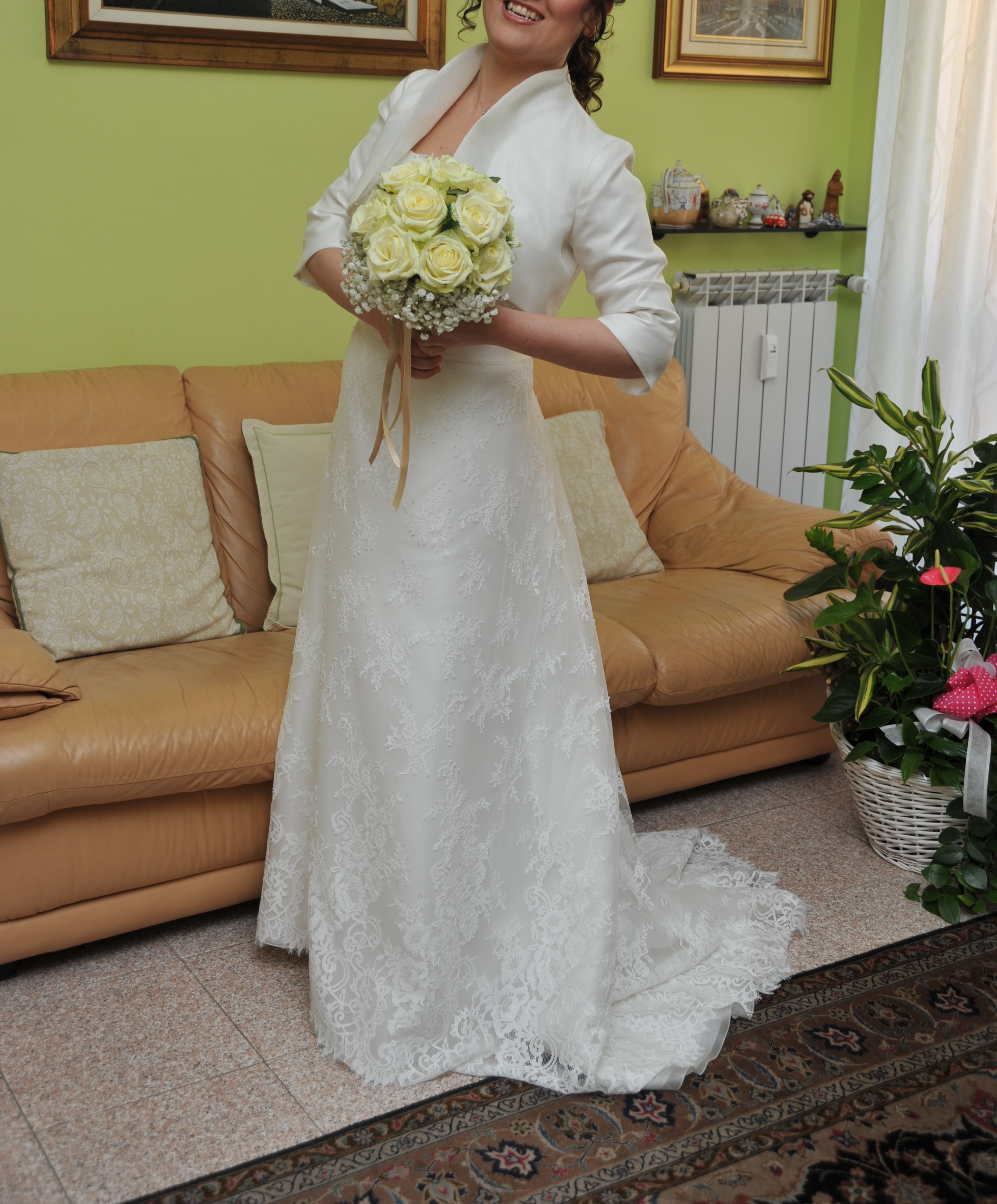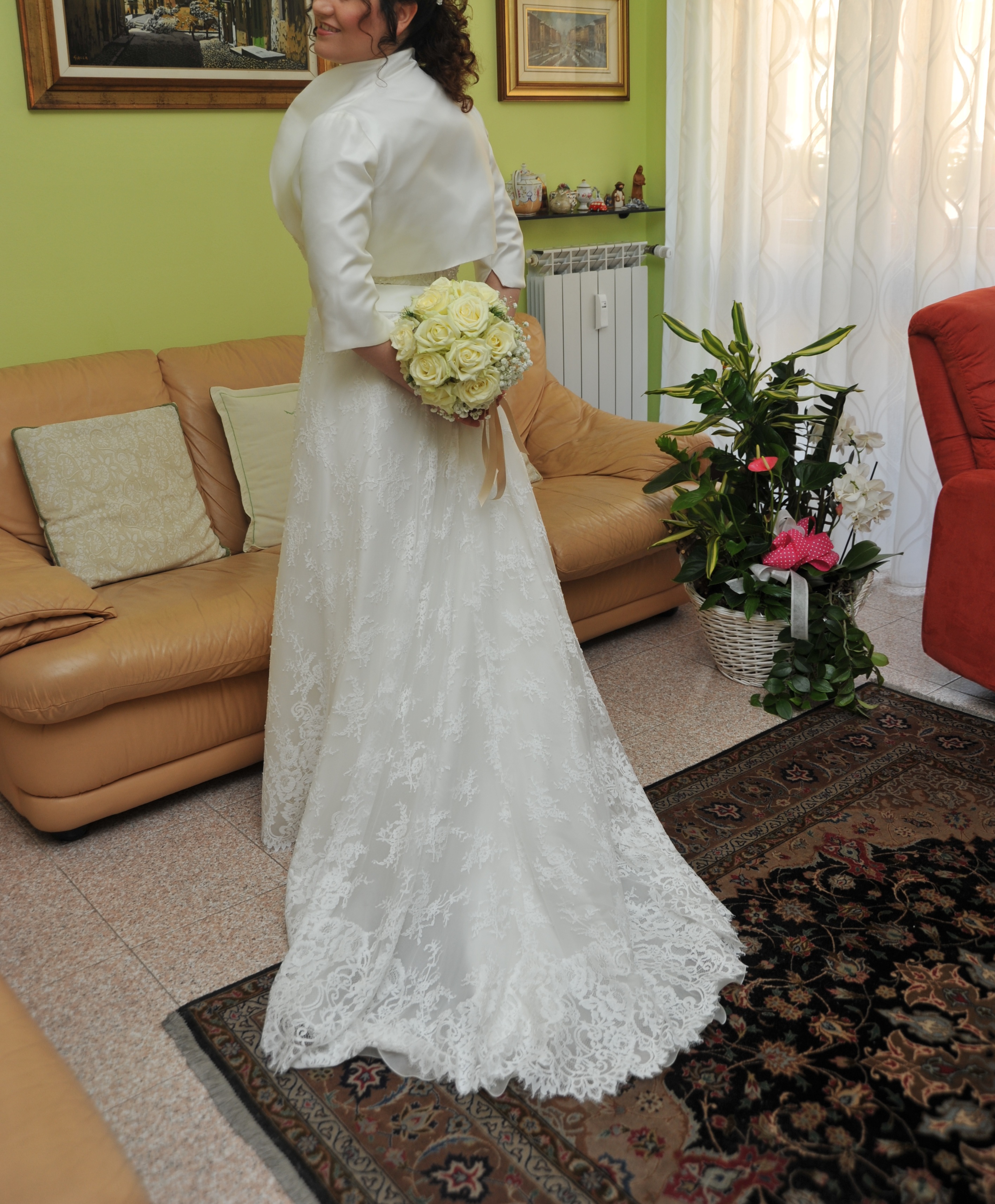 Il dietro dell’abito è arricchito con uno strascico in tulle e pizzo che dona un tocco di romanticismo. Molto comodo da indossare e portare.