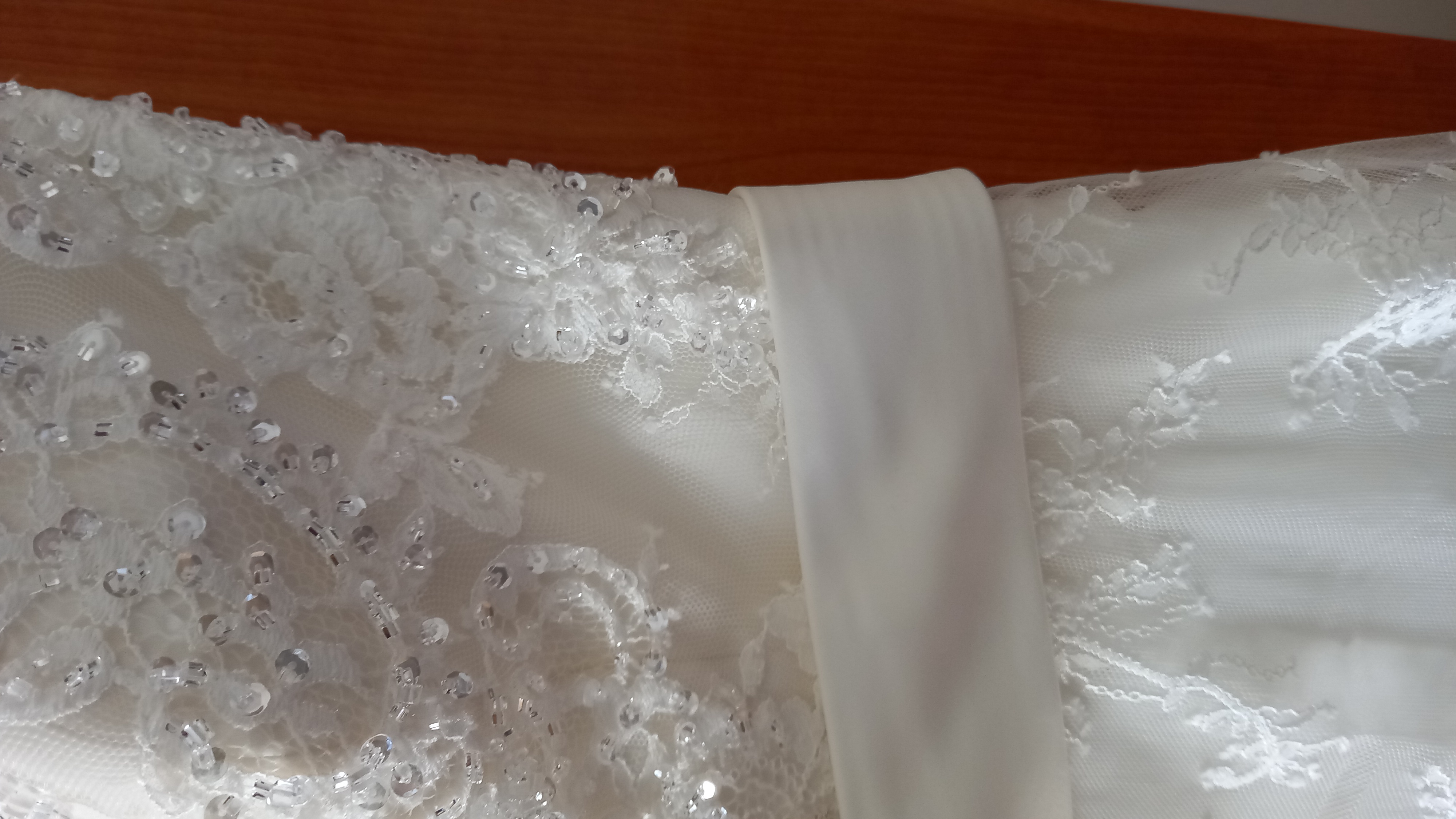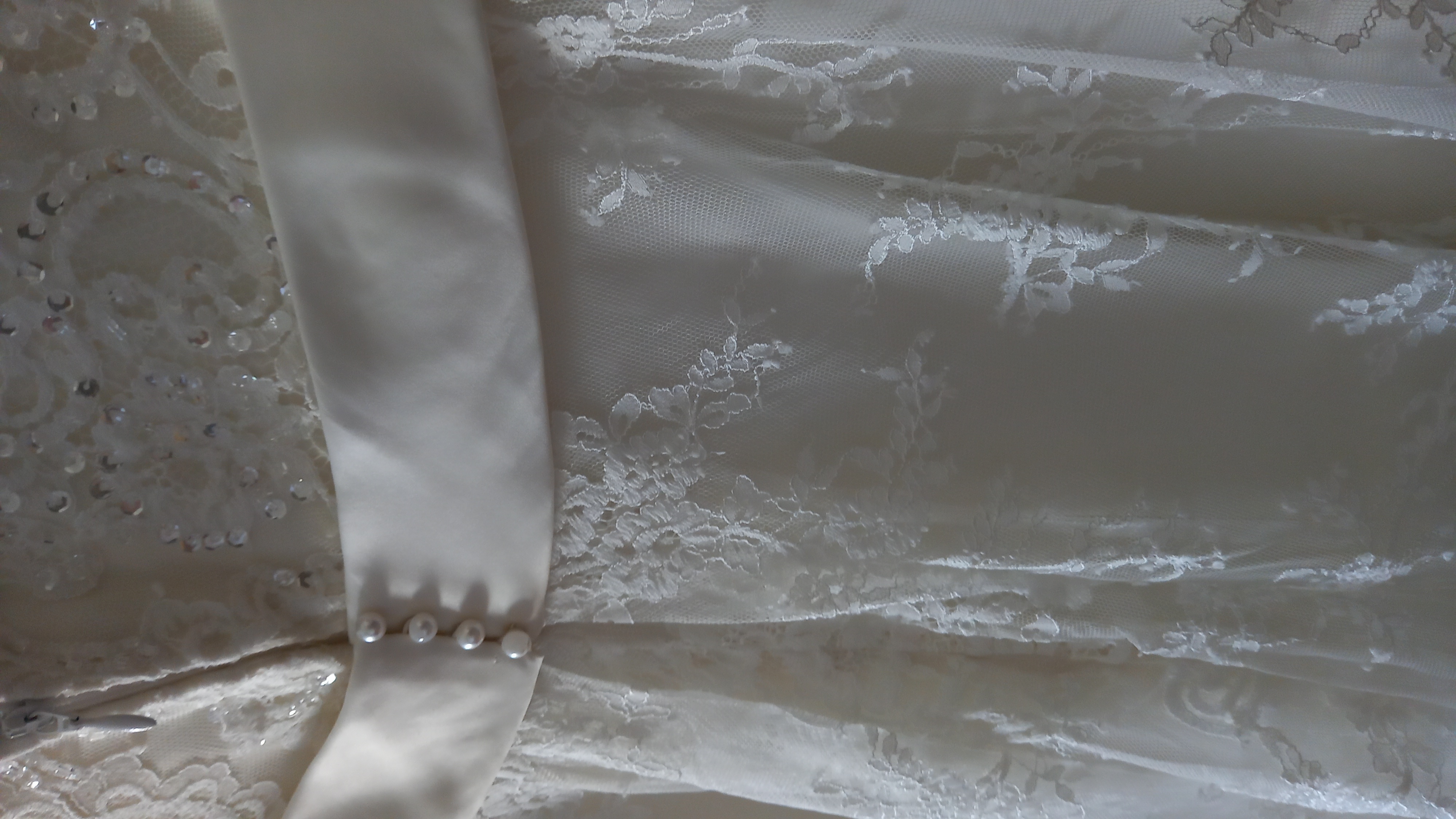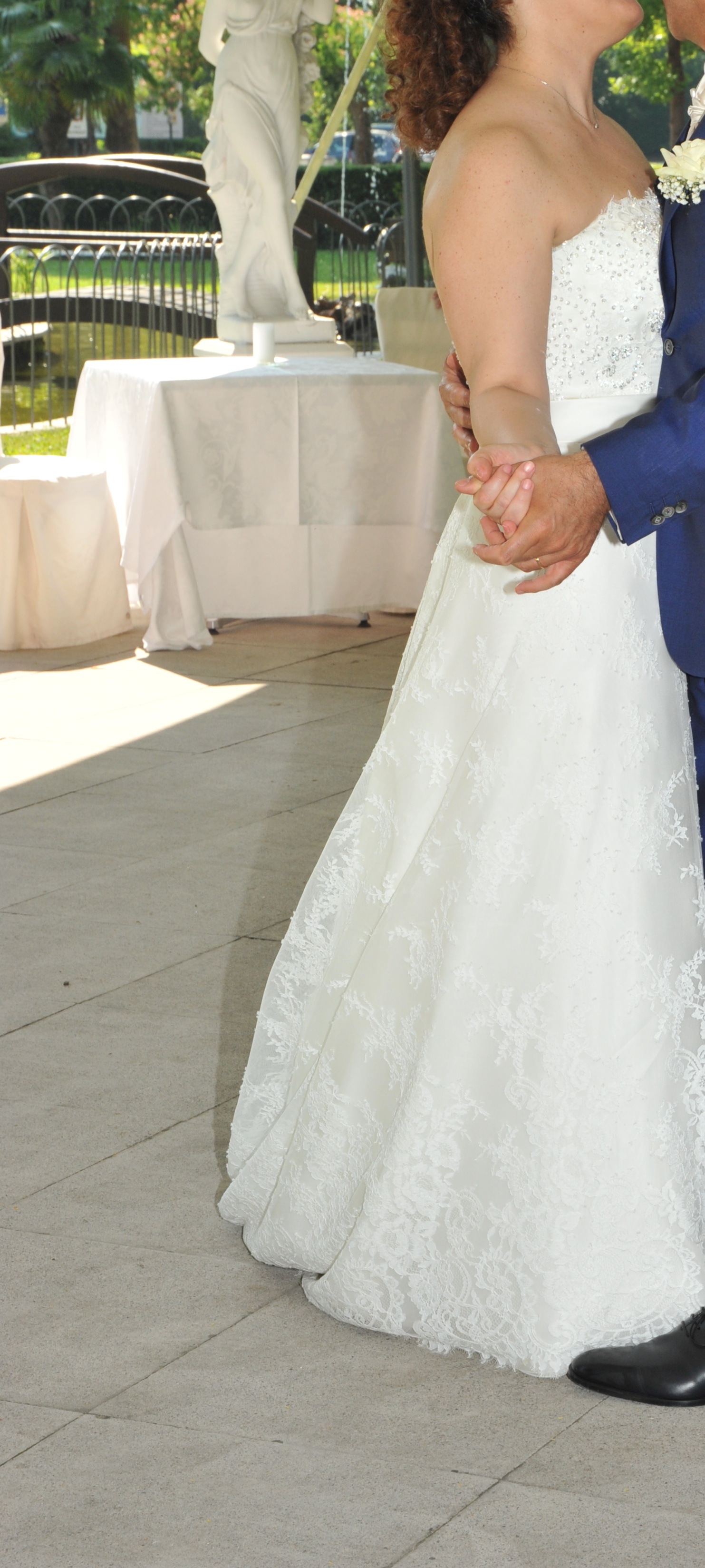 Il dietro dell’abito è arricchito con uno strascico in tulle e pizzo che dona un tocco di romanticismo. Molto comodo da indossare e portare.