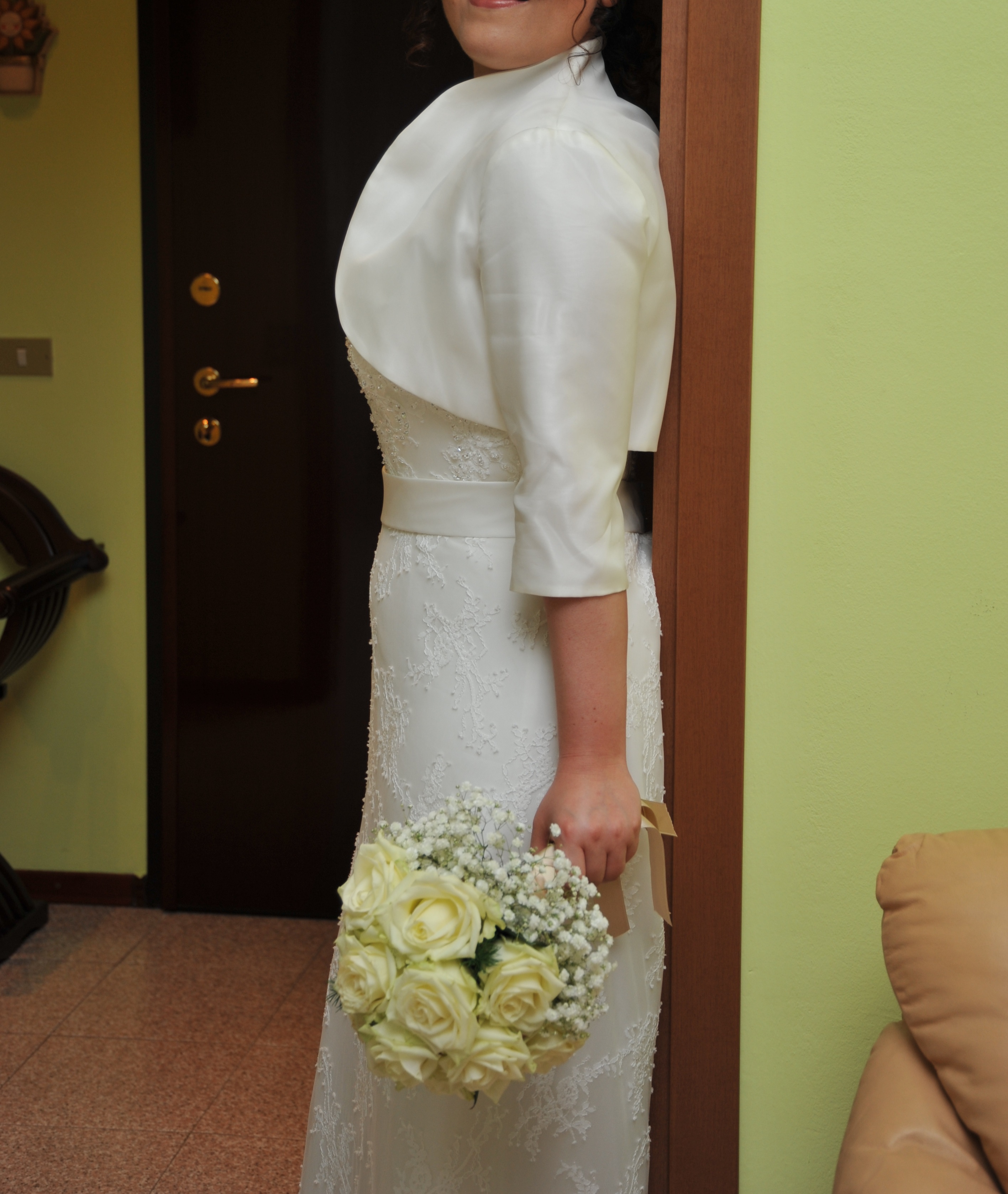 L’abito bianco, a pizzo e punti luce, è stato creato su misura in sartoria nel 2015.