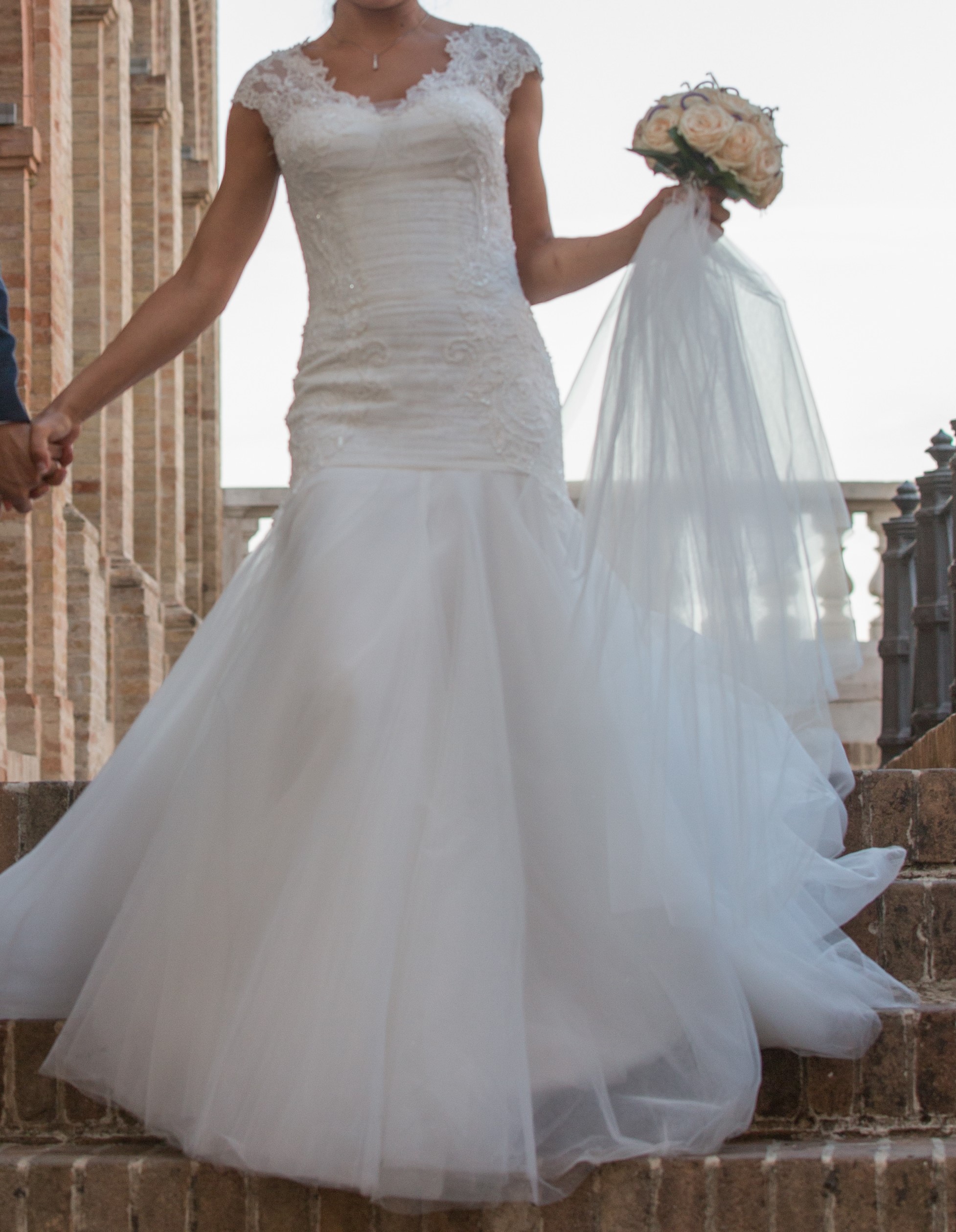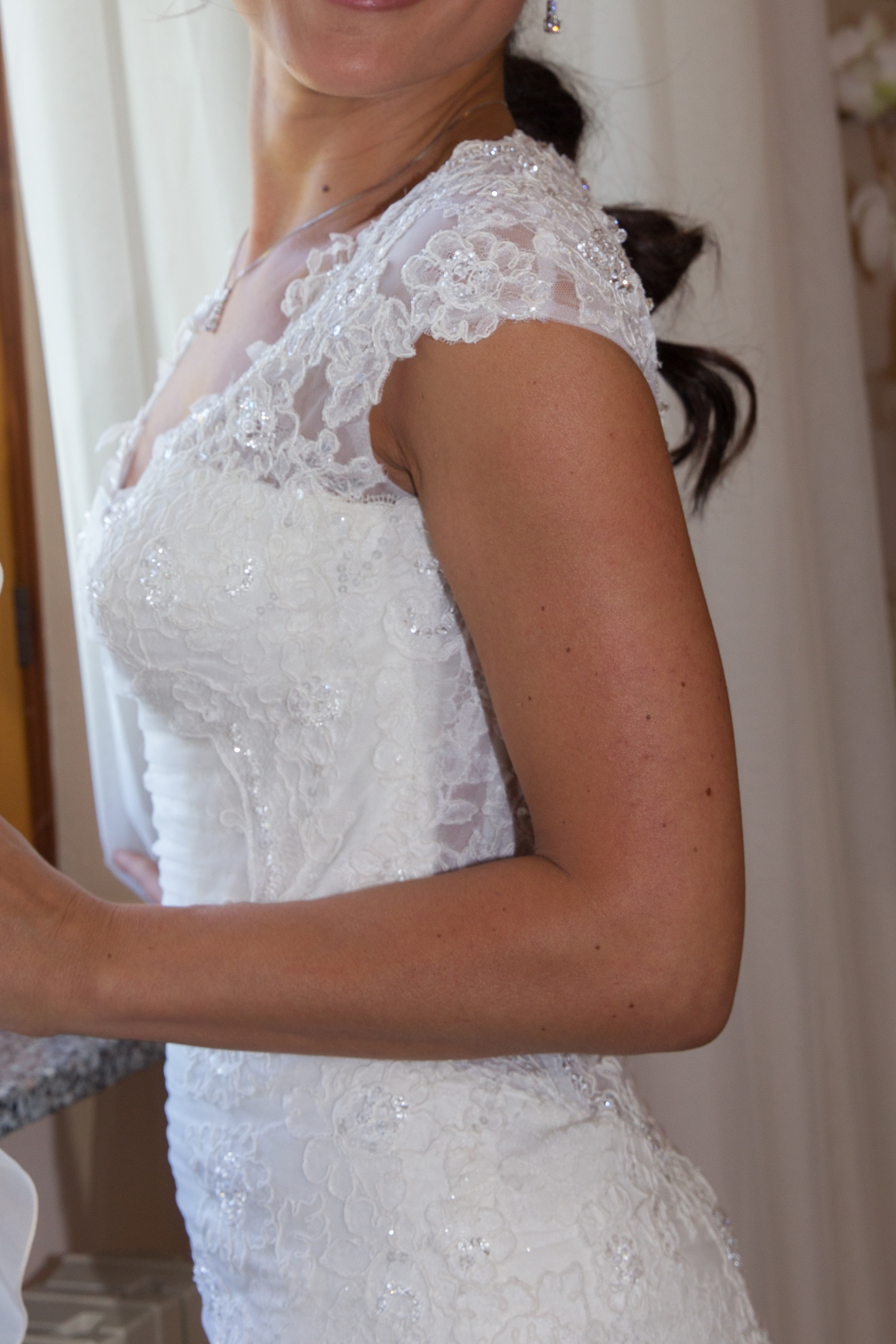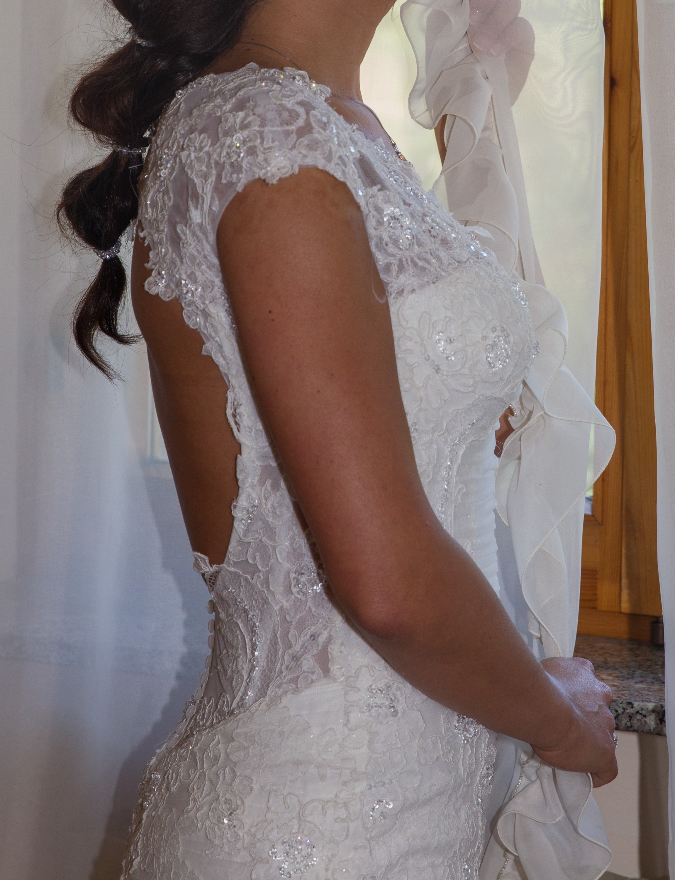 Abito della collezione Delsa Couture 2015 indossato una sola volta e ben tenuto; ritoccato ed arricchito rispetto al modello originale con copertura delle spalle. In seta e pizzo rebrodato, ricco di perle e swarovsky, con coda lunga. Abbinato con velo corto in tulle compreso nel prezzo. Pagato oltre € 4000. Vendo per motivi di spazio.