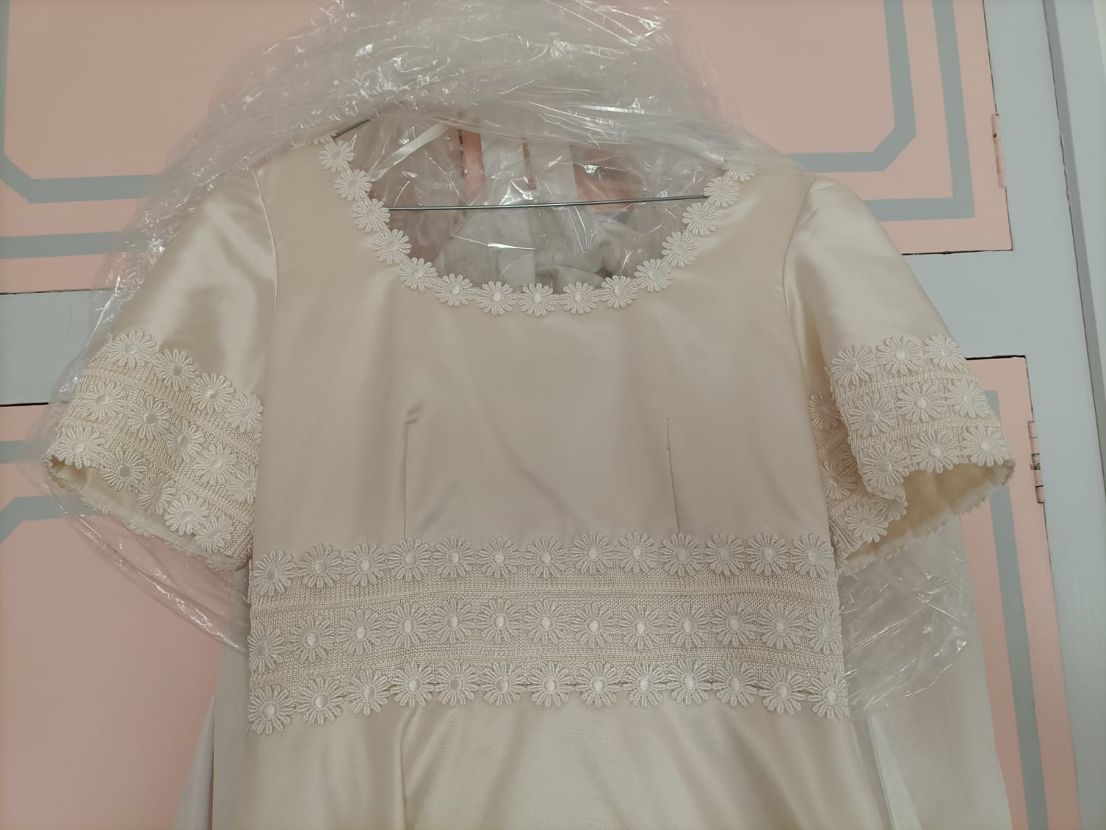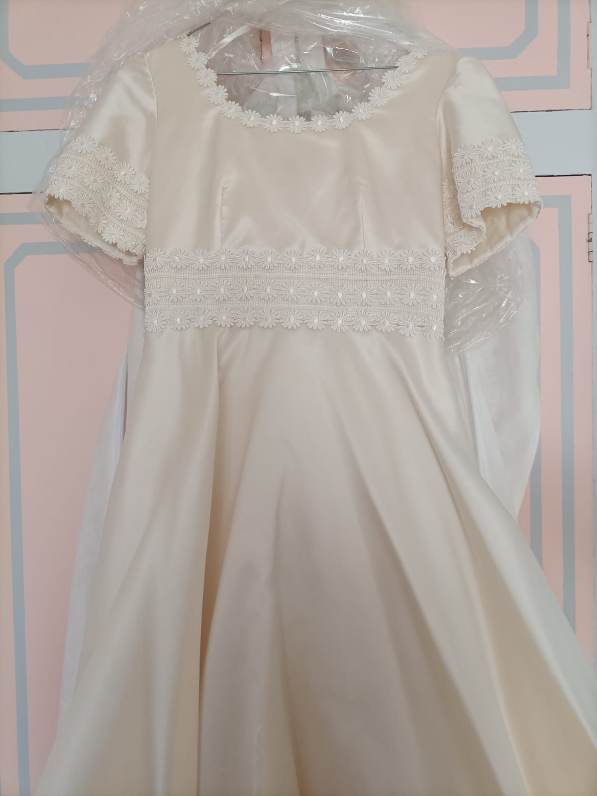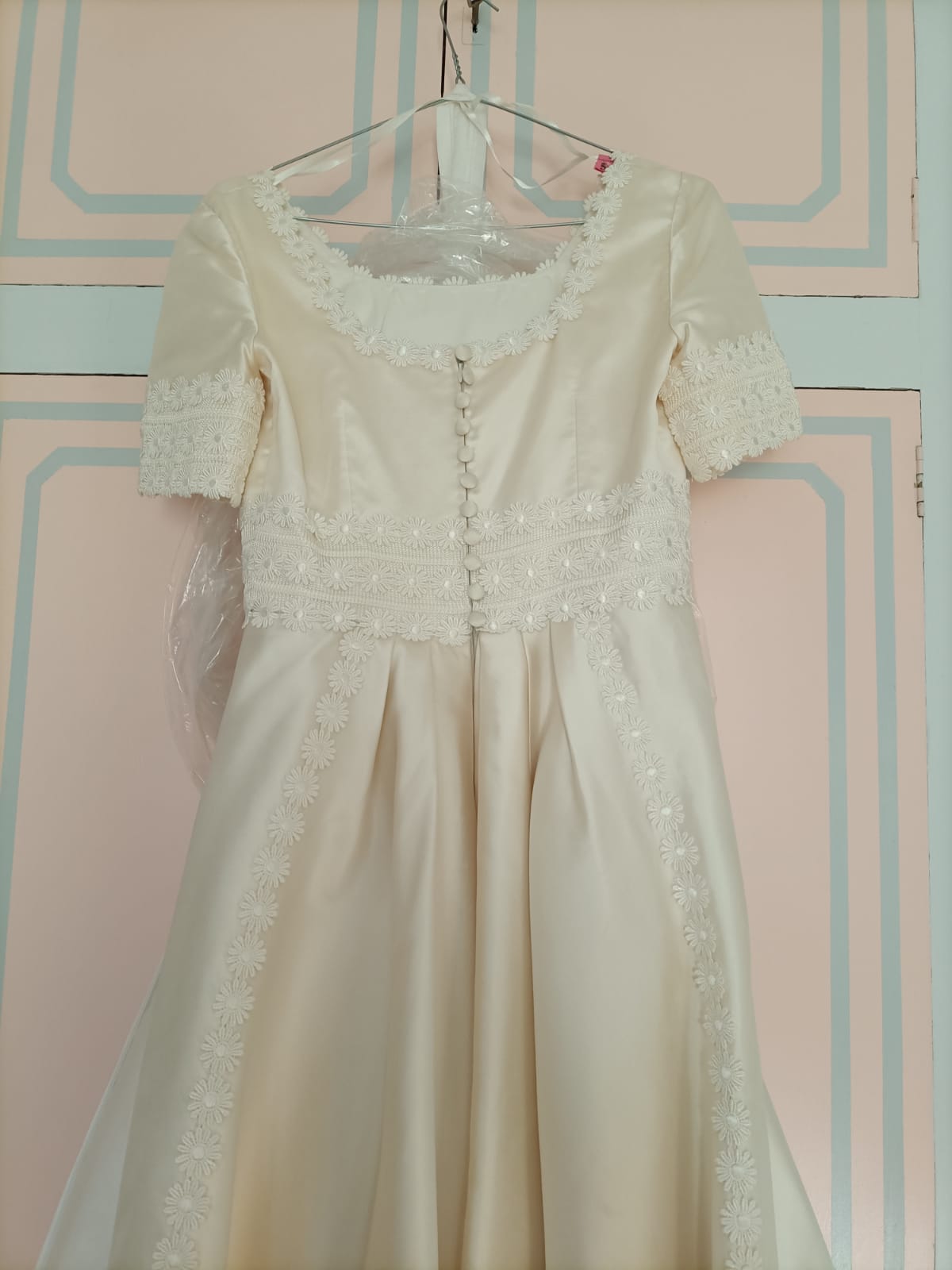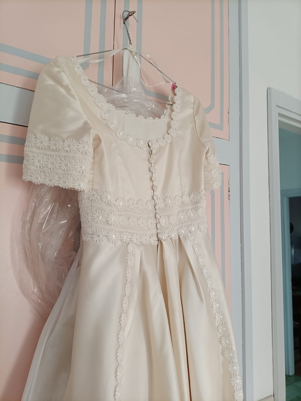 Abito da sposa, in seta mikado, color avorio con decorazioni di margherite sullo scollo e lungo il vestito.
