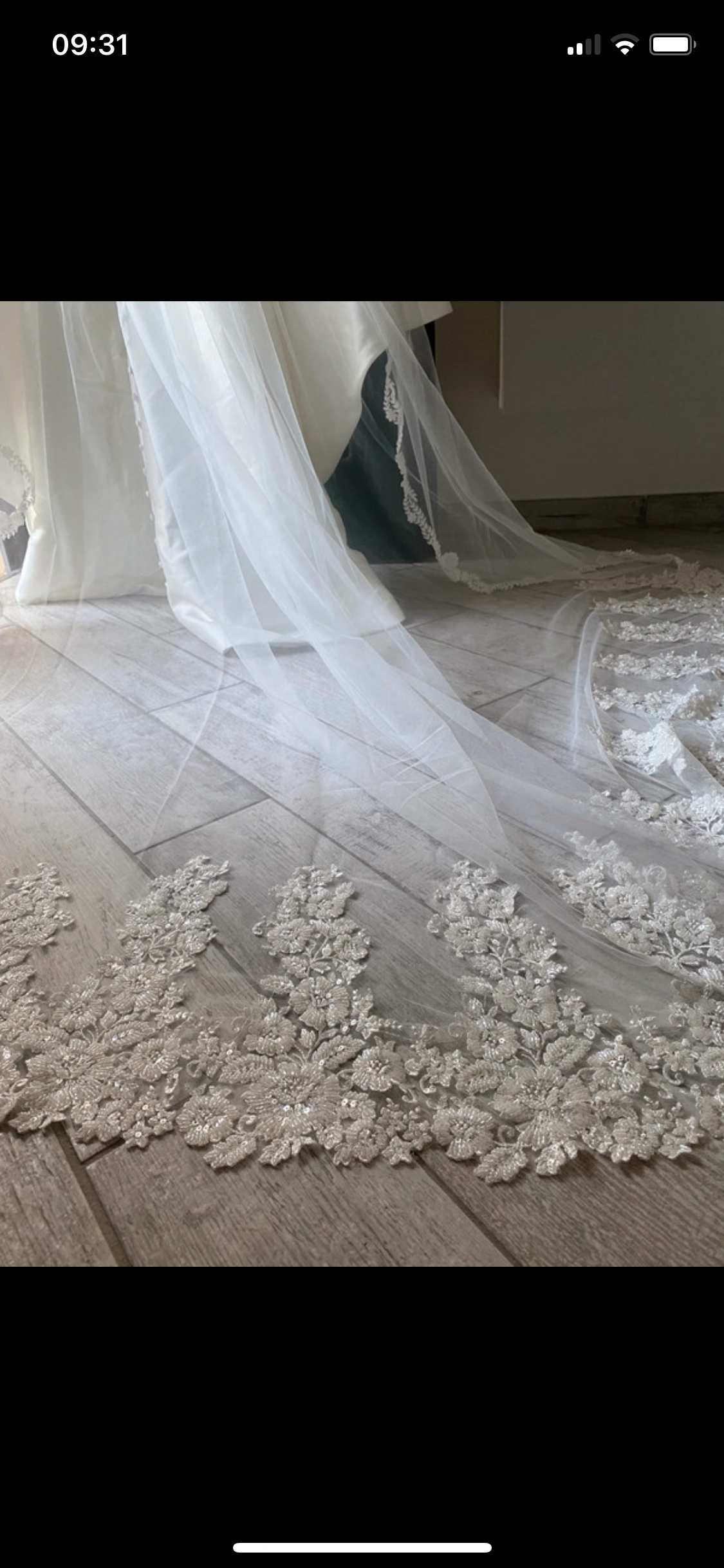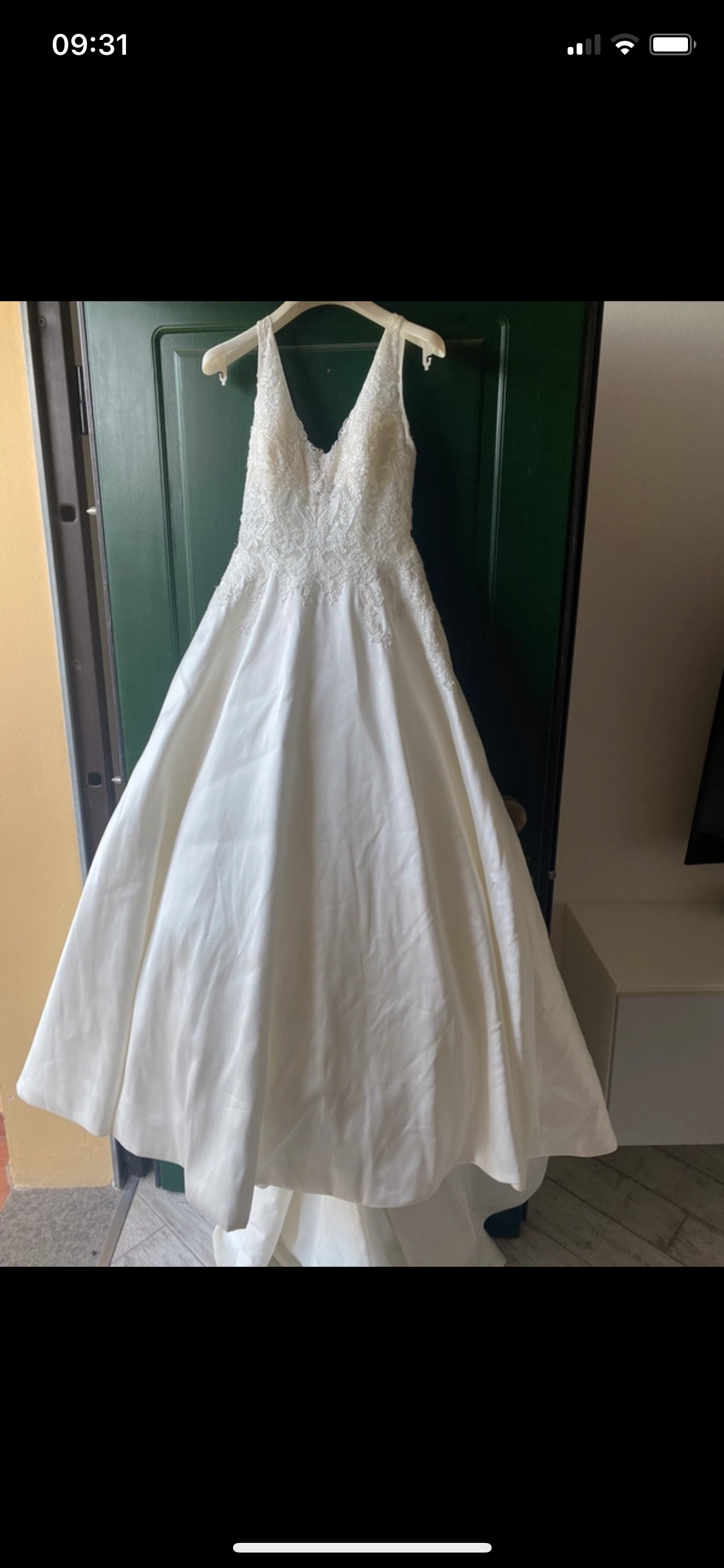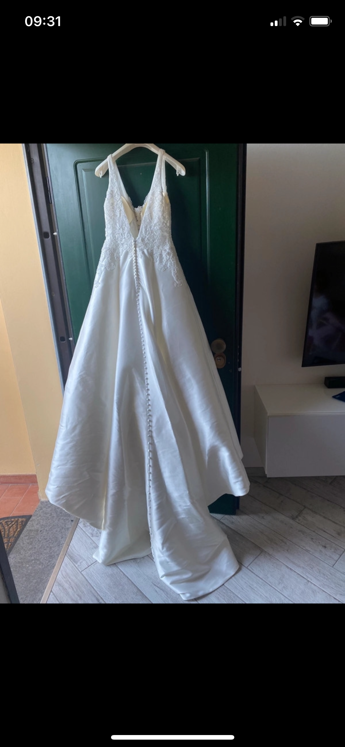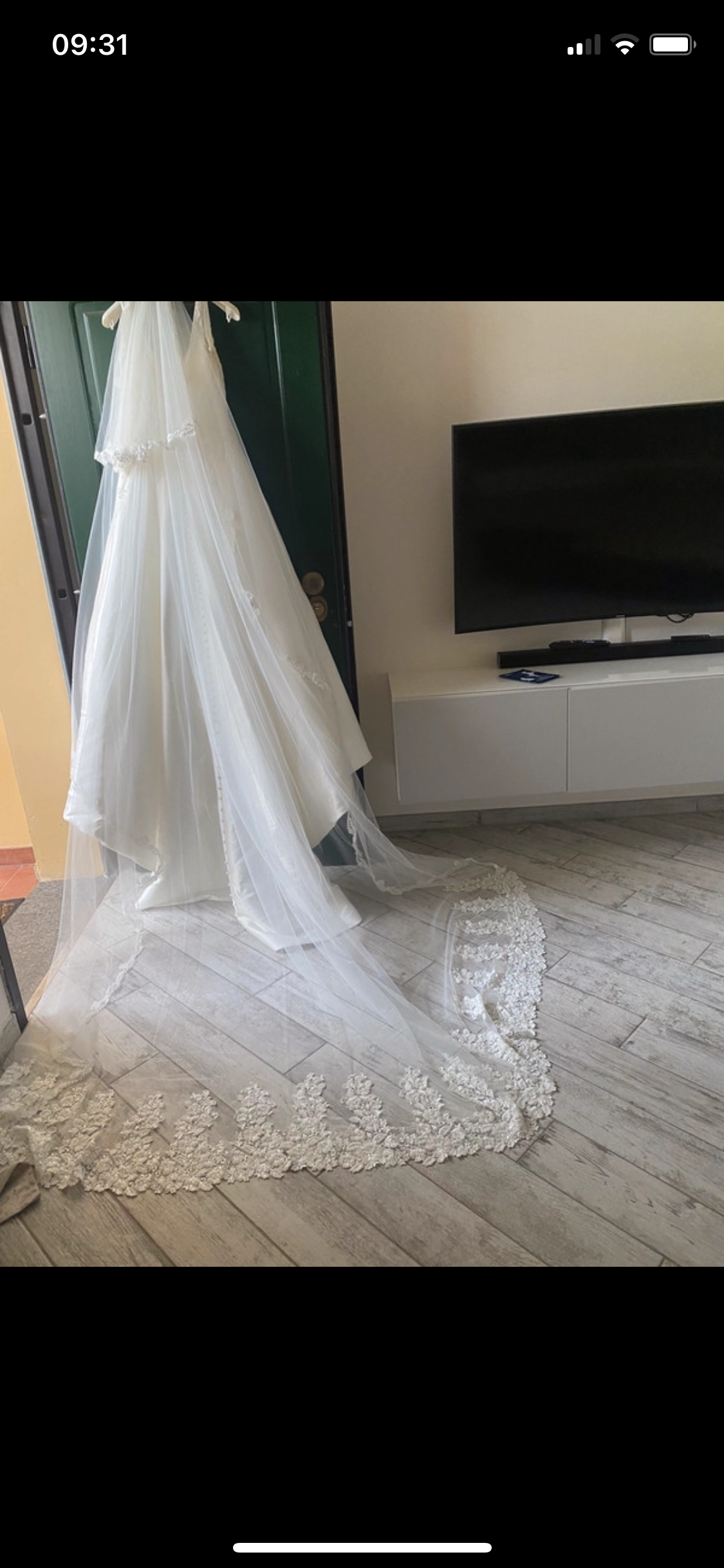 Vendo abito da sposa modello principessa con corpetto prezioso scollo a V e schiena scoperta accompagnata da piccoli bottoncini e gonna ampia compreso di velo ricamato.